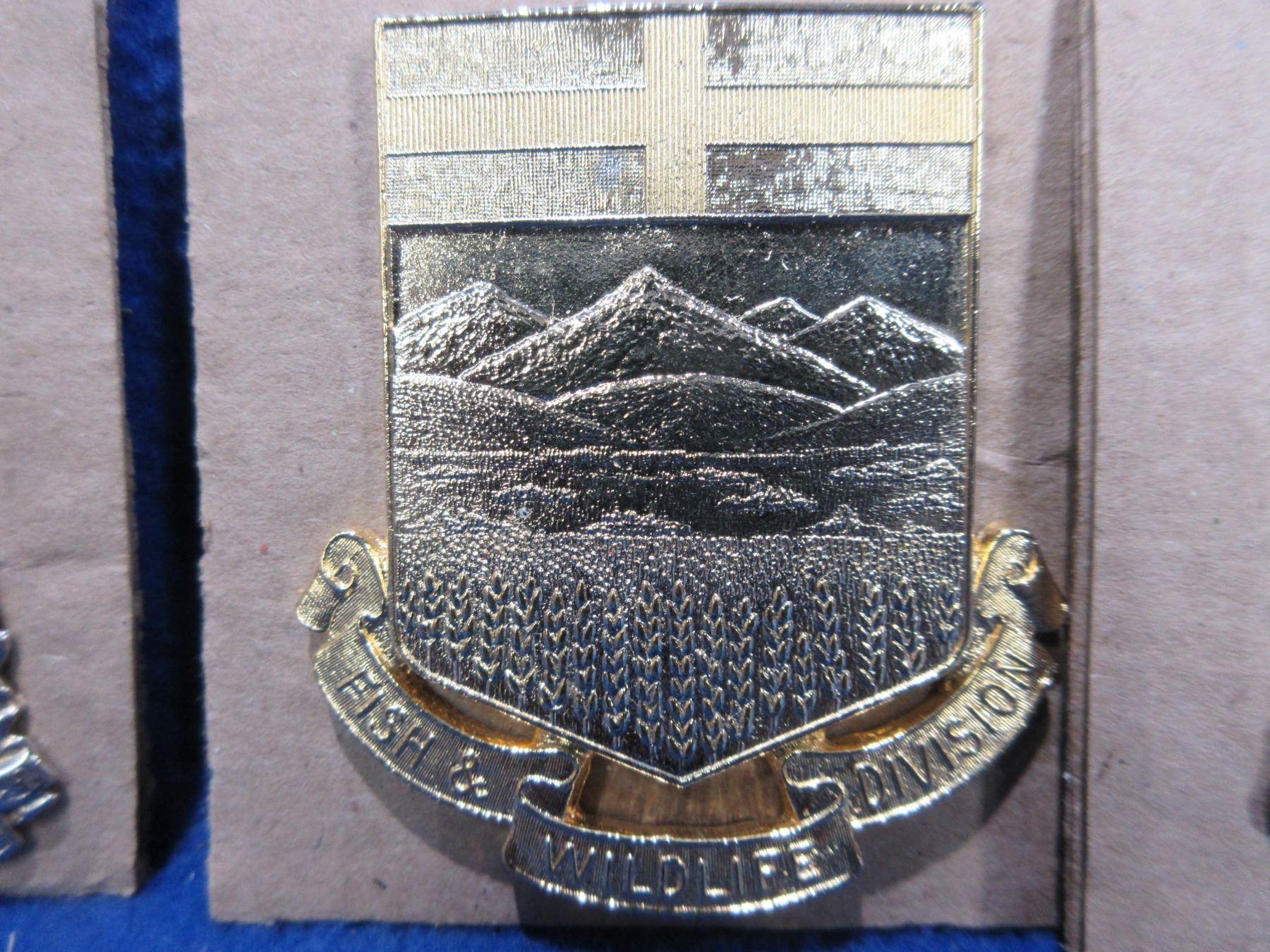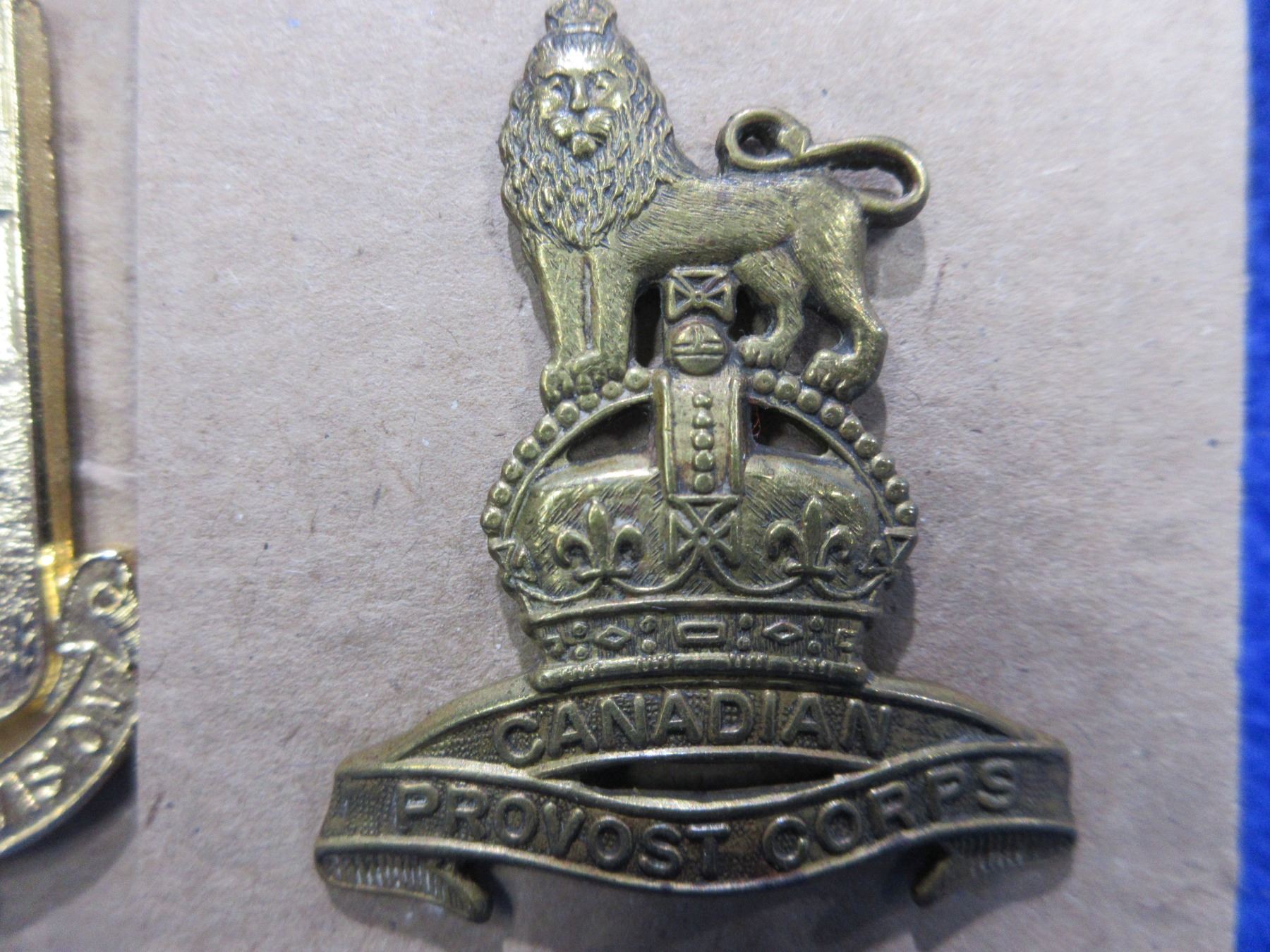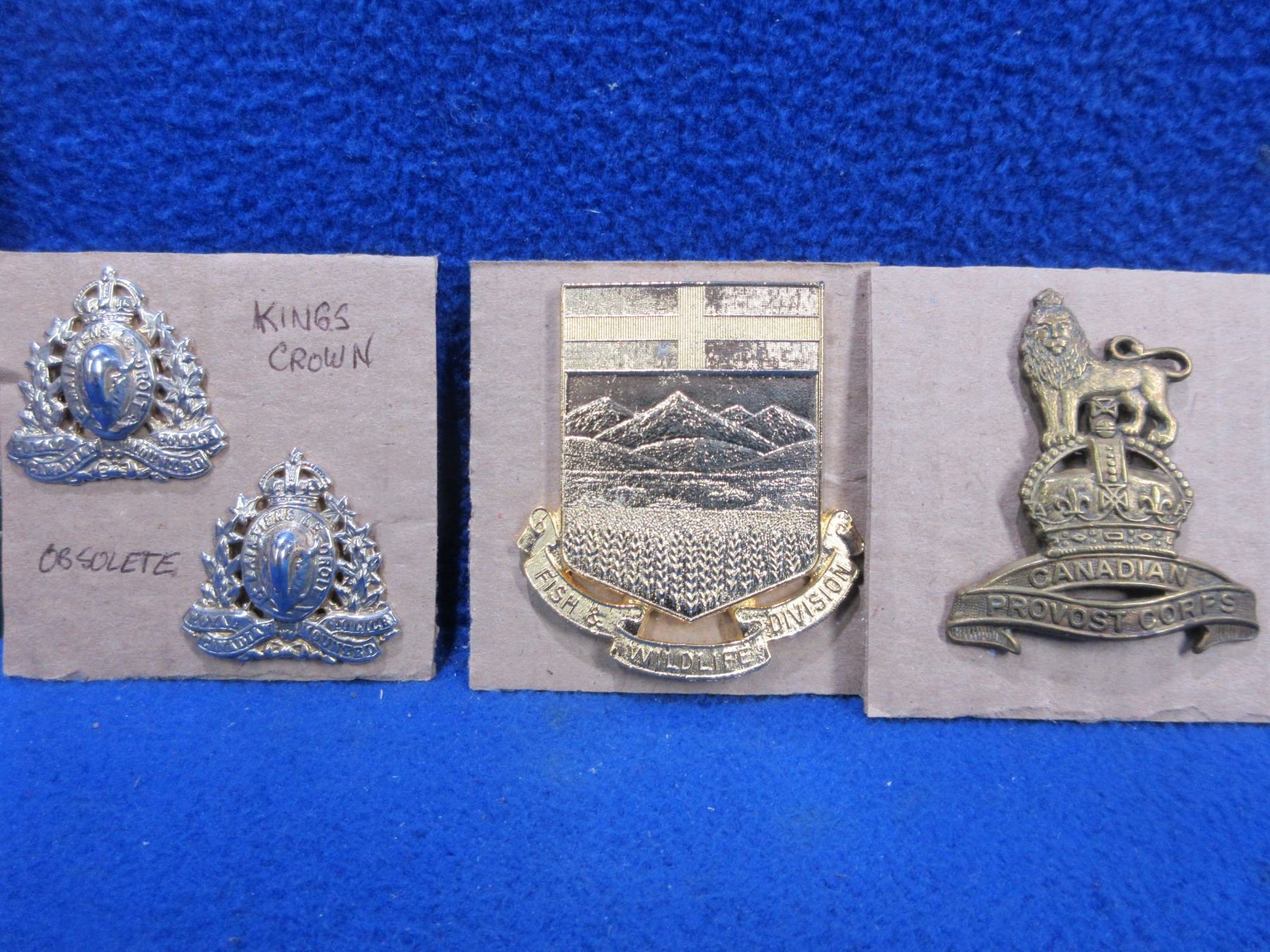 Lot 1024 Provost Corps Cap Badge, 2 RCMP Collar Badges, Alberta Fish & Wildlife Badge