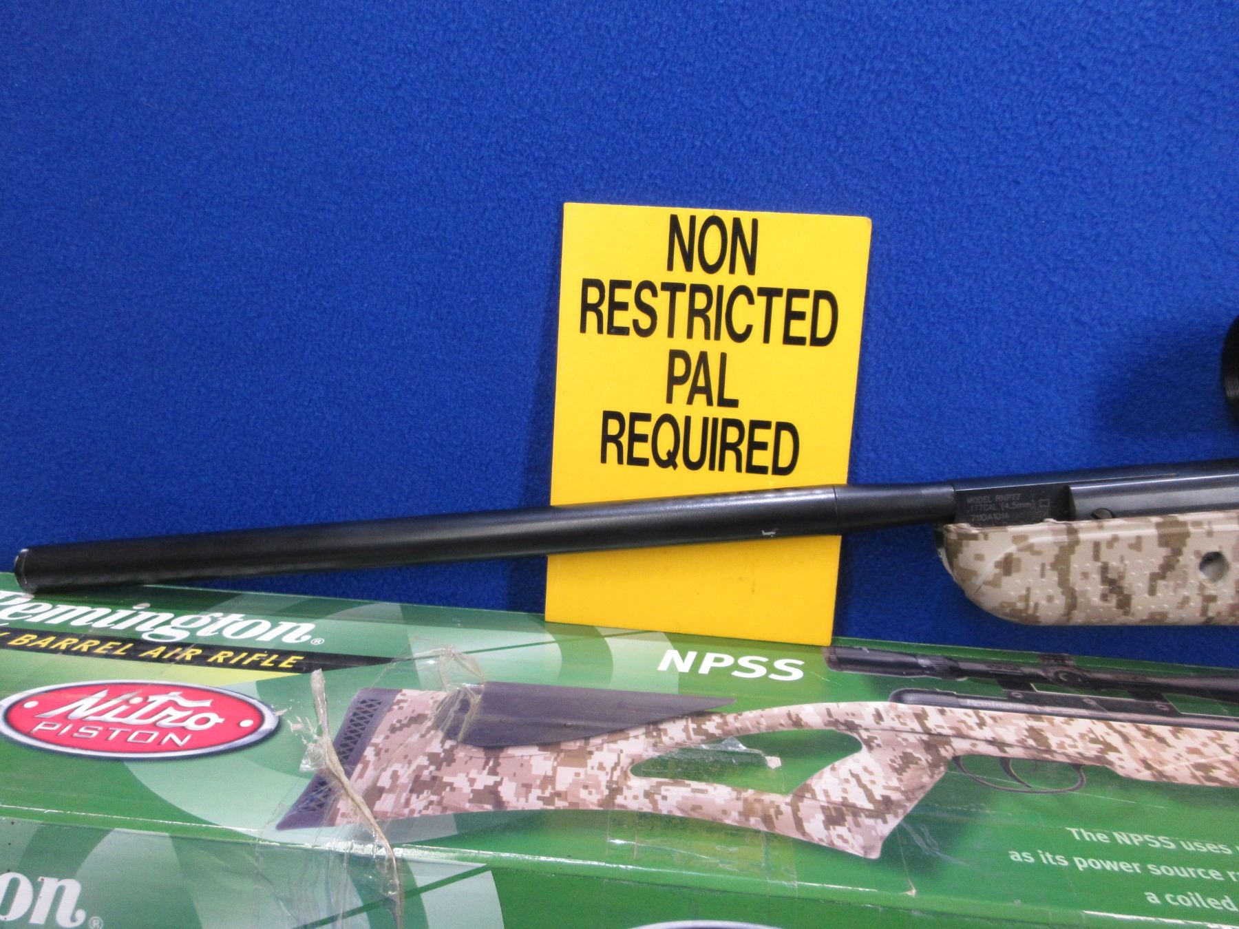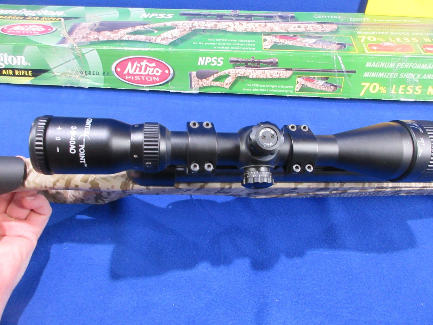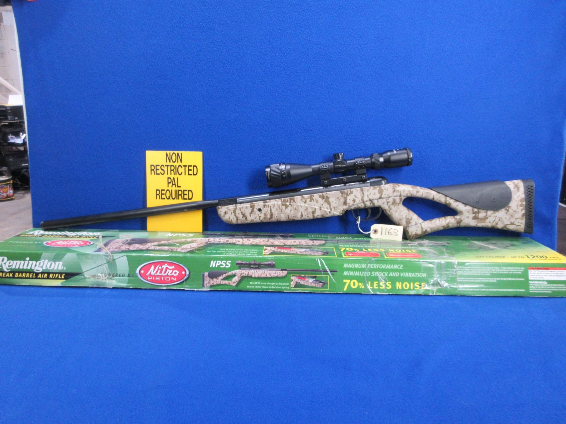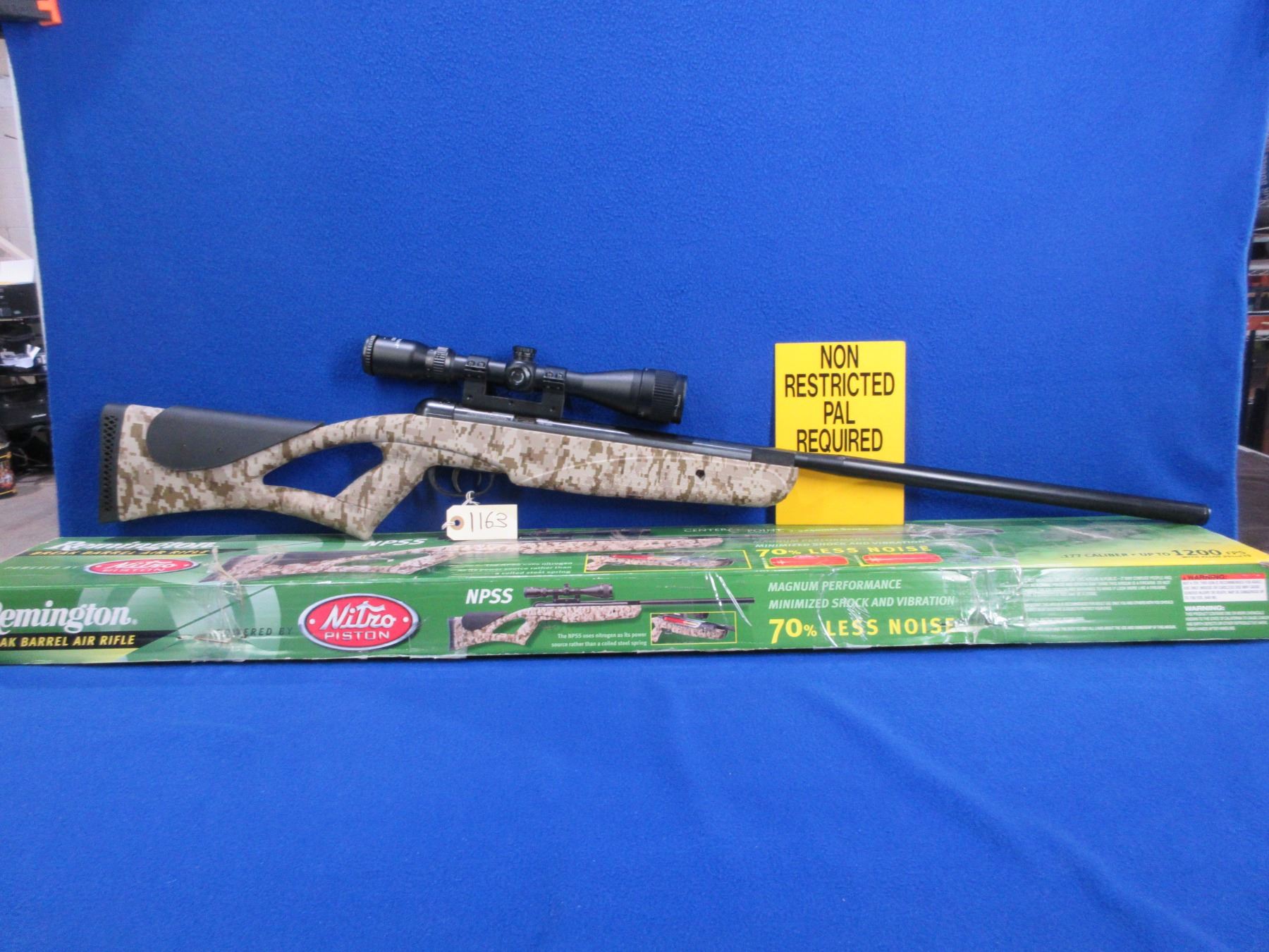 Non-Restricted - Remington NPSS Model RNP77 1200 FPS Air Rifle in .177 Cal. - This is a 1200 FPS break barrel action single shot air rifle, action appears to be in good to very good working order. Barrel is 19 3/4", rifling is good to very good, black finish is good with two scratches, has no sights but has CenterPoint 3-9x40AO scope - appears clear - MIL-Dot reticle, digital camo synthetic stock with adjustable cheek piece is good to very good, length of pull is 14 1/4", rubber recoil pad good, comes with original box and instruction manual. Ser # 711DA1014