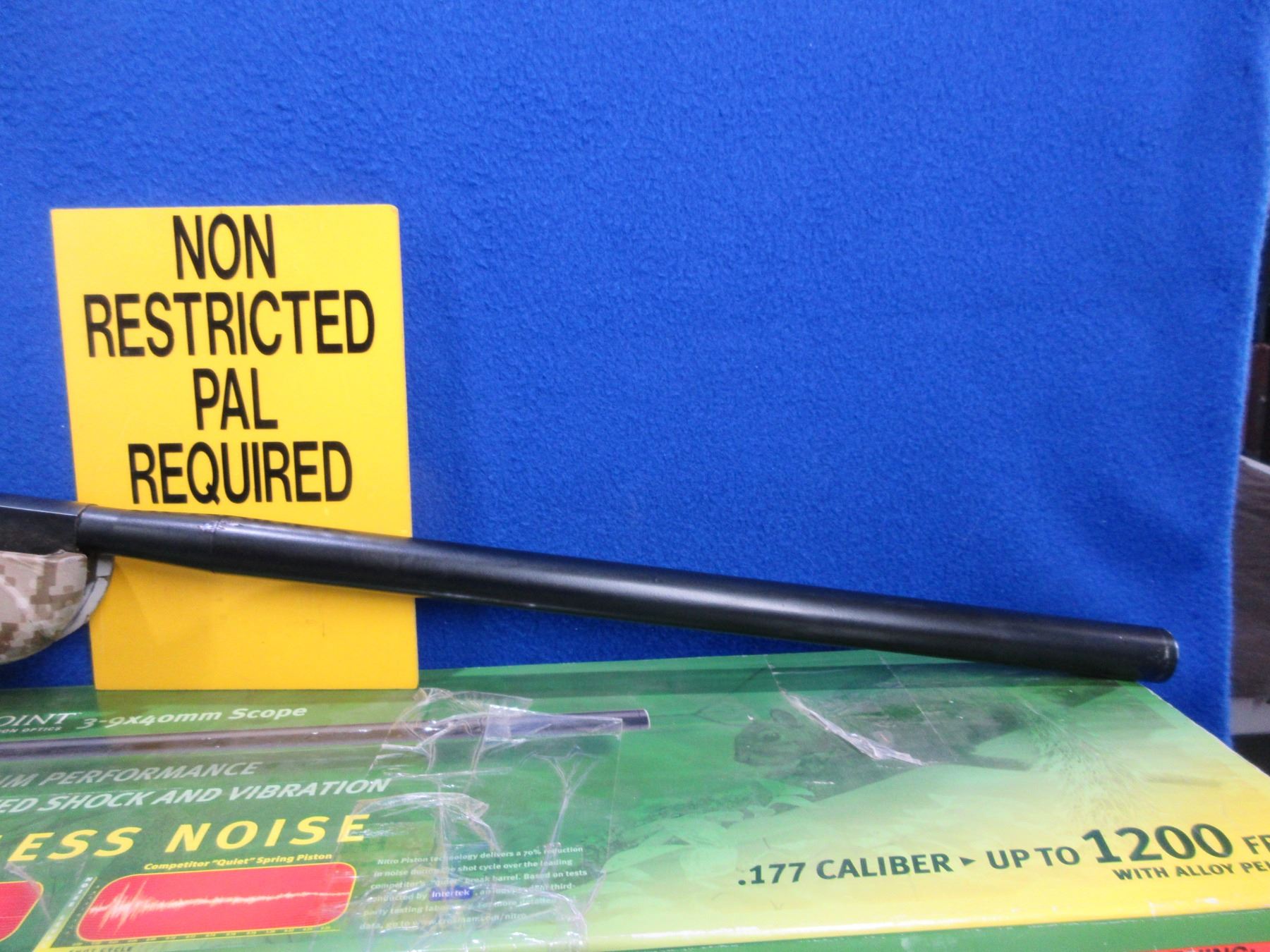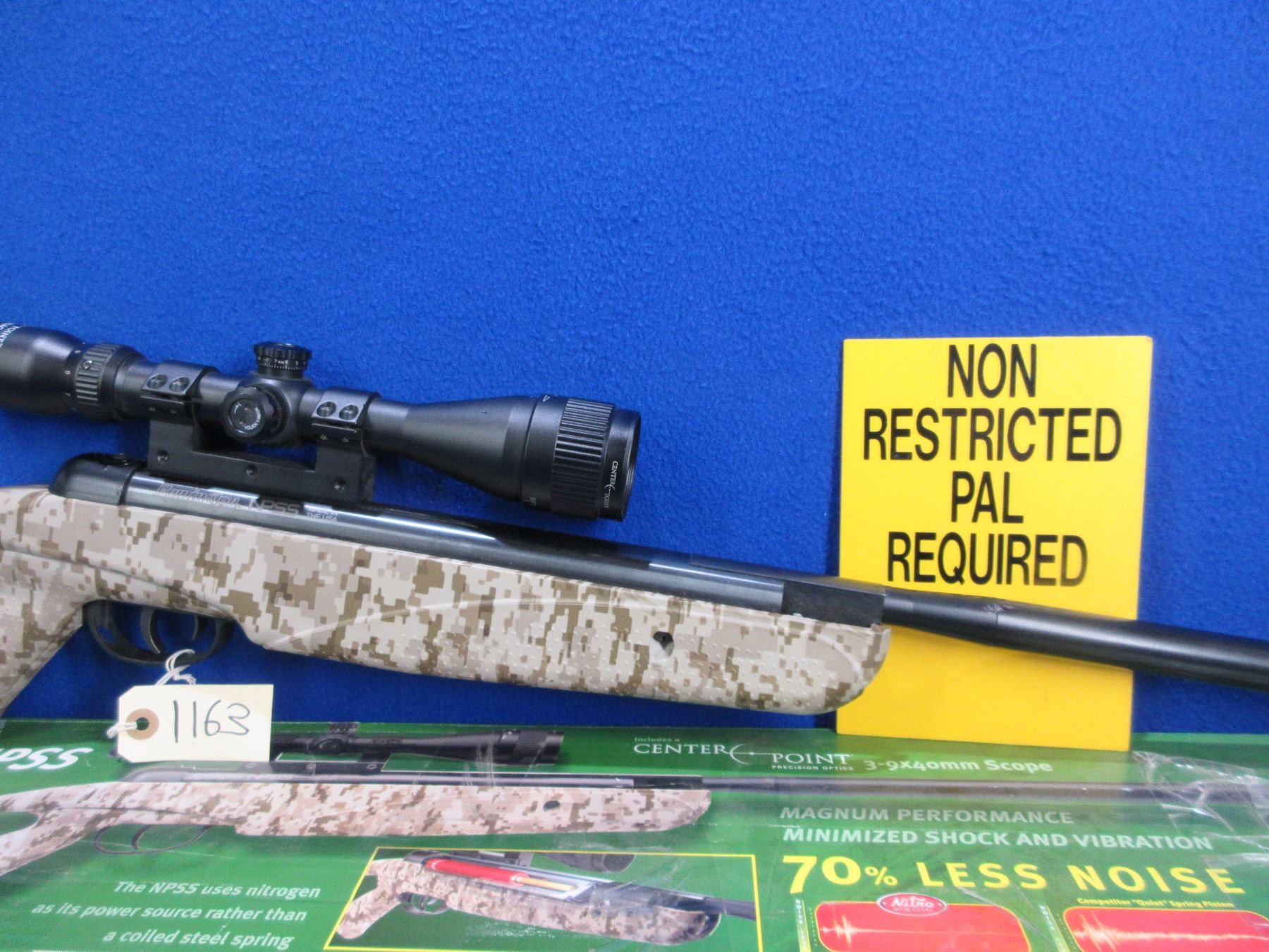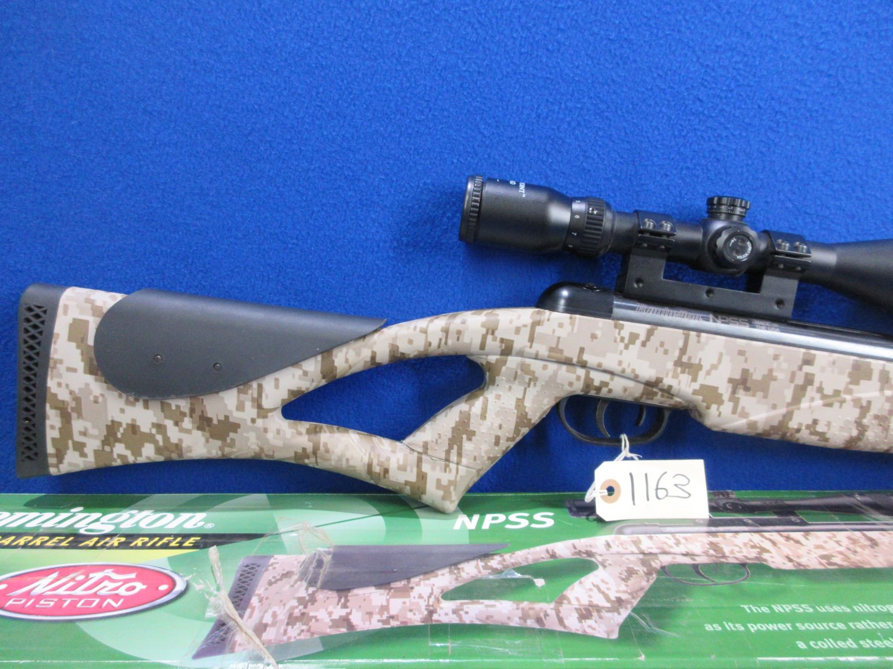 Non-Restricted - Remington NPSS Model RNP77 1200 FPS Air Rifle in .177 Cal. - This is a 1200 FPS break barrel action single shot air rifle, action appears to be in good to very good working order. Barrel is 19 3/4", rifling is good to very good, black finish is good with two scratches, has no sights but has CenterPoint 3-9x40AO scope - appears clear - MIL-Dot reticle, digital camo synthetic stock with adjustable cheek piece is good to very good, length of pull is 14 1/4", rubber recoil pad good, comes with original box and instruction manual. Ser # 711DA1014
