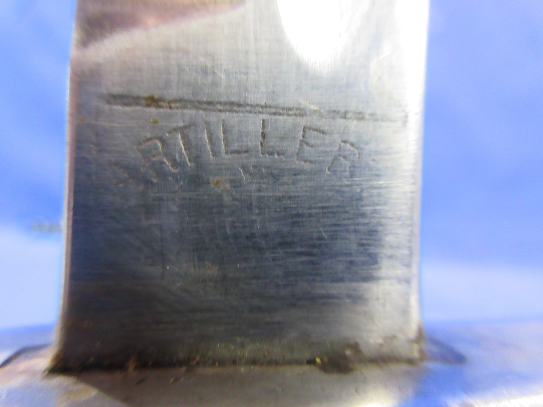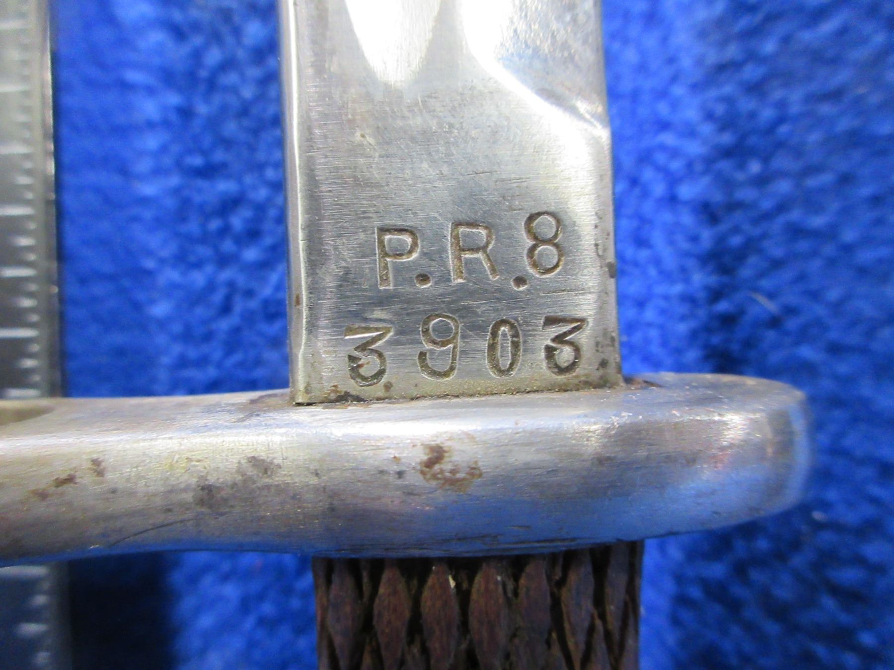 Spanish Mauser Model 1913 Bayonet and Leather Scabbard with Metal Fittings - Marked "Artilleria with Crown over V" on one side and "P.R.8 over 3903" on other side - 15 3/4" Blade, 20 1/2" Total Length