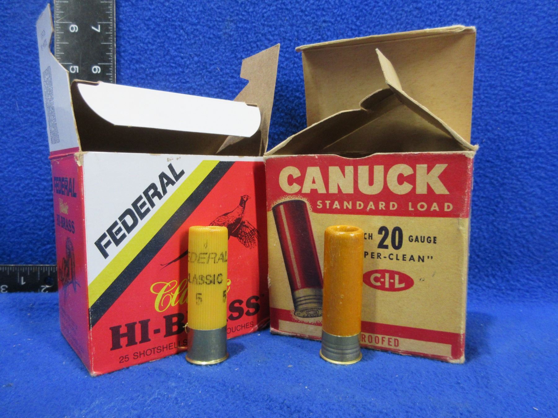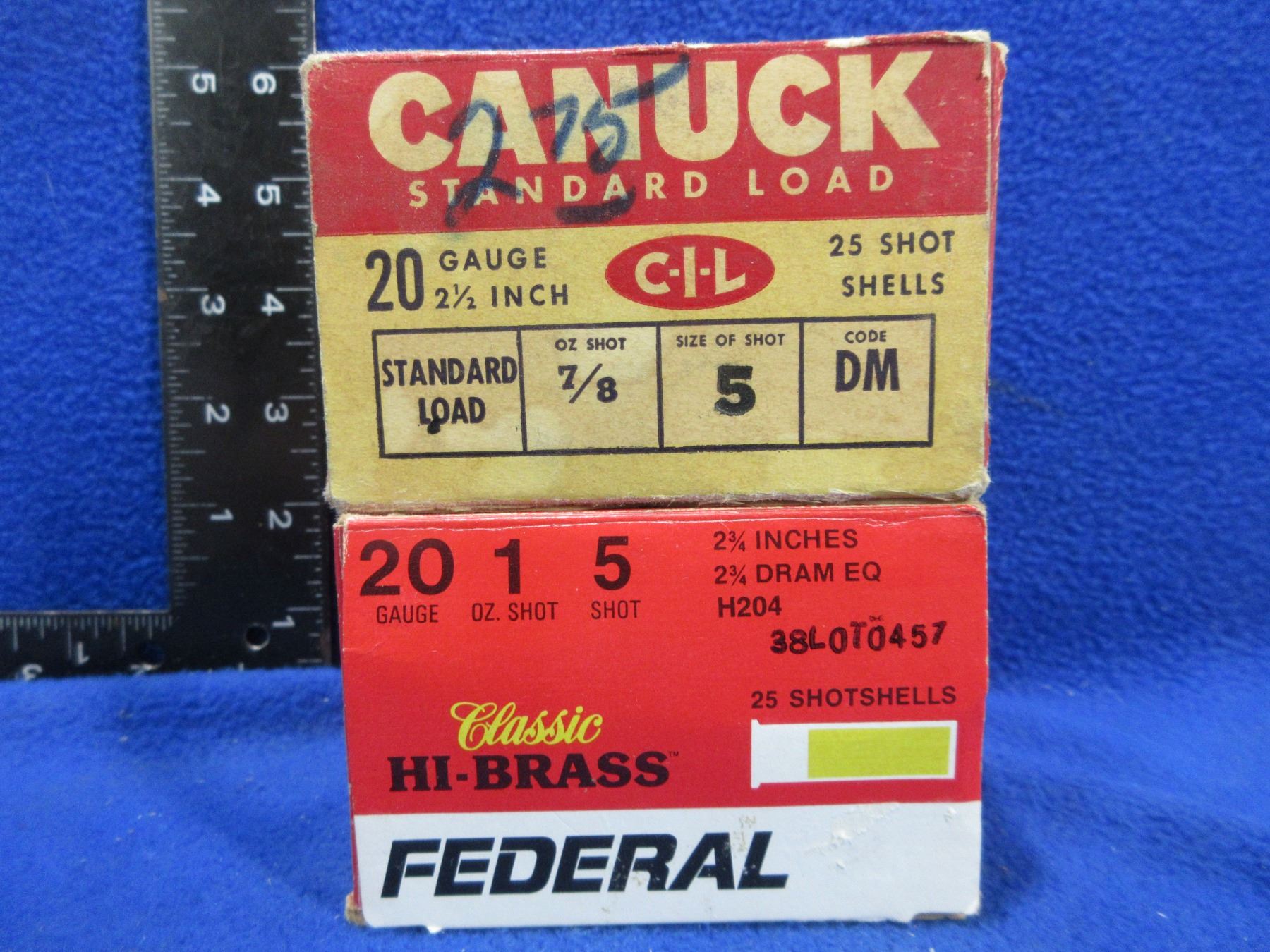 20 Ga. Federal & Canuck Shotshells (Pick Up or Ship by UPS Only) - Box of 25 (Federal 2 3/4" 5 Shot), Box of 17 (Canuck 2 1/2" 5 Shot Paper)