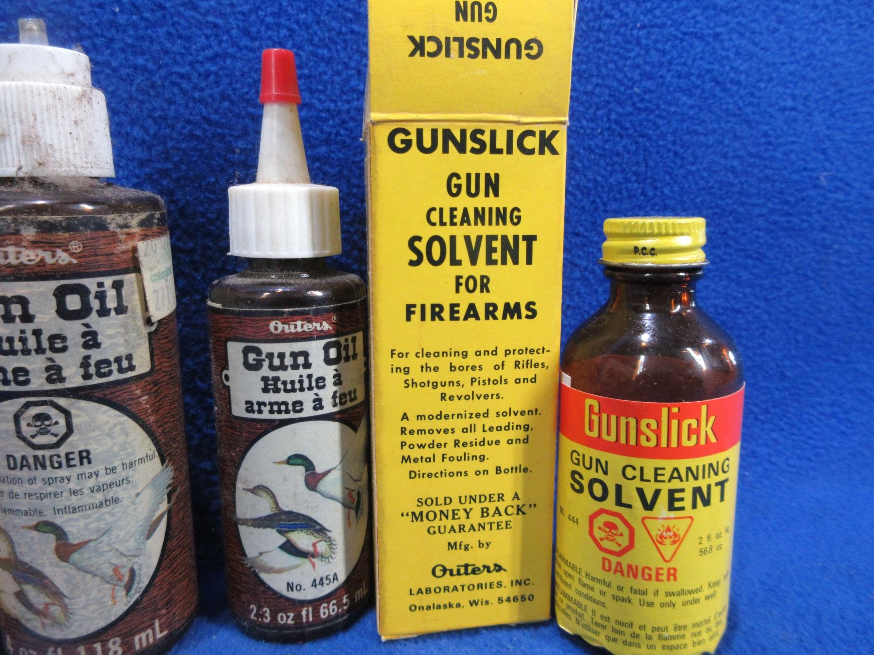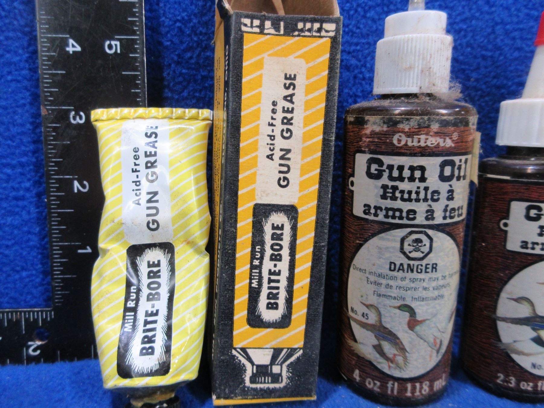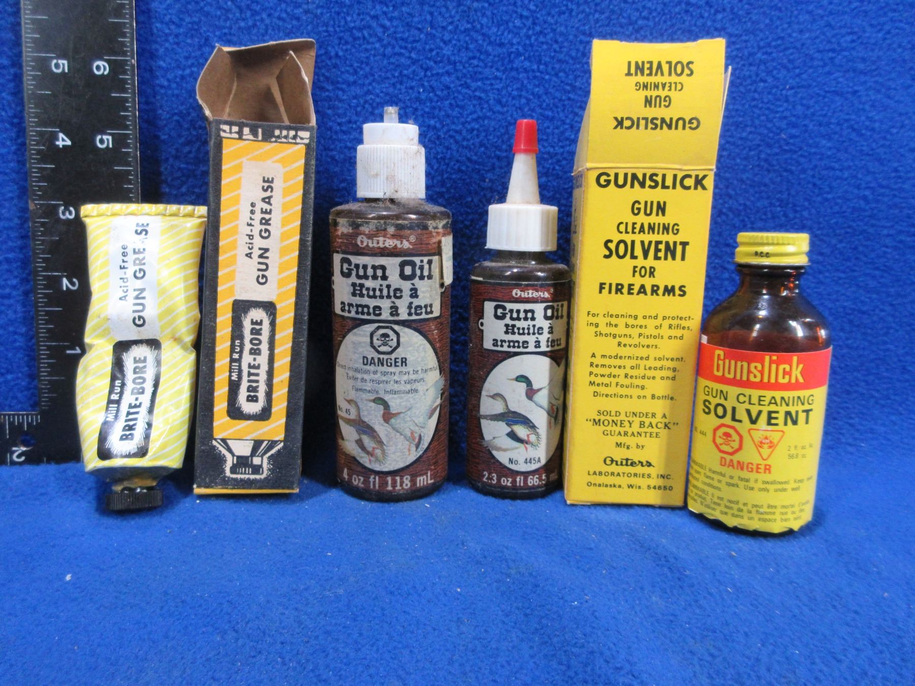 Brite Bore Gun Grease, Gunslick Solvent and 2 Outers Gun Oil - Outer's gun oil appear full, solvent and grease appear 3/4 full