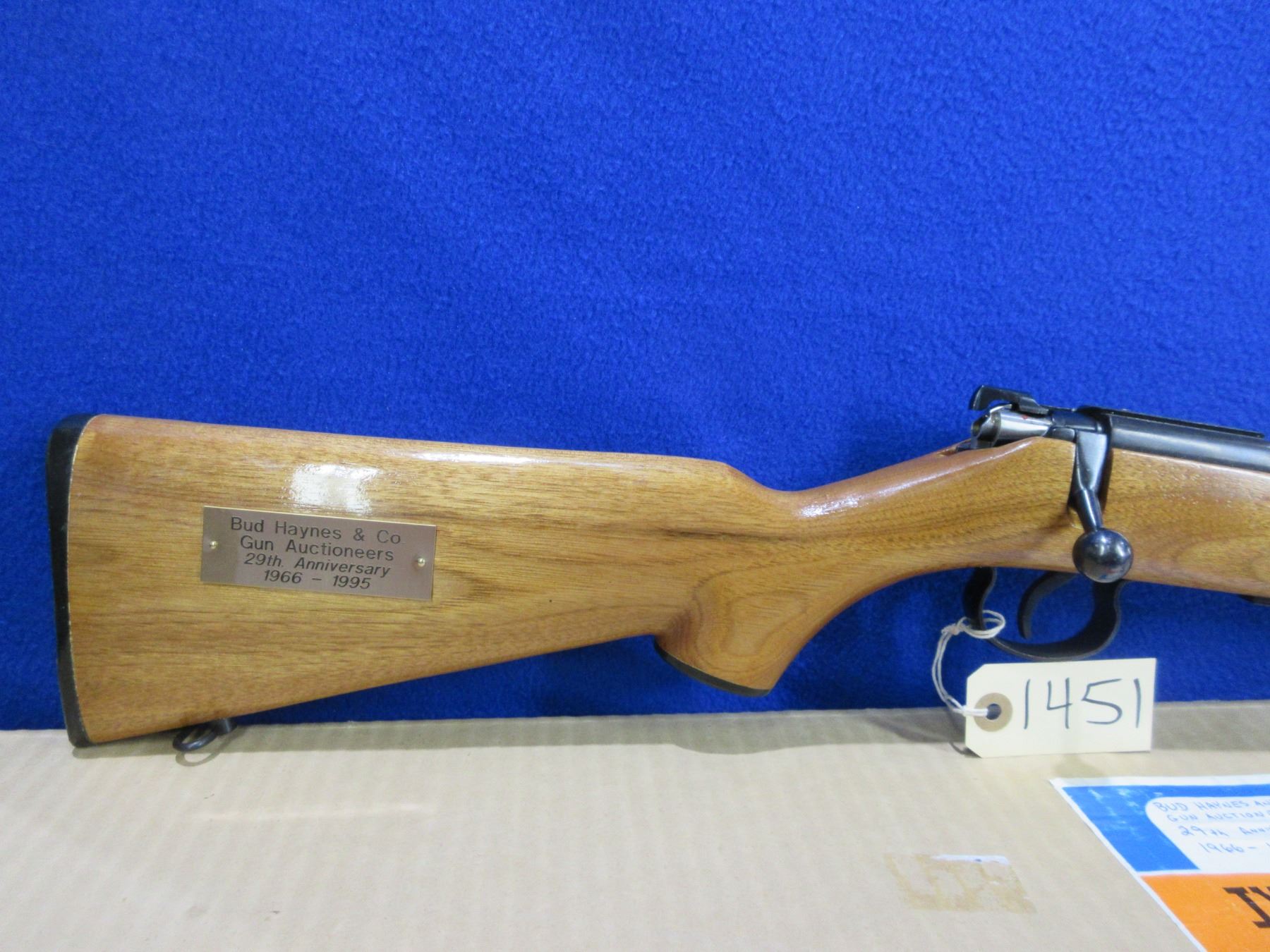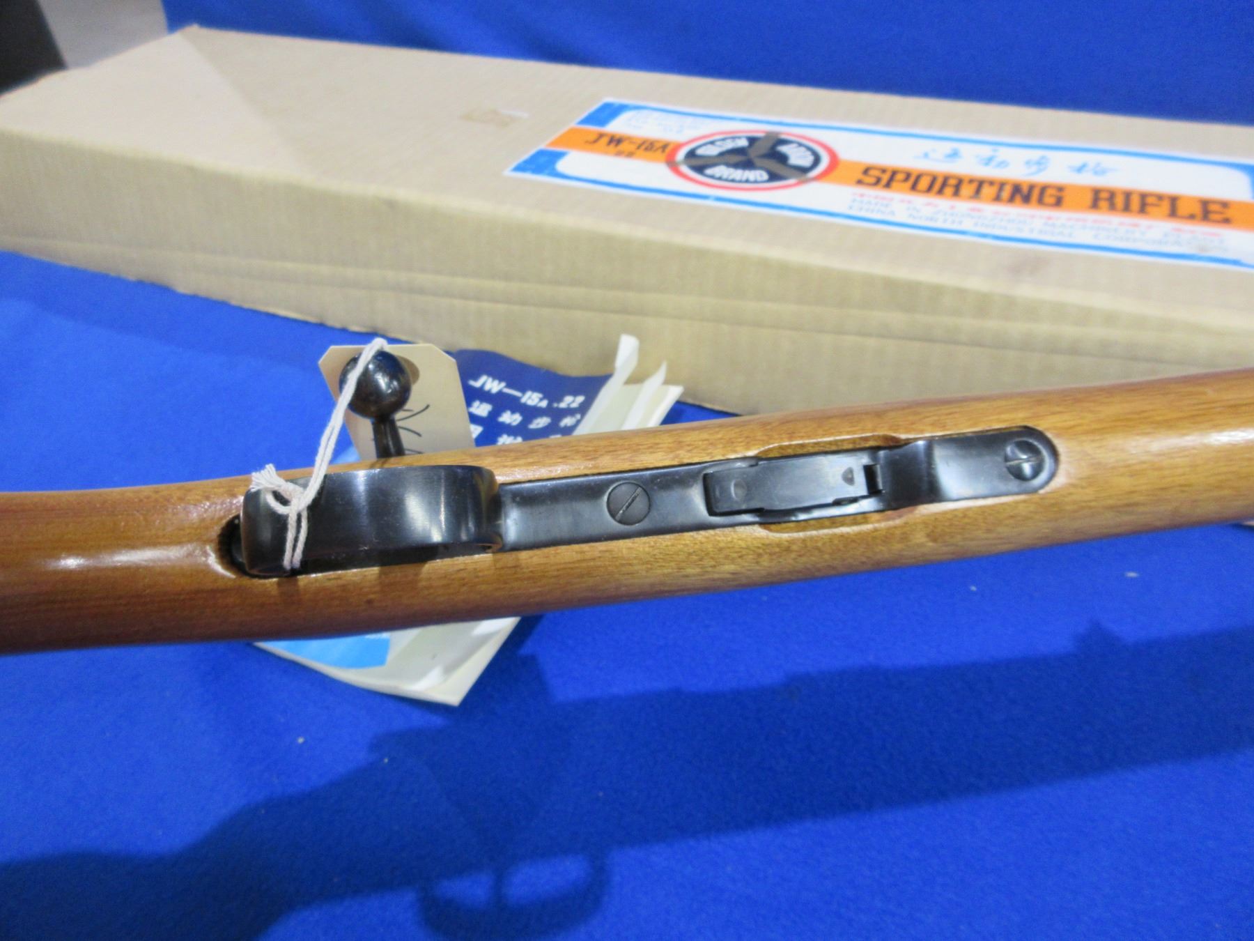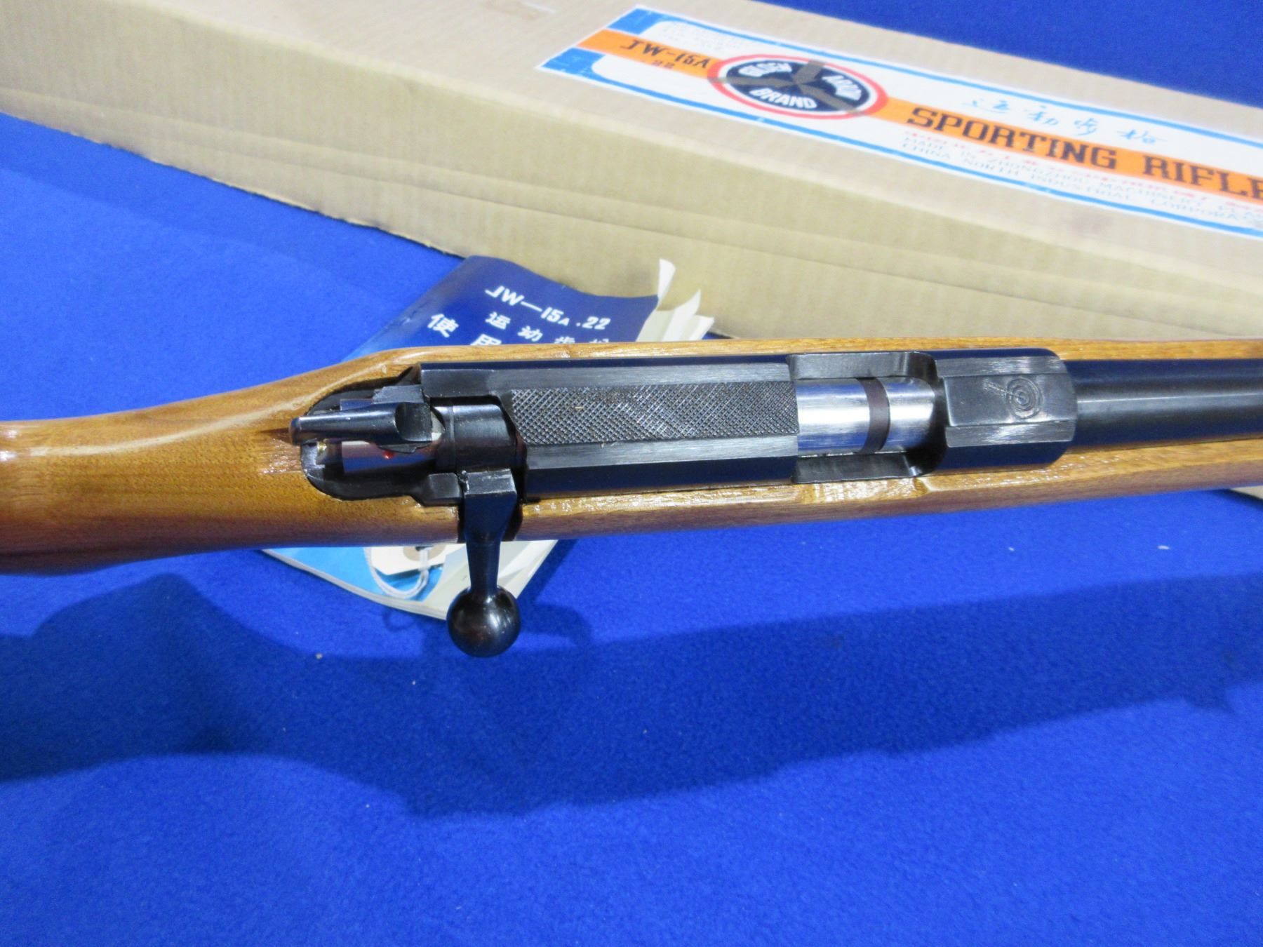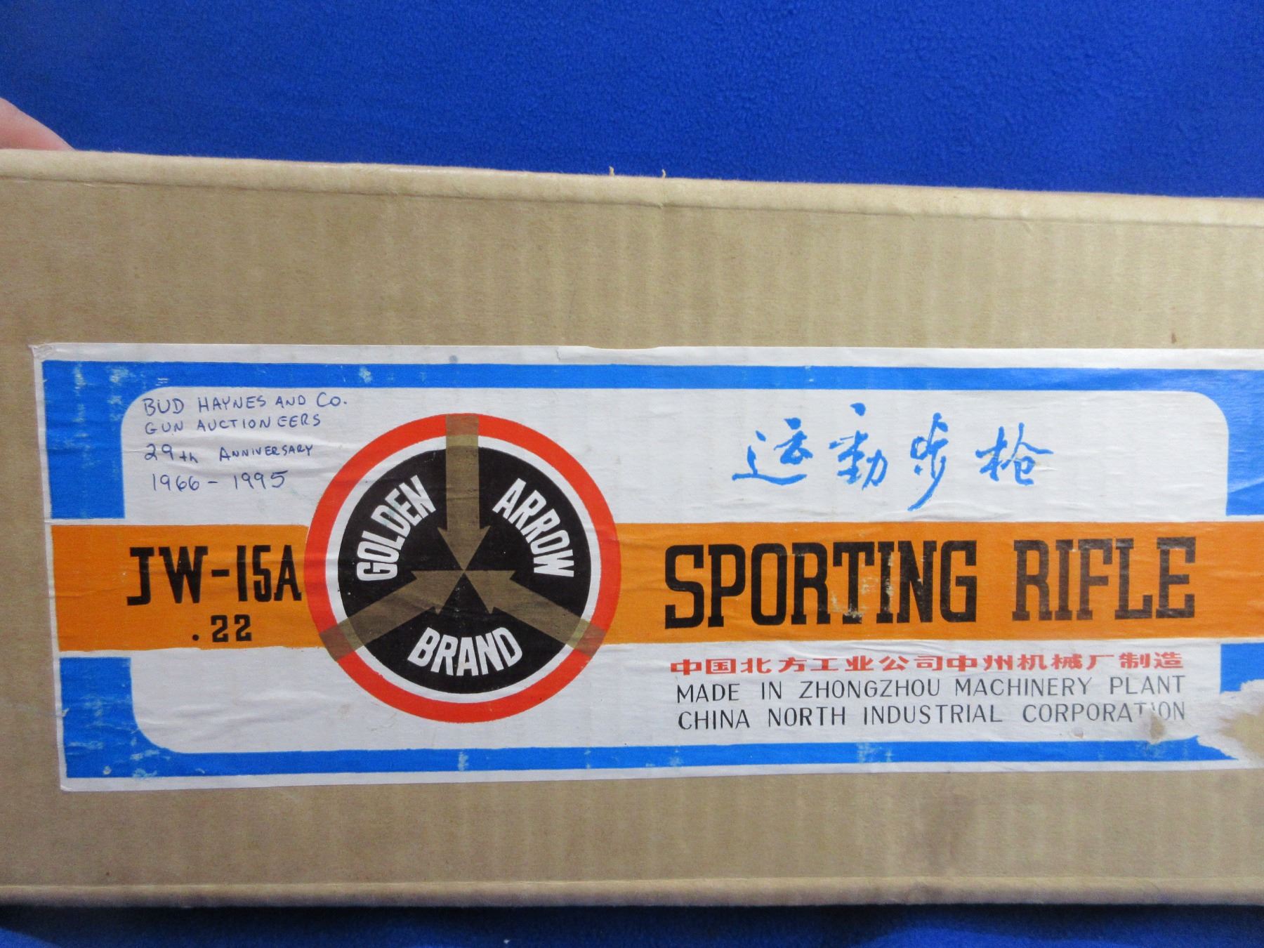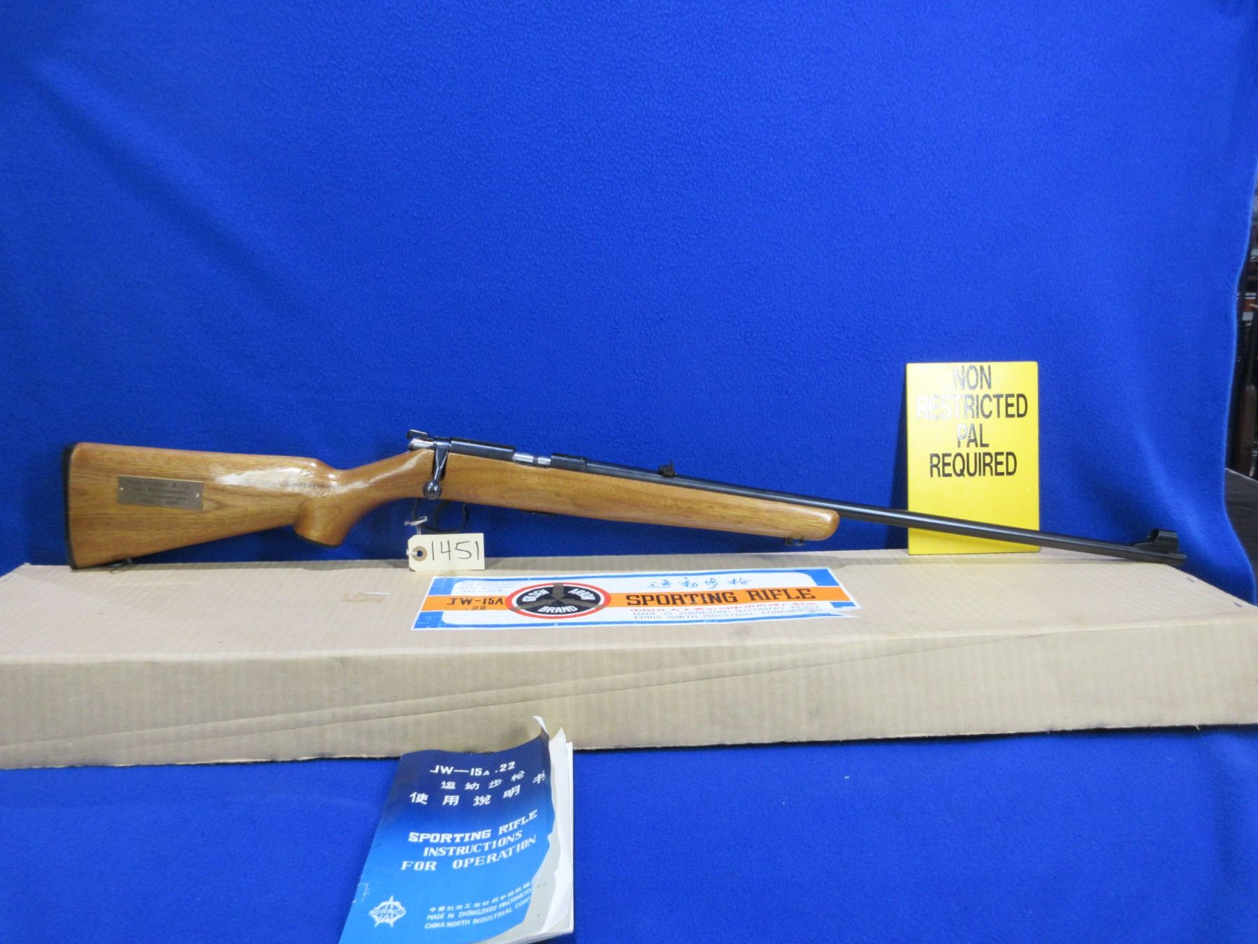 Non-Restricted - Norinco Model JW-15A in 22LR- This is a bolt action rifle with removable magazine, action appears to be in good to very good working order. Barrel is 24", rifling is good to very good, bluing is good to very good, has both sights, stock is good to very good, length of pull is 13 3/4", butt plate good, comes with swivels and original box. Plate on right side states Bud Haynes & Co. Gun Austioneers 29th Anniversary 1966-1995. Ser # 8602830
