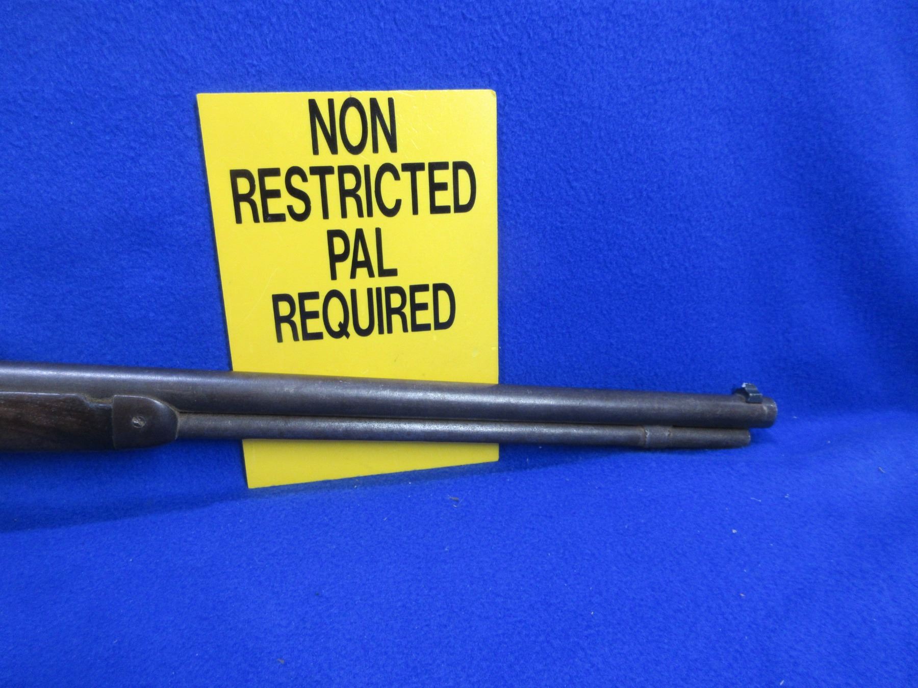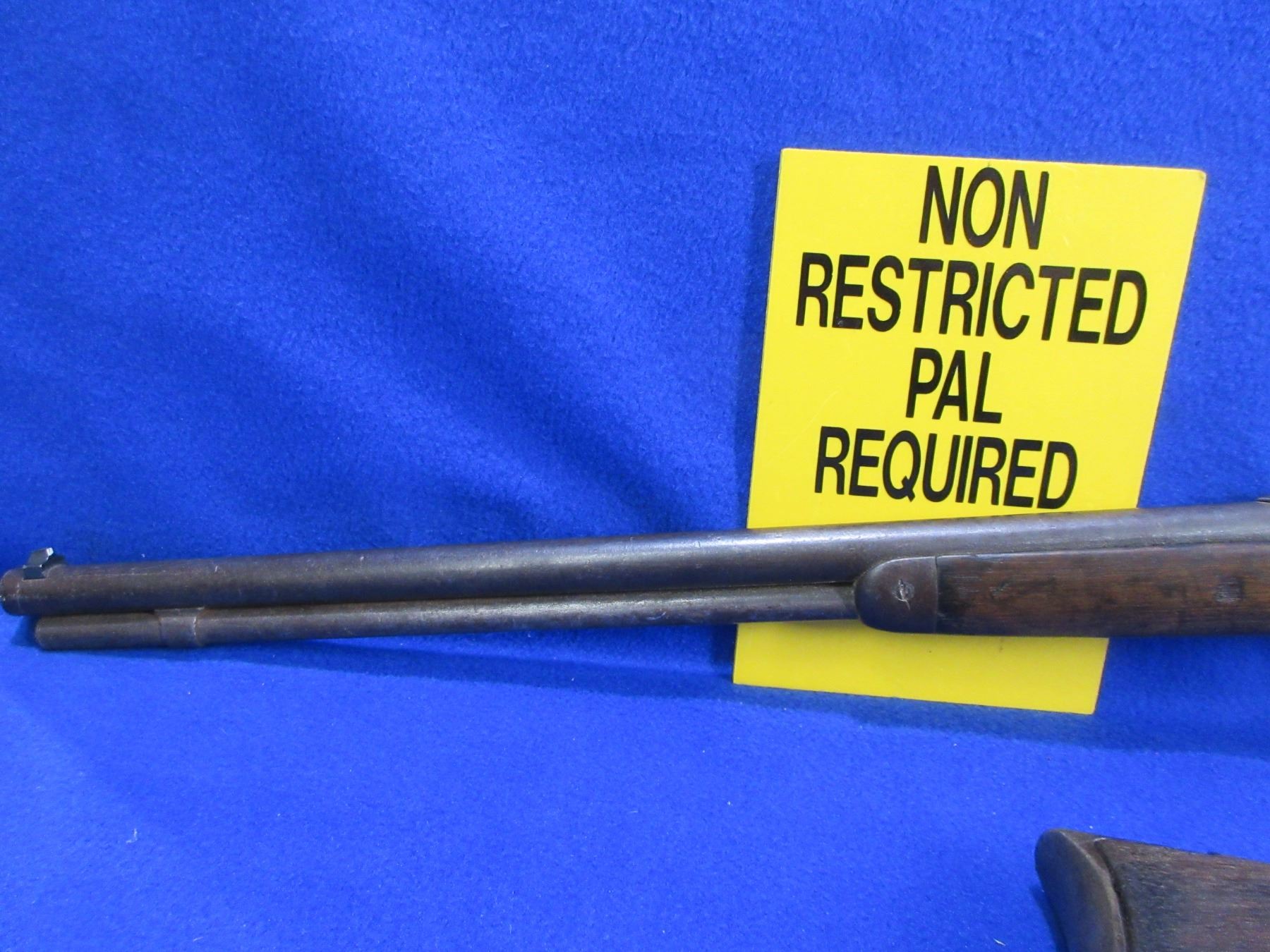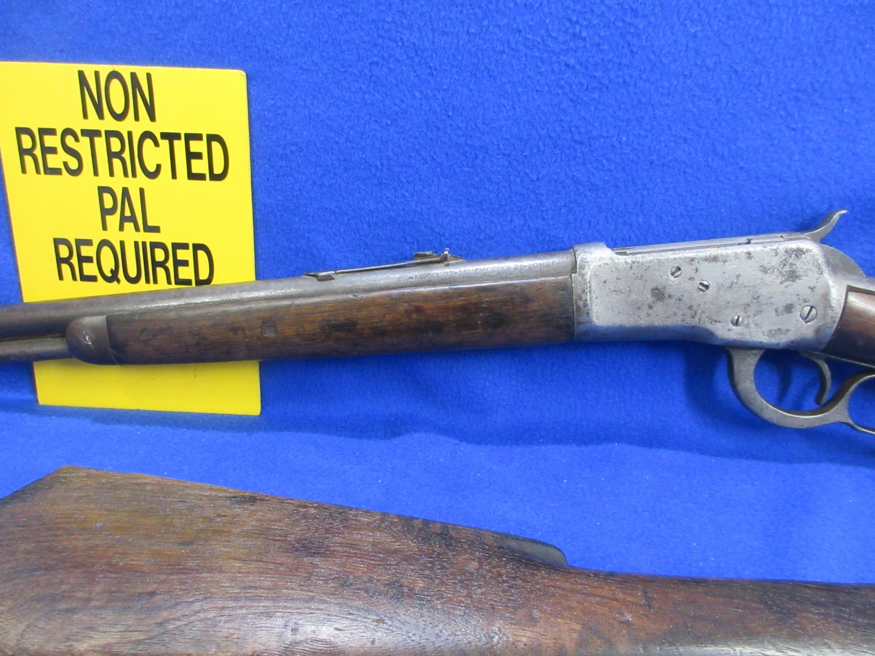 Non-Restricted - Winchester Model 92 in 25-20 WCF - This is a lever action rifle with tube magazine, action appears to be in good working order. Barrel is 23" and appears shortened, rifling is good, bluing is turning grey with light pitting, has both sights, stock is good with usage marks, forearm has a crack on the bottom at the back, length of pull is 13 1/4", metal butt plate good, comes with original stock and crescent metal butt plate. Ser # 984391