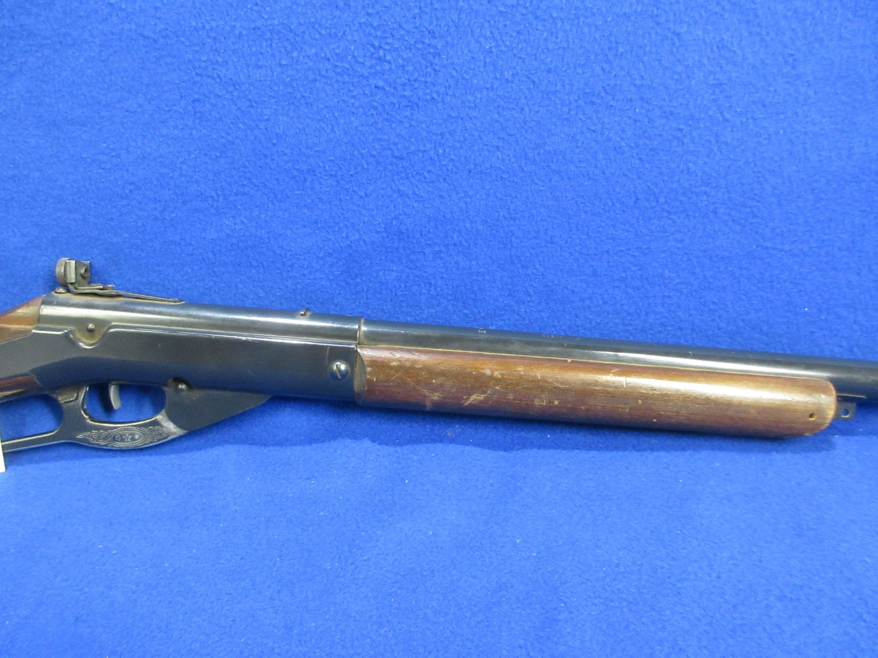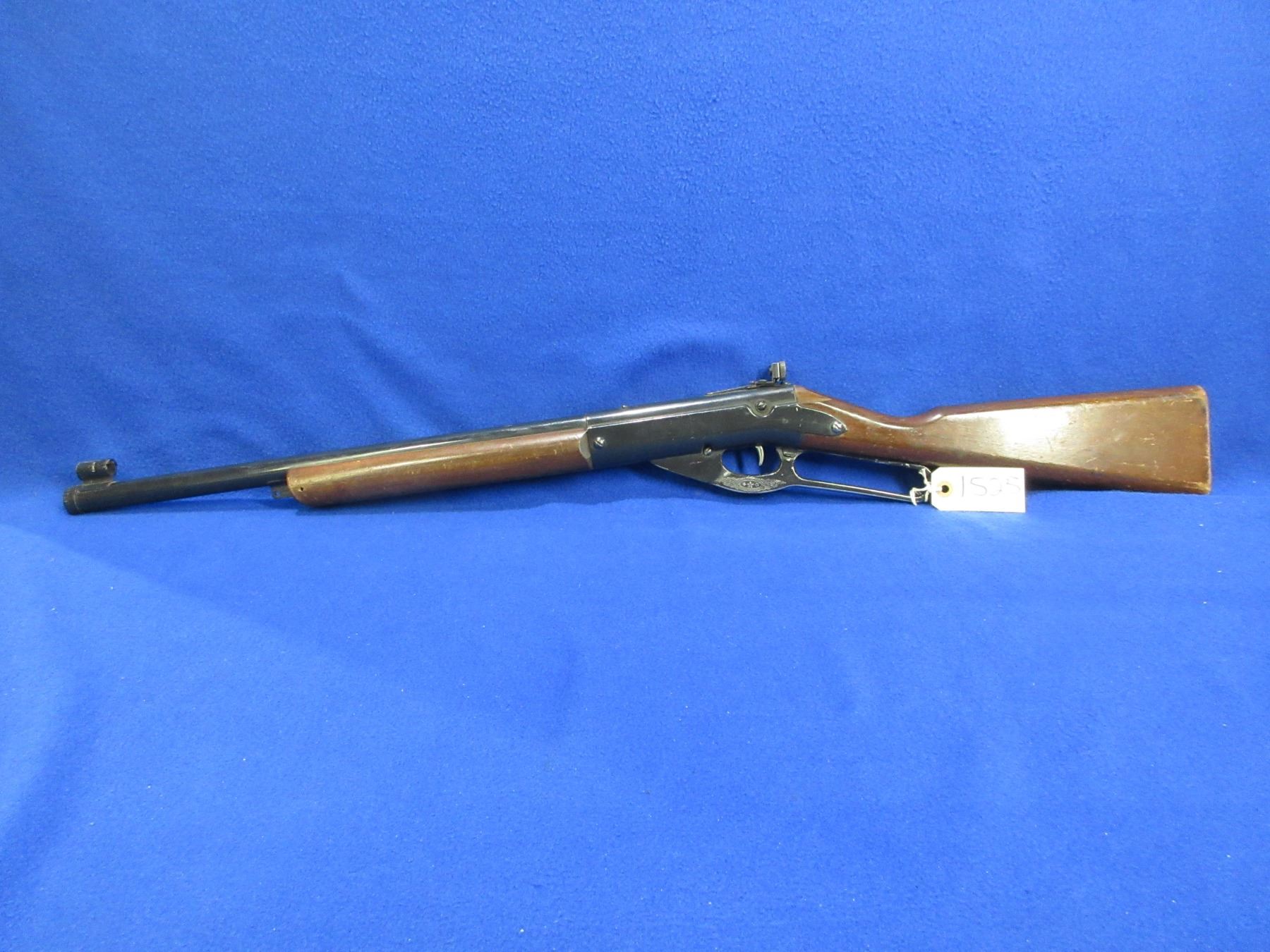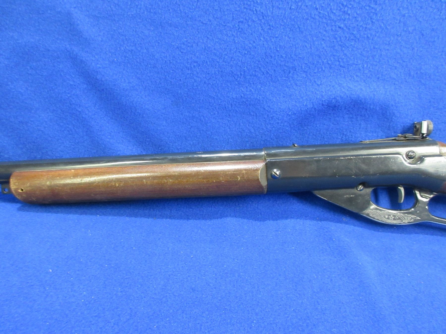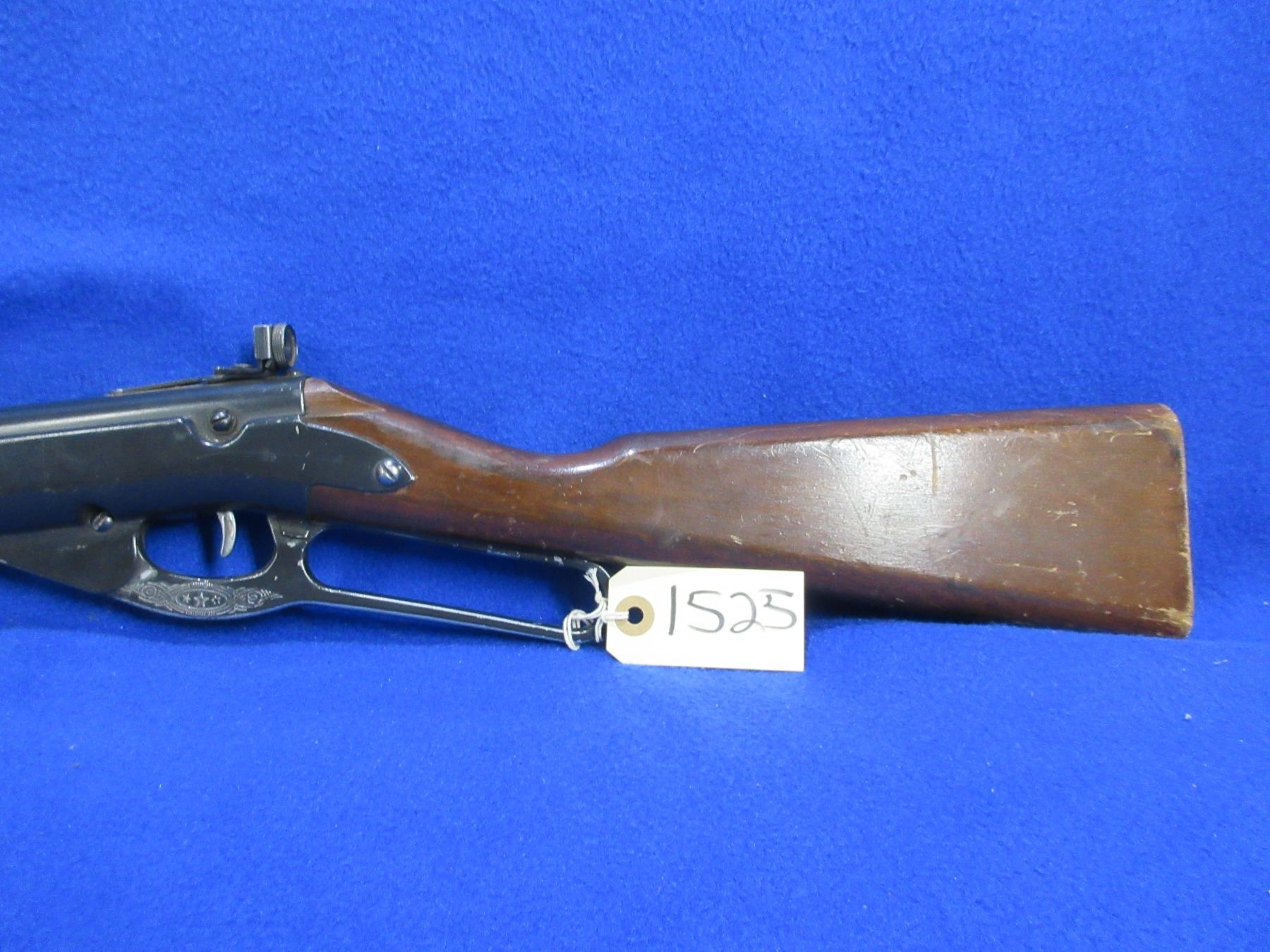 No PAL Required - Daisy Model 99 Air Rifle in .177 BB - This is a lever action air rifle with internal magazine, action appears to be in good working order. Barrel is 17", bluing is good, front peep sight aperture is missing, has rear peep sight, wood stock and forearm are good with usage marks, length of pull is 14". Ser # None