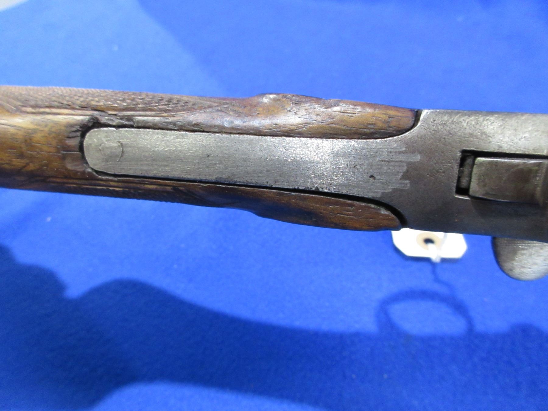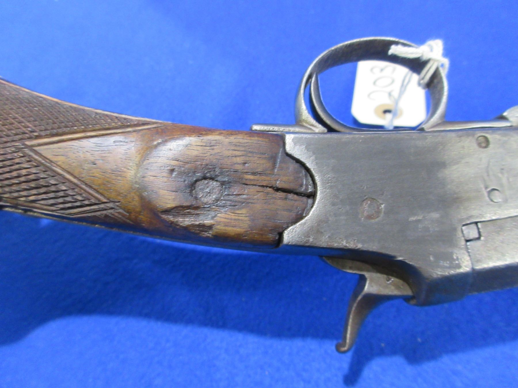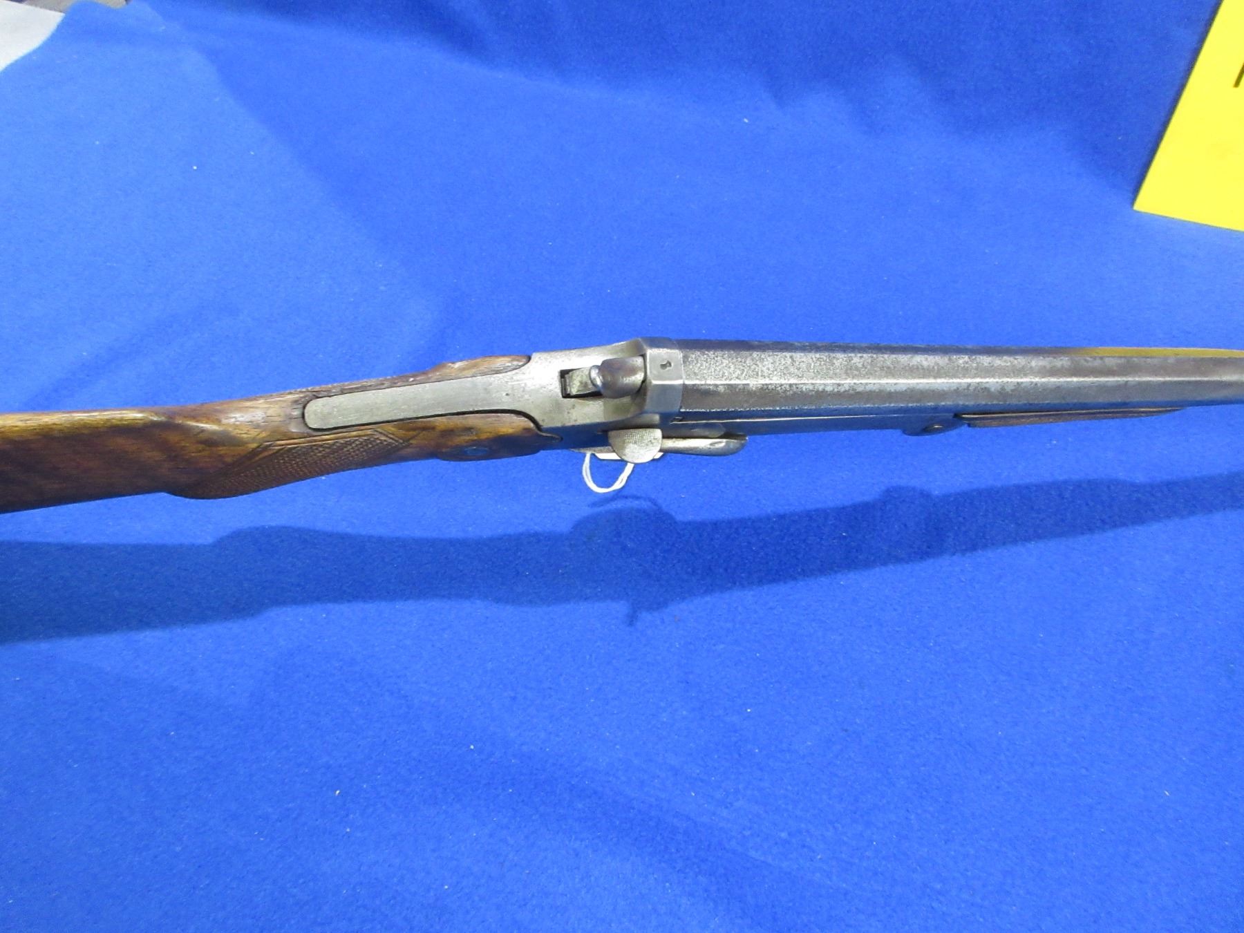 Non-Restricted - Belgian Leige in appears to be in 16 Ga.- This is a tip up side lever single shot folding shotgun, action is in non working order as will not open. Barrel is 25 3/4", bore appears fair, bluing is gone and has light pitting, has bead front sight, stock has cracks both sides back of the action, forearm is fair to good, length of pull is 14 1/2", metal butt plate. Butt plate, forearm and rear bottom tang have incorrect screws. Ser # None
