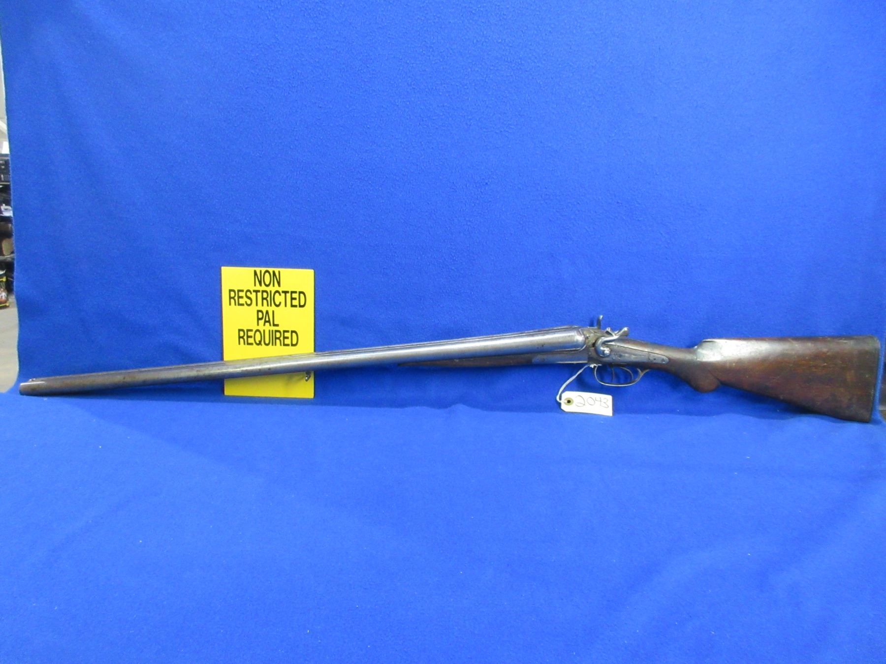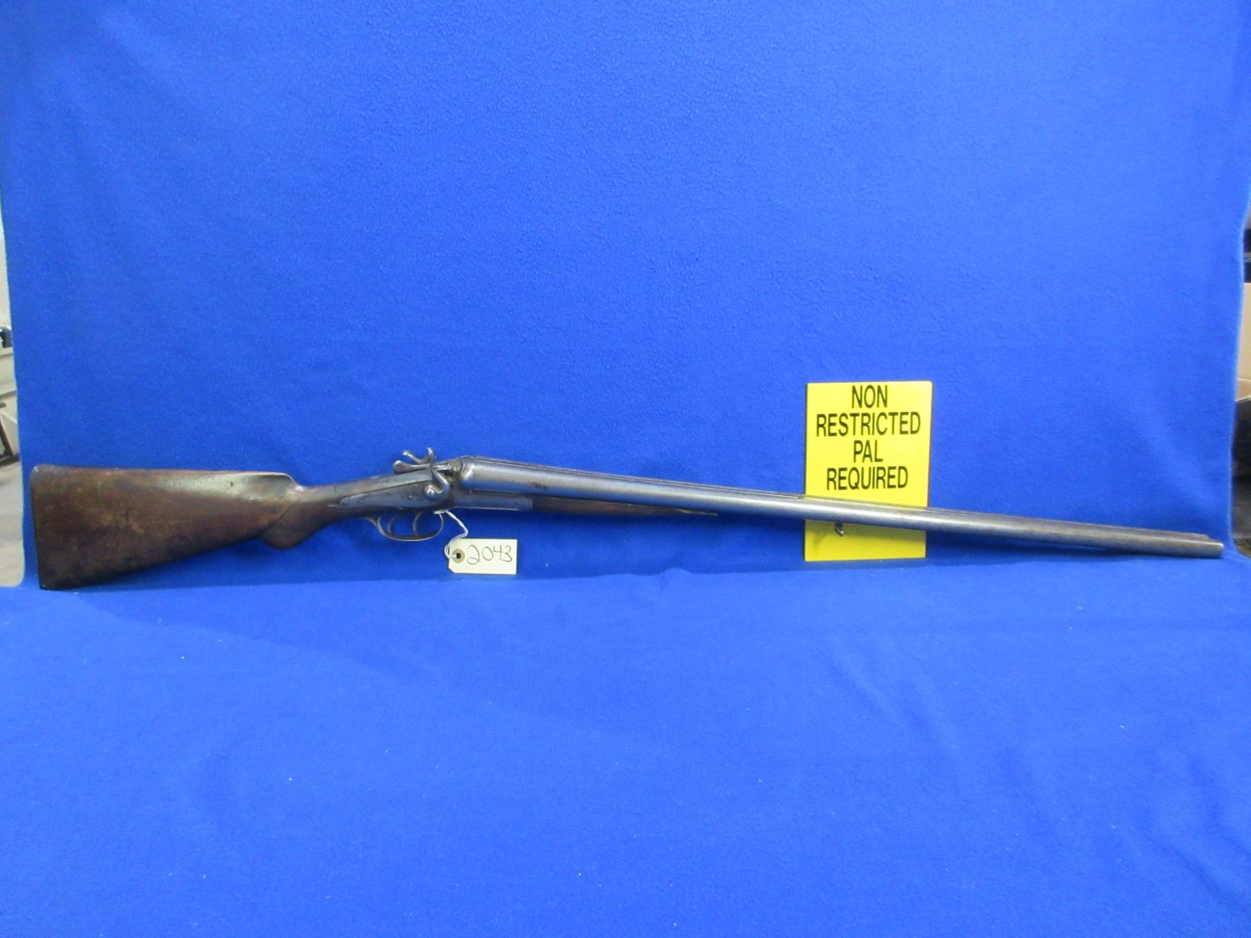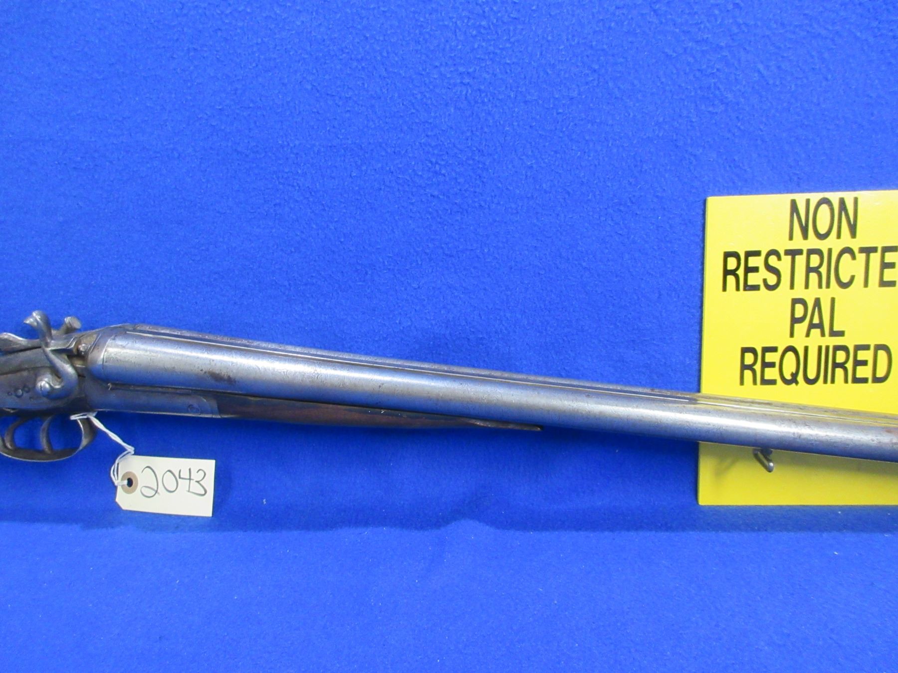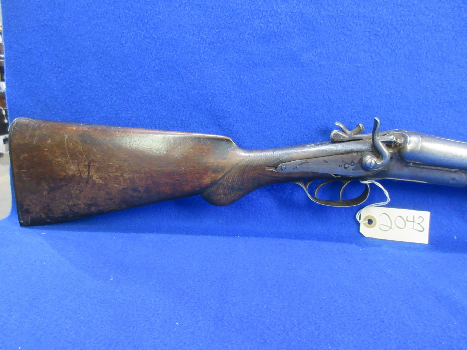 Non-Restricted - Model in Ga.? - This is a tip up SXS hammer shotgun, in non working order as action is loose and stock has major cracks in the wrist area. Damascus barrels are 30 5/8" - left barrel has a dent approx 13" from muzzle, bores are fair to good, bluing is gone, has bead front sight, stock is badly cracked in the wrist area, forearm has a crack on the left side and a chip on the right side, length of pull is 14 1/4", butt plate has a chip on the toe, comes with front swivel, rear swivel stud missing. Ser # 11160
