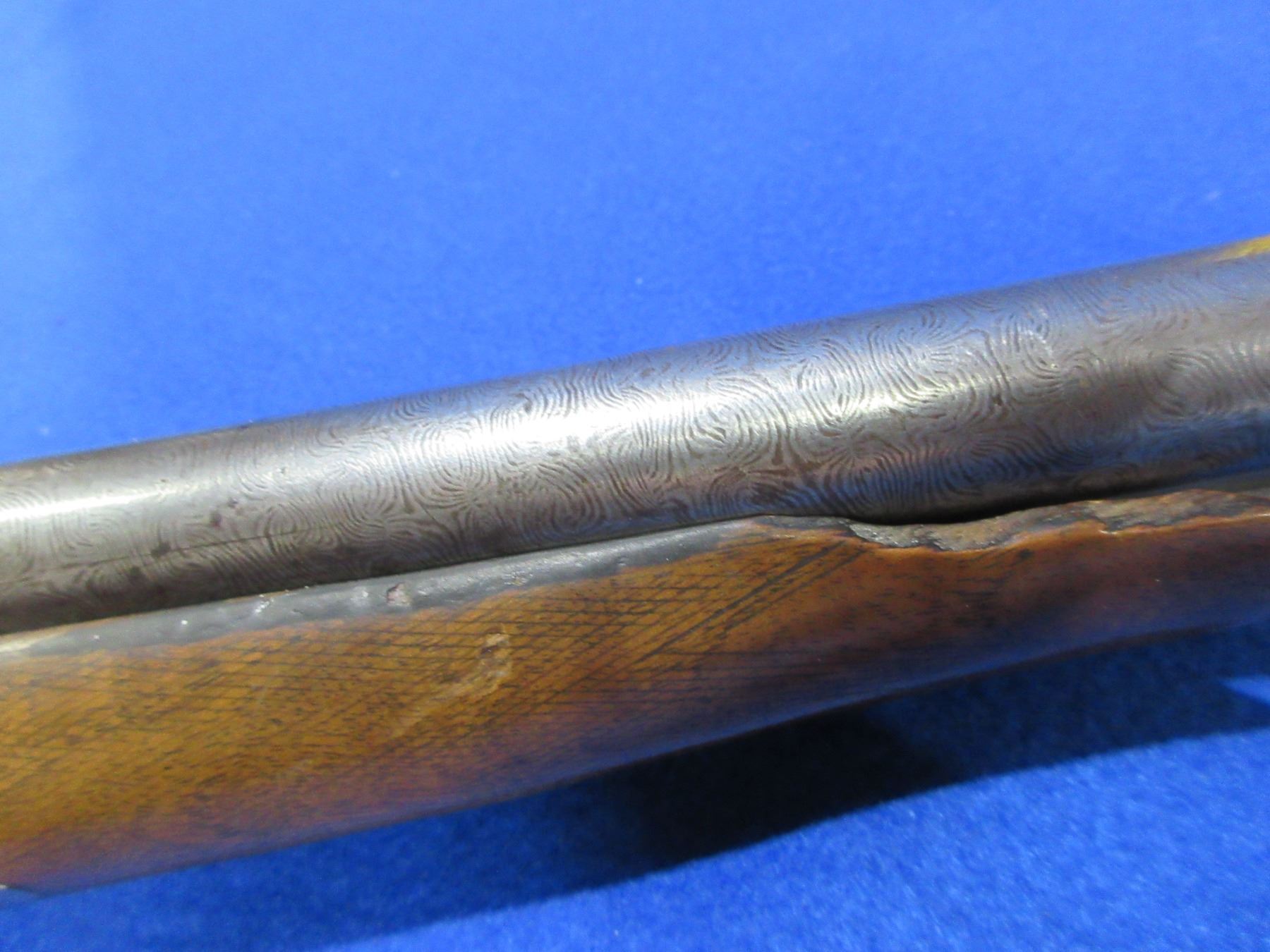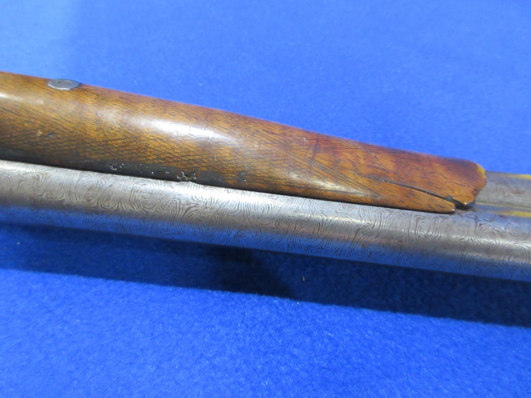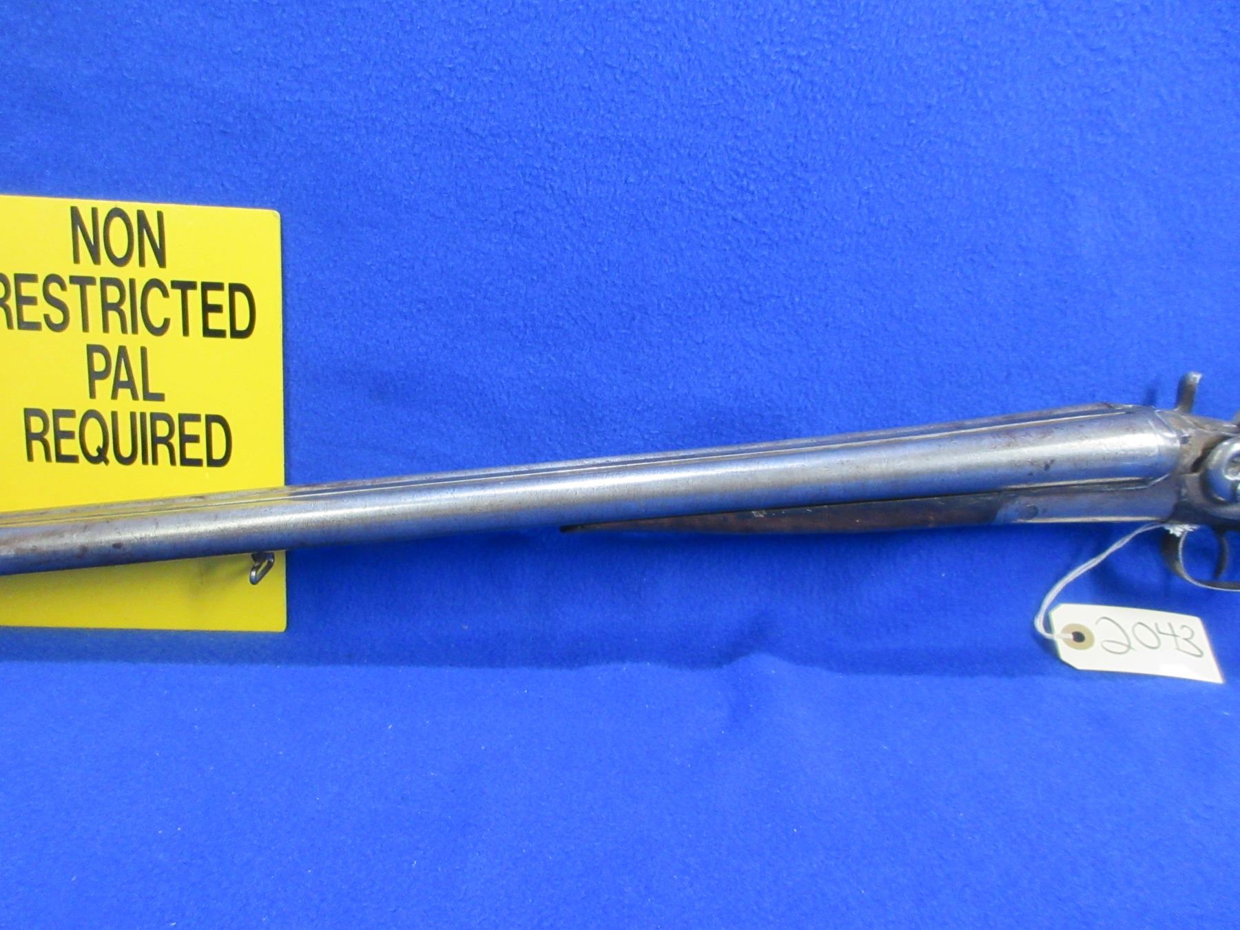 Non-Restricted - Model in Ga.? - This is a tip up SXS hammer shotgun, in non working order as action is loose and stock has major cracks in the wrist area. Damascus barrels are 30 5/8" - left barrel has a dent approx 13" from muzzle, bores are fair to good, bluing is gone, has bead front sight, stock is badly cracked in the wrist area, forearm has a crack on the left side and a chip on the right side, length of pull is 14 1/4", butt plate has a chip on the toe, comes with front swivel, rear swivel stud missing. Ser # 11160
