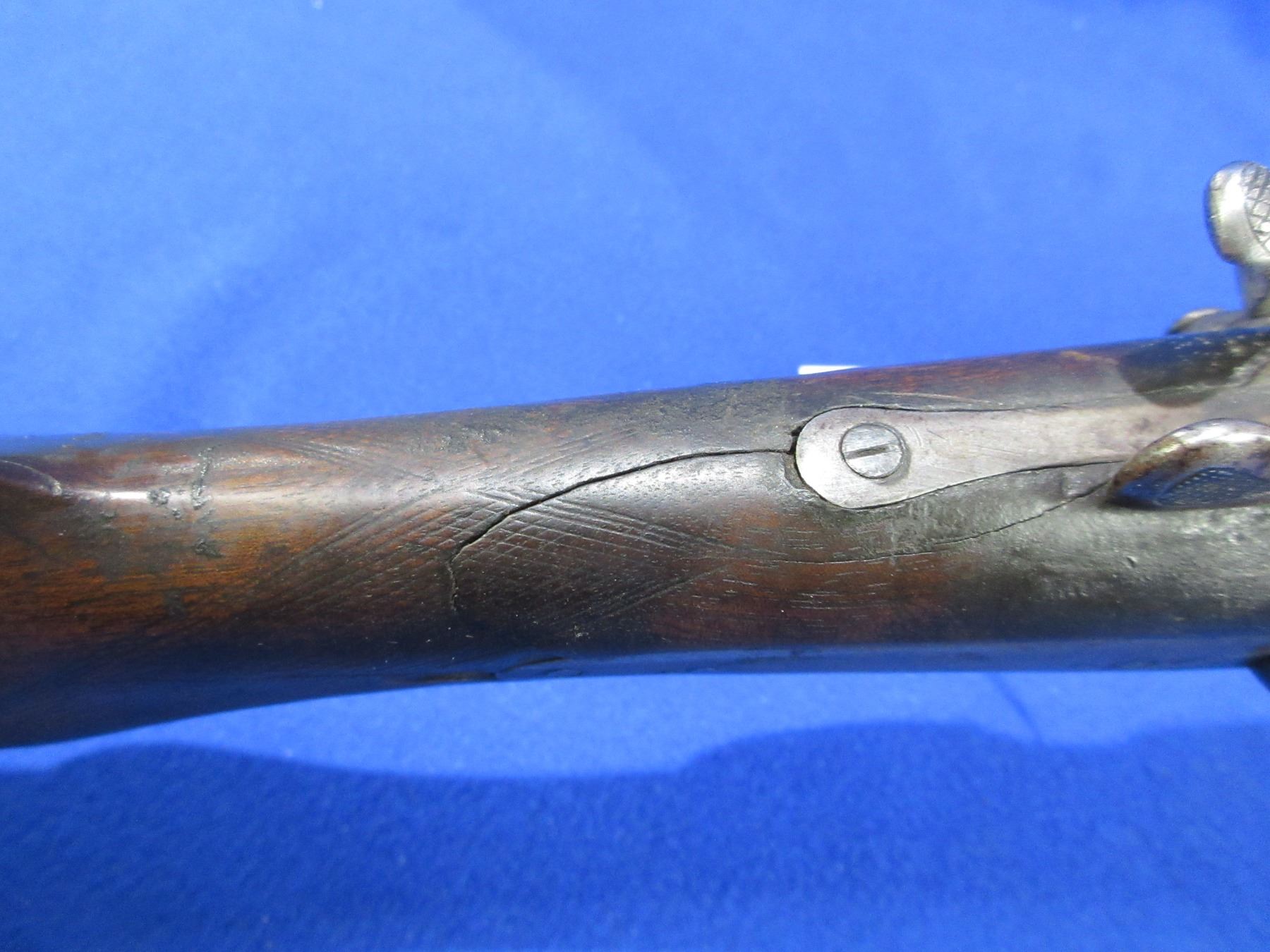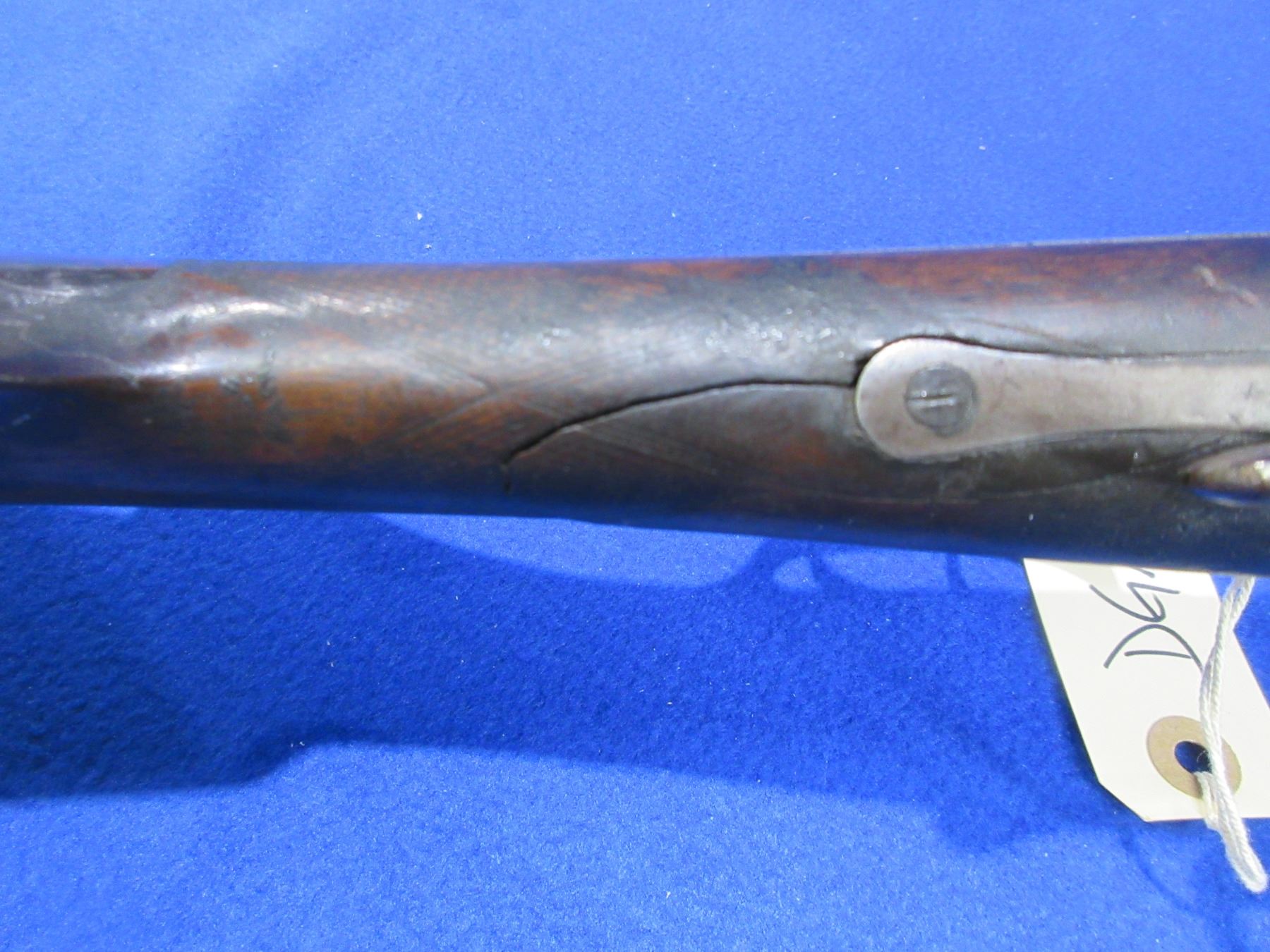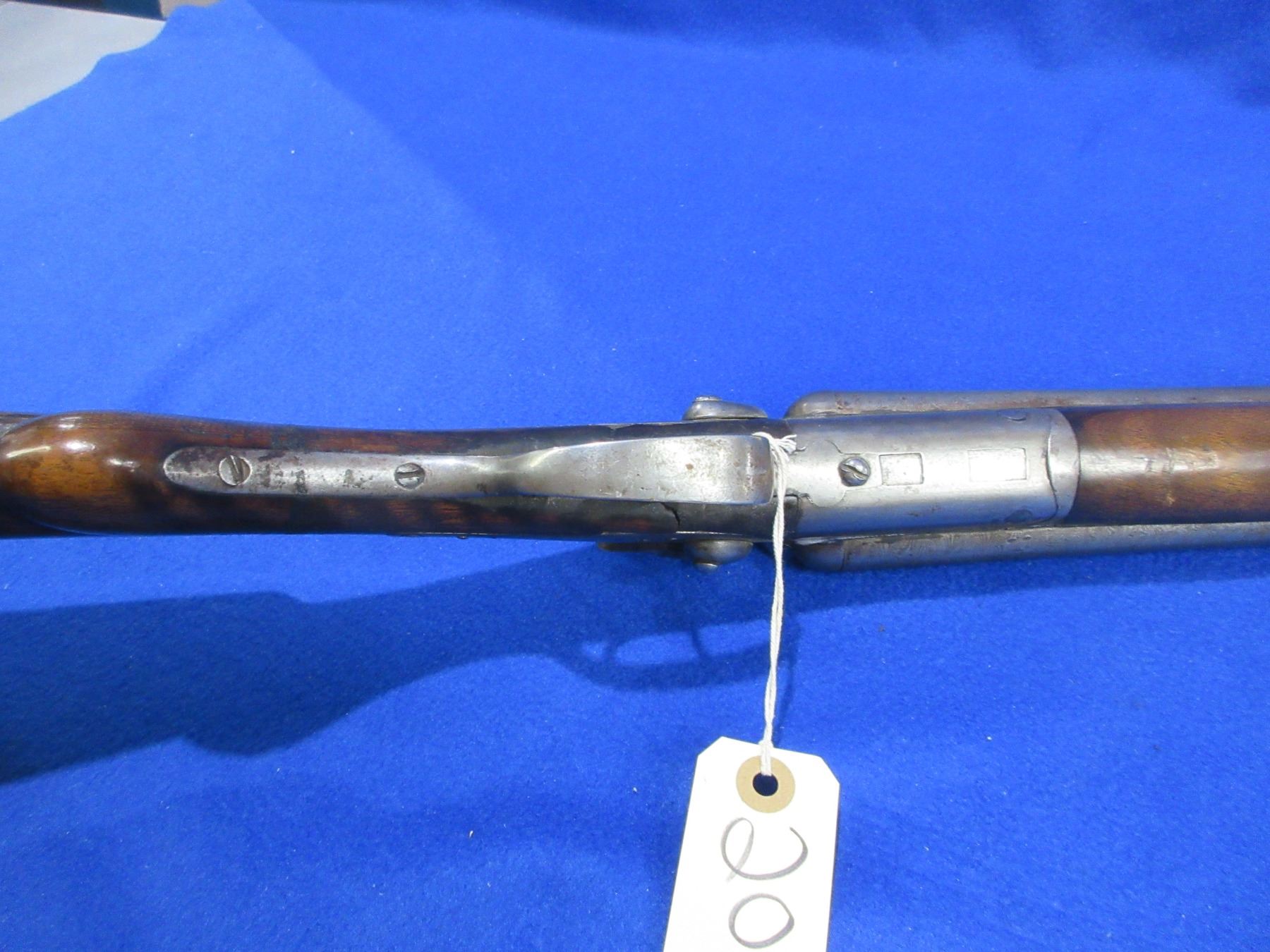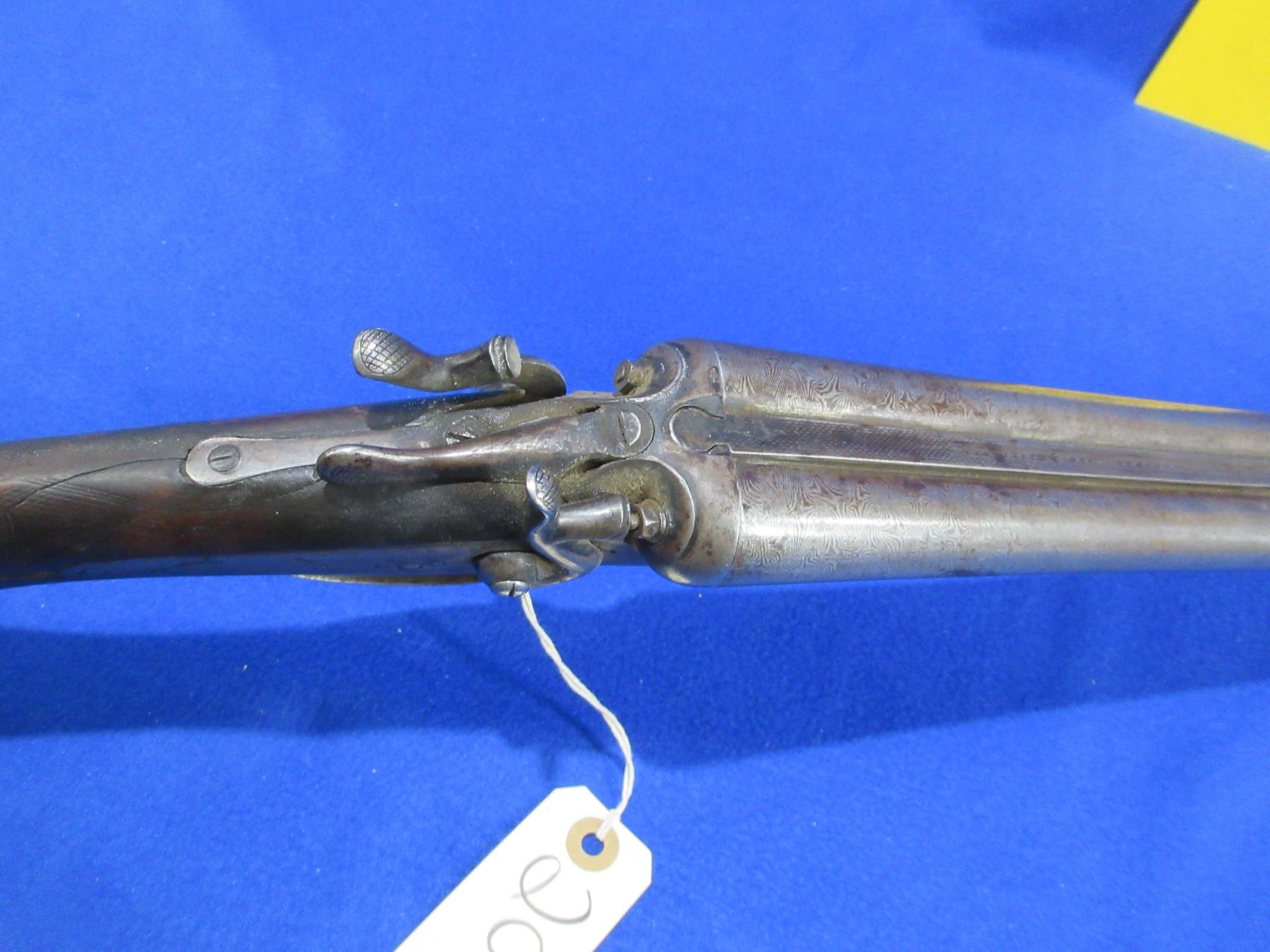 Non-Restricted - Model in Ga.? - This is a tip up SXS hammer shotgun, in non working order as action is loose and stock has major cracks in the wrist area. Damascus barrels are 30 5/8" - left barrel has a dent approx 13" from muzzle, bores are fair to good, bluing is gone, has bead front sight, stock is badly cracked in the wrist area, forearm has a crack on the left side and a chip on the right side, length of pull is 14 1/4", butt plate has a chip on the toe, comes with front swivel, rear swivel stud missing. Ser # 11160