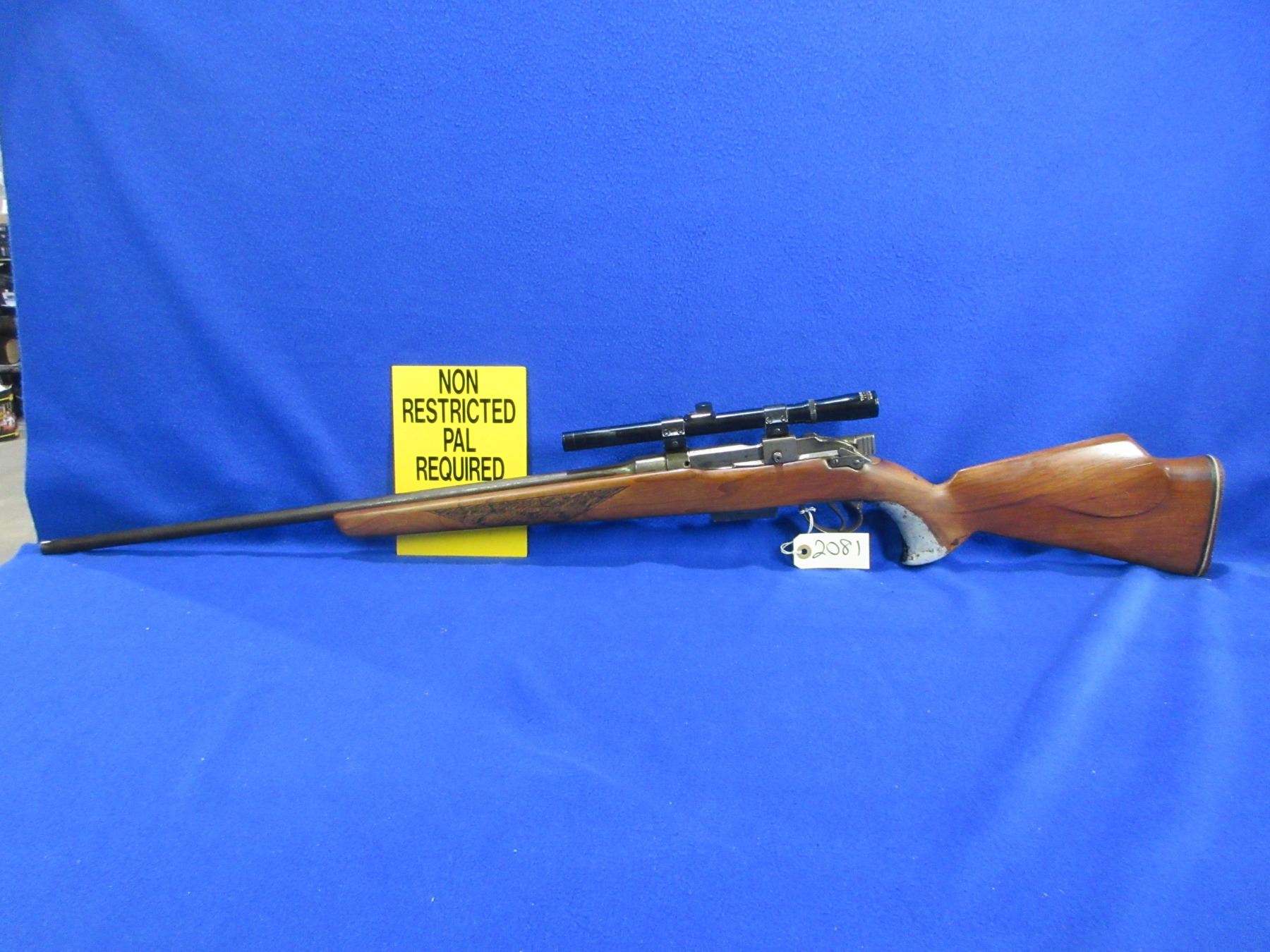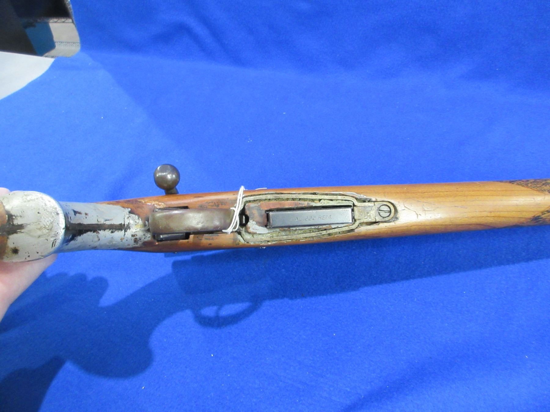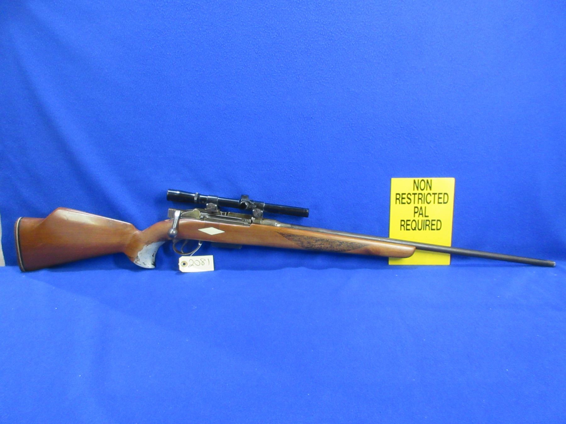 Non-Restricted - Lee Enfield No 4 Mk I Converted Rifle in 222 Rem - This is a bolt action rifle with permanantly installed magazine, action appears to be in working order. Barrel is 25", rifling is good, bluing has light pitting on barrel and is gone on the action, has no sights but has Weaver 3/4" rings and Tasco 6x15 scope - appears cloudy - standard reticle, stock has a major repair in the wrist area, length of pull is 13 1/2", butt plate poor, swivel studs are missing. Ser # None