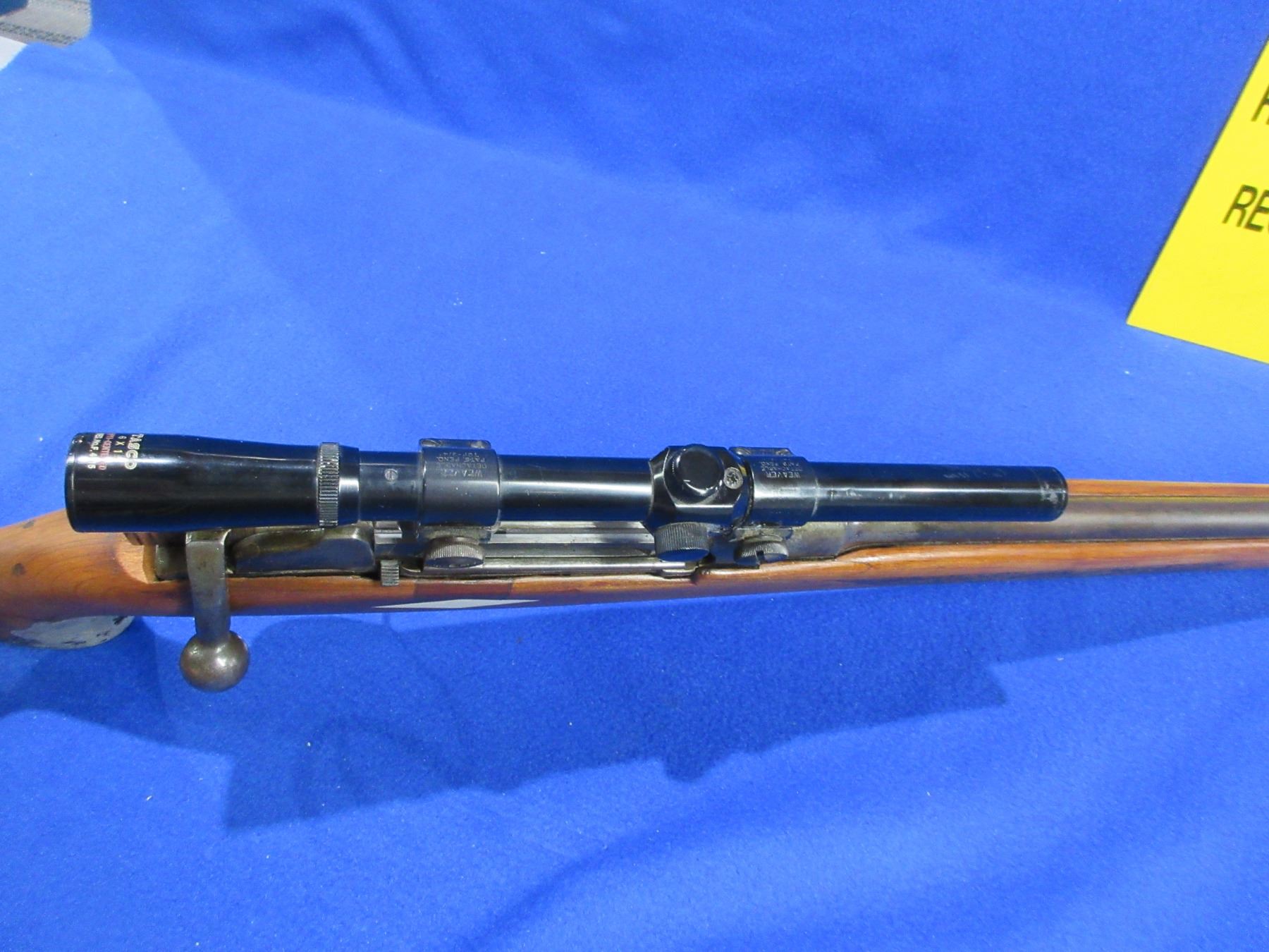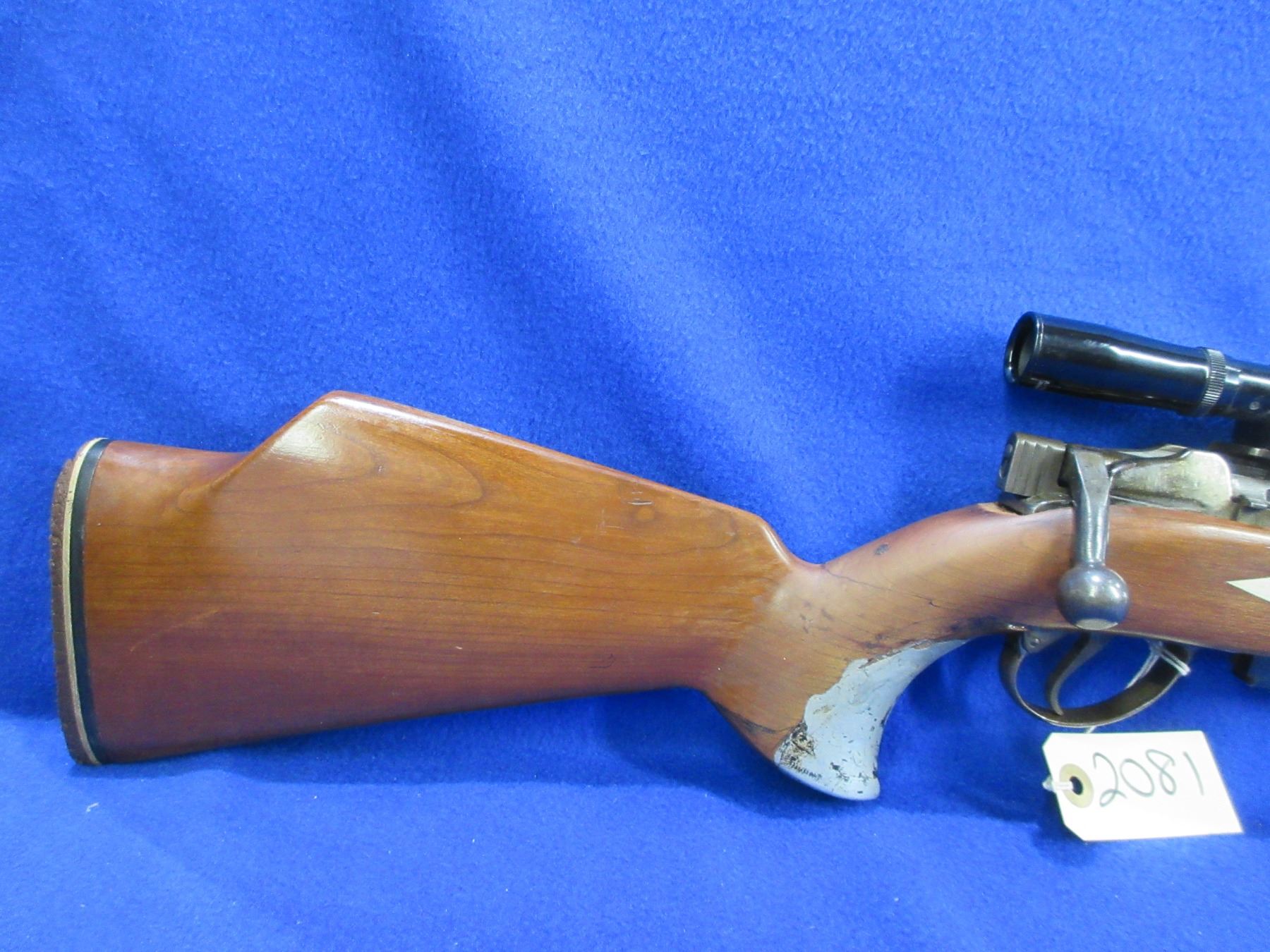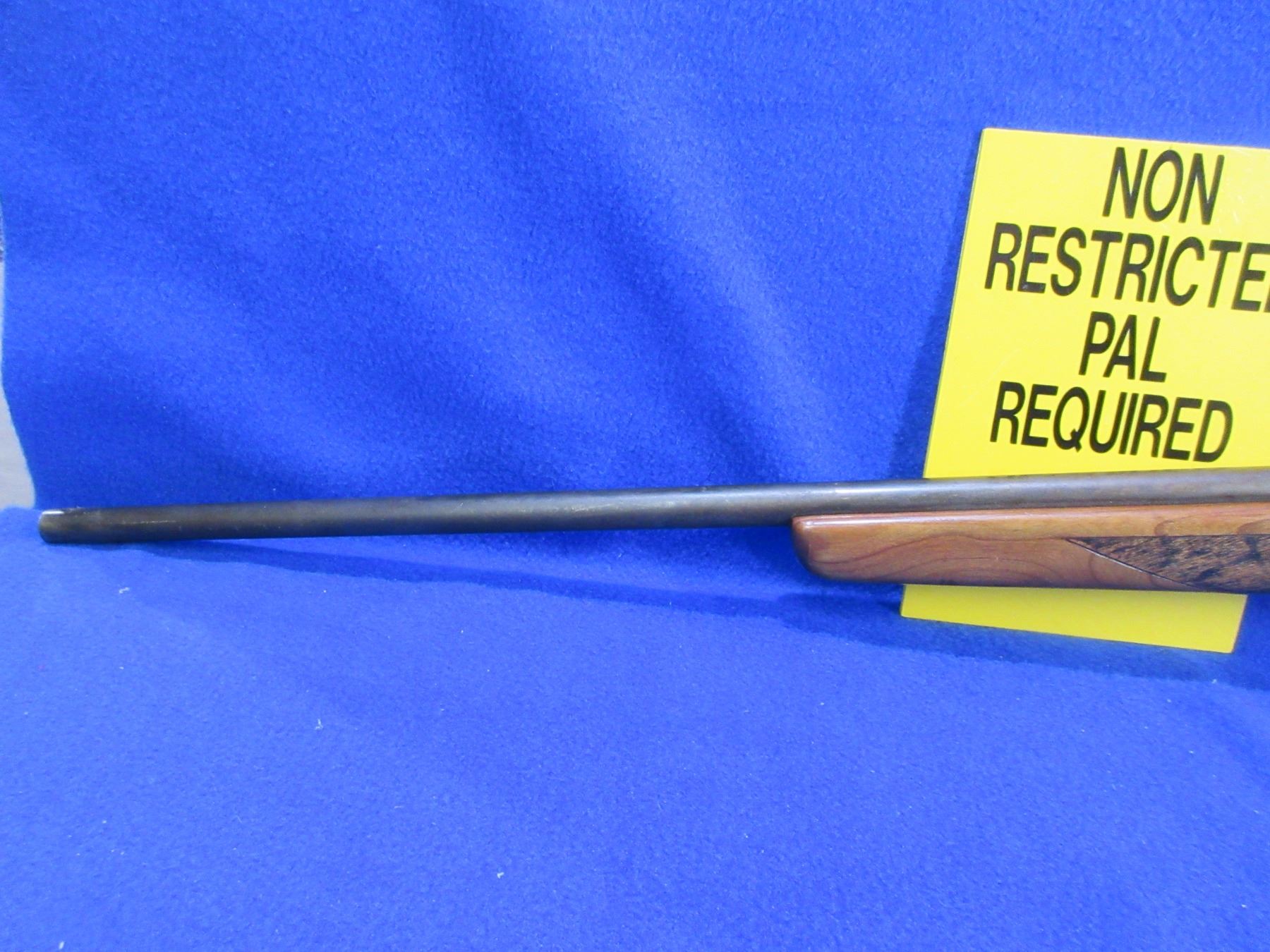 Non-Restricted - Lee Enfield No 4 Mk I Converted Rifle in 222 Rem - This is a bolt action rifle with permanantly installed magazine, action appears to be in working order. Barrel is 25", rifling is good, bluing has light pitting on barrel and is gone on the action, has no sights but has Weaver 3/4" rings and Tasco 6x15 scope - appears cloudy - standard reticle, stock has a major repair in the wrist area, length of pull is 13 1/2", butt plate poor, swivel studs are missing. Ser # None