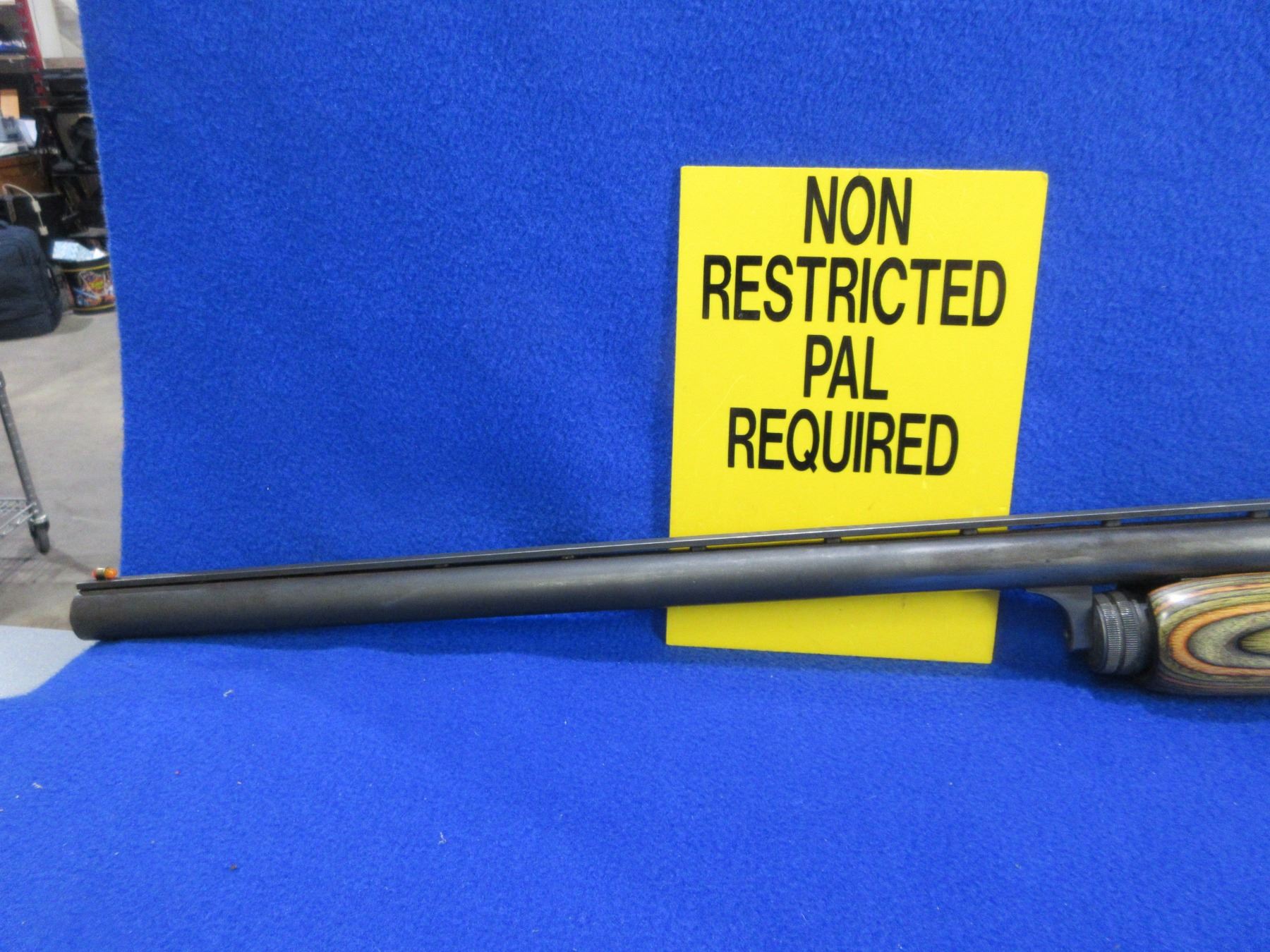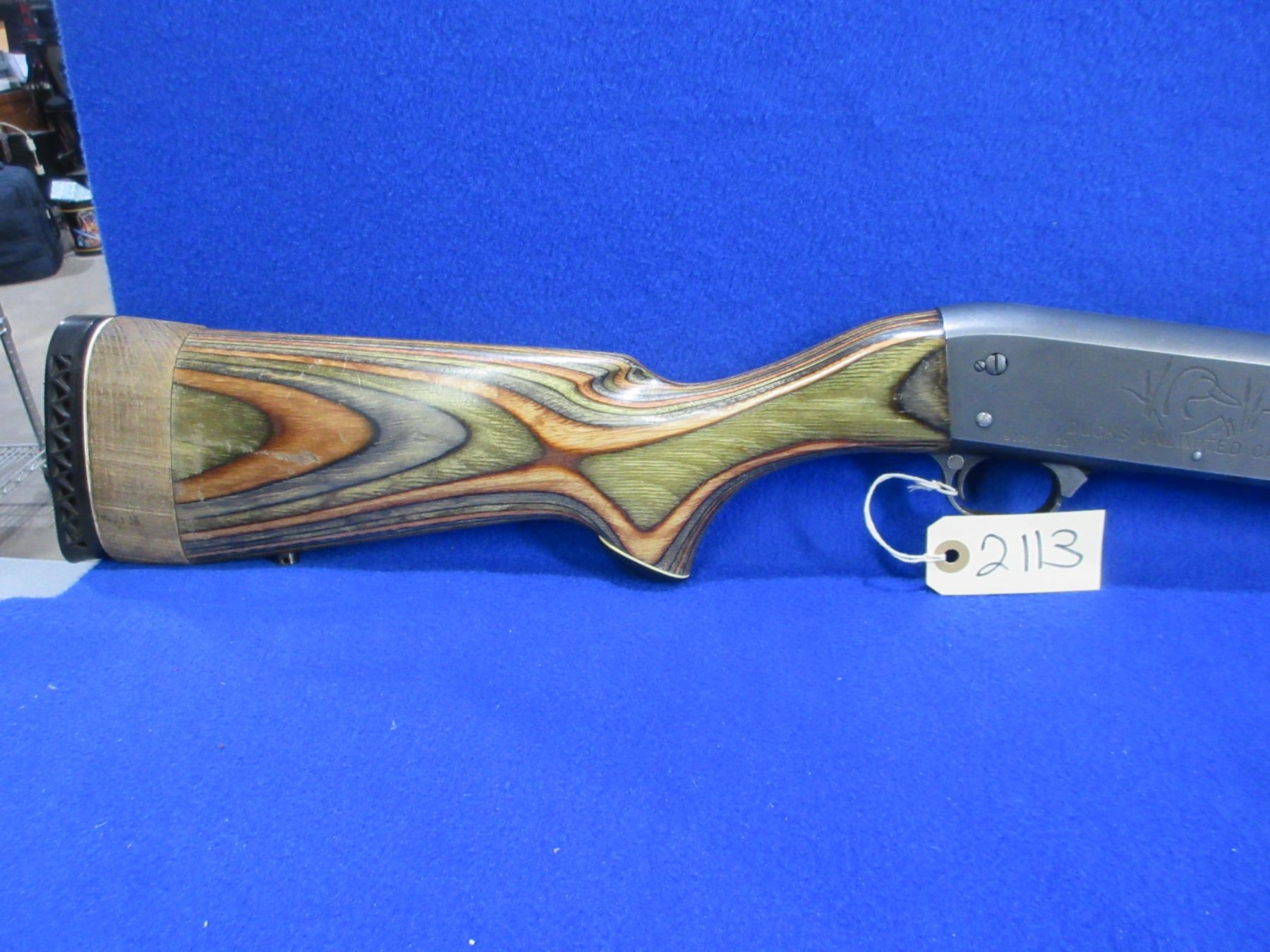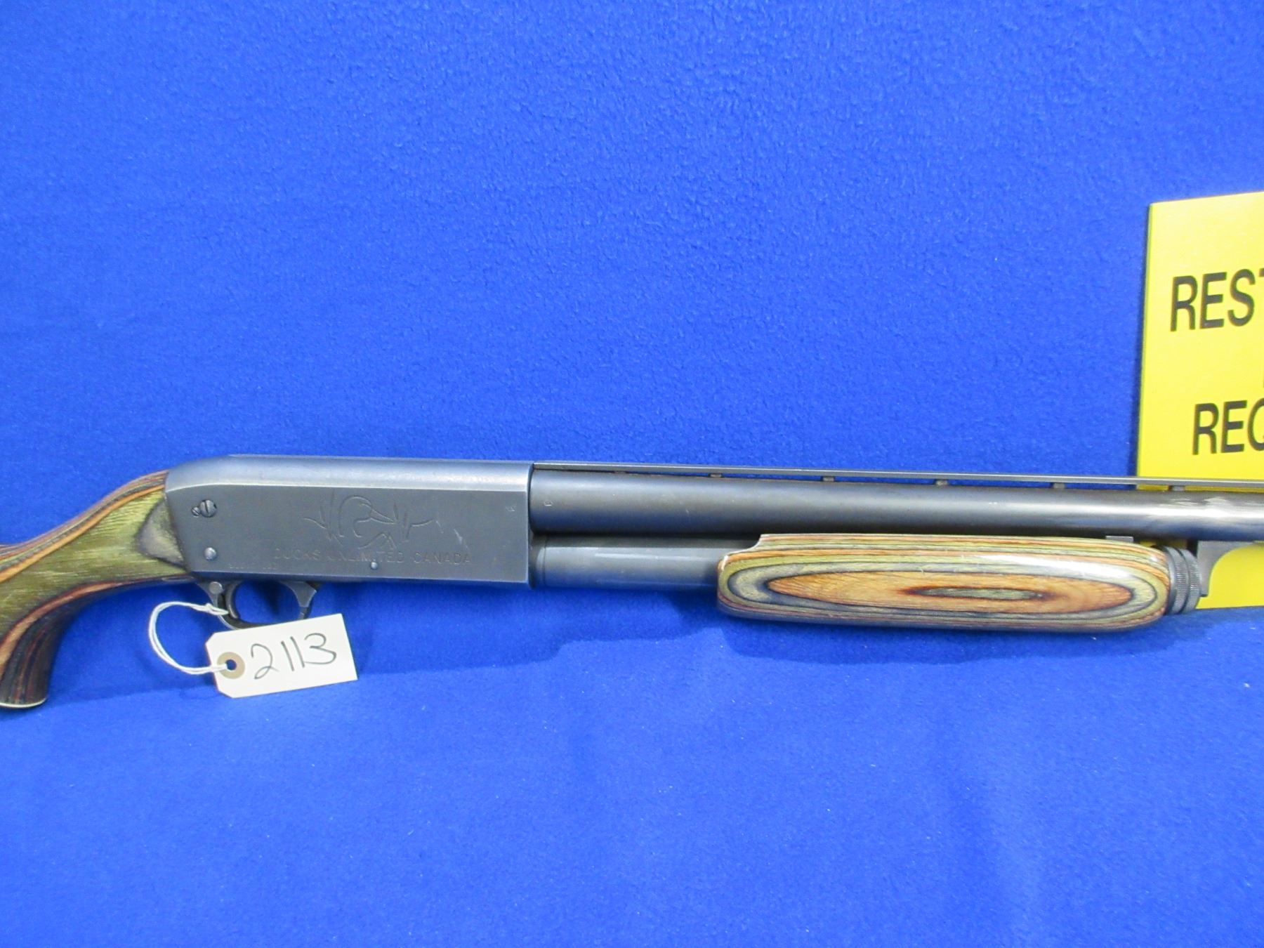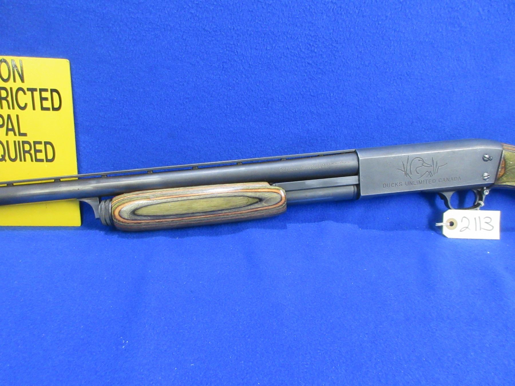 Non-Restricted - Ithica Model M87 in 12 Ga. 2 3/4, 3" - Ducks Unlimited Canada Edition. This is a pump action shotgun with tube magazine and removable choke, action appears to be in good working order but barrel is ringed approx 9" & 15" from the muzzle. Vent rib barrel is 30", bore is good but has two rings, bluing is good with some wear spots, has fiber optic front sight, laminated stock is good with usage marks and has been lengthened, forearm is good with usage marks, length of pull is 15 1/2", rubber recoil pad good, comes with rear swivel stud. Ser # 91DUC133