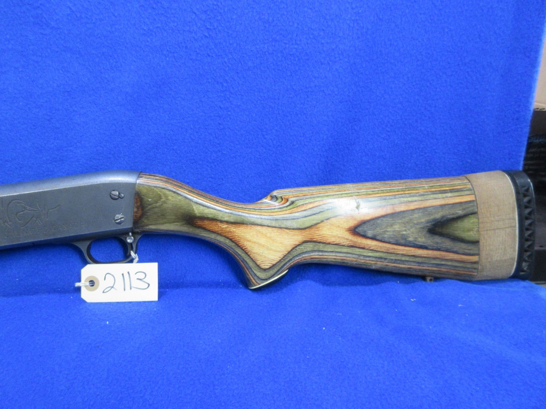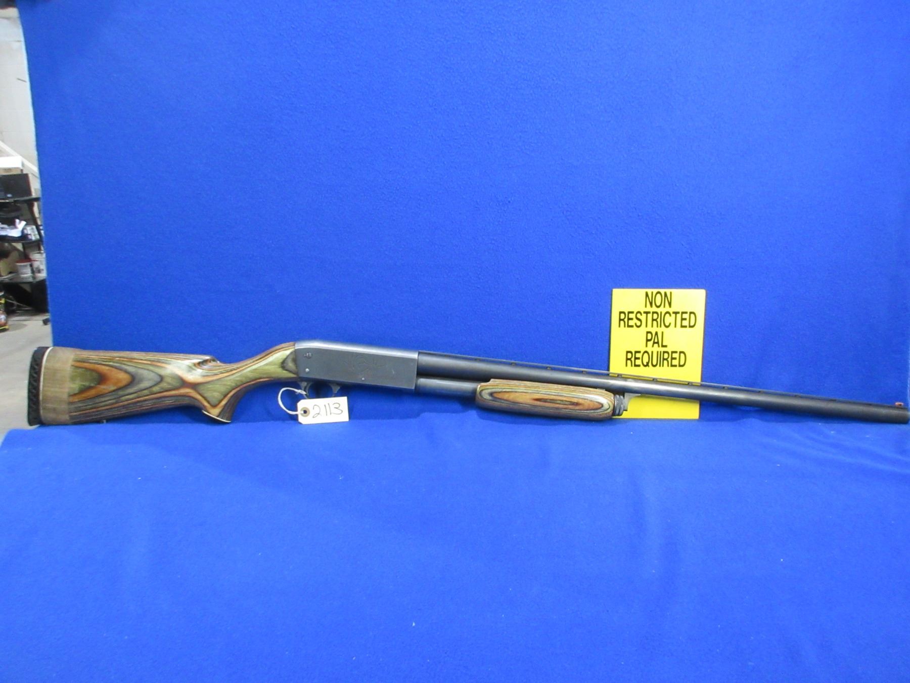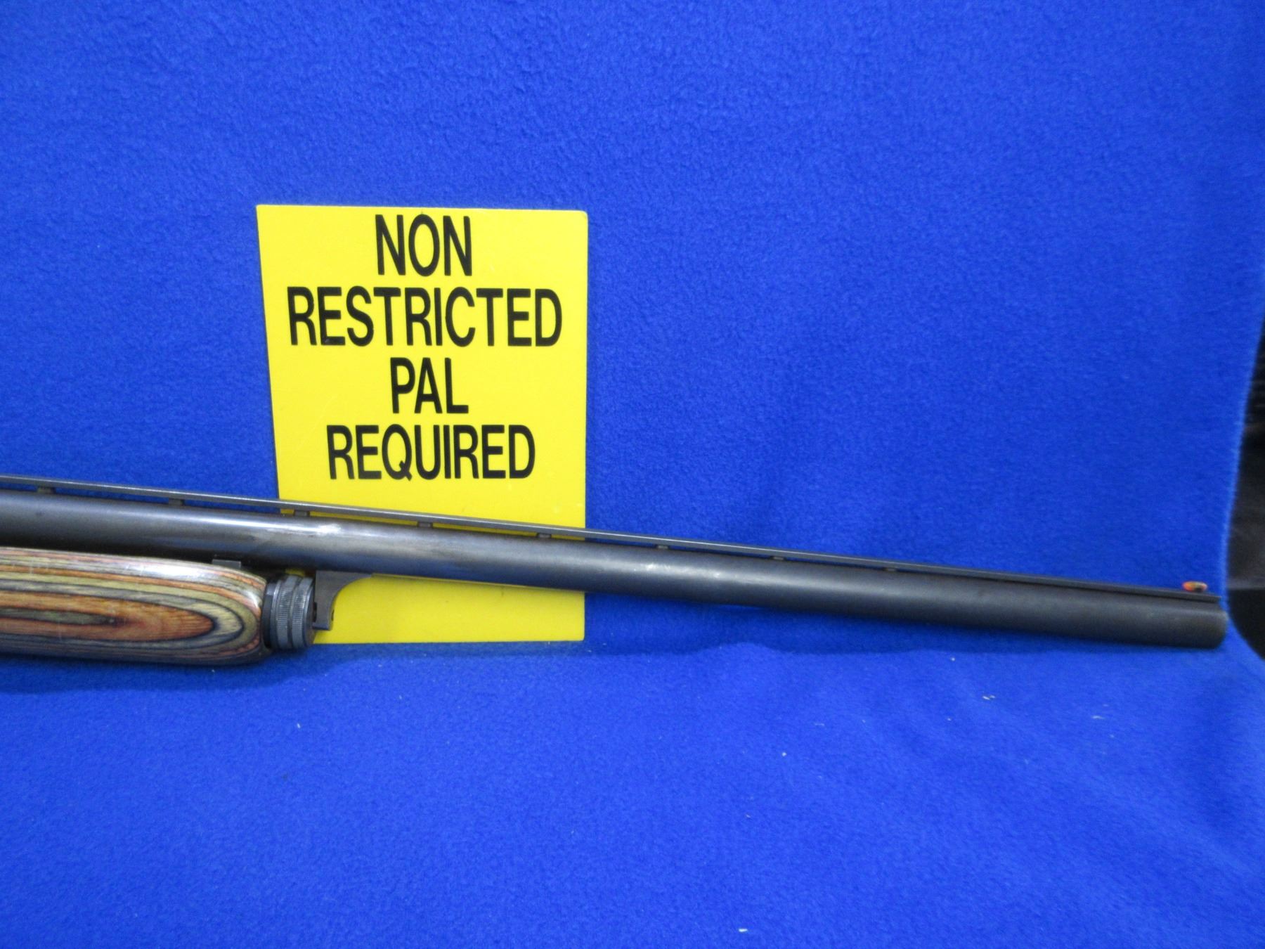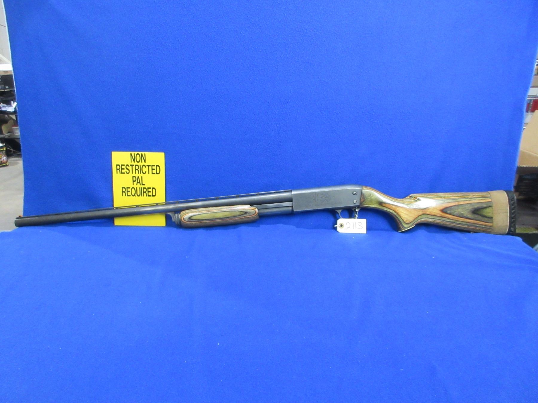 Non-Restricted - Ithica Model M87 in 12 Ga. 2 3/4, 3" - Ducks Unlimited Canada Edition. This is a pump action shotgun with tube magazine and removable choke, action appears to be in good working order but barrel is ringed approx 9" & 15" from the muzzle. Vent rib barrel is 30", bore is good but has two rings, bluing is good with some wear spots, has fiber optic front sight, laminated stock is good with usage marks and has been lengthened, forearm is good with usage marks, length of pull is 15 1/2", rubber recoil pad good, comes with rear swivel stud. Ser # 91DUC133