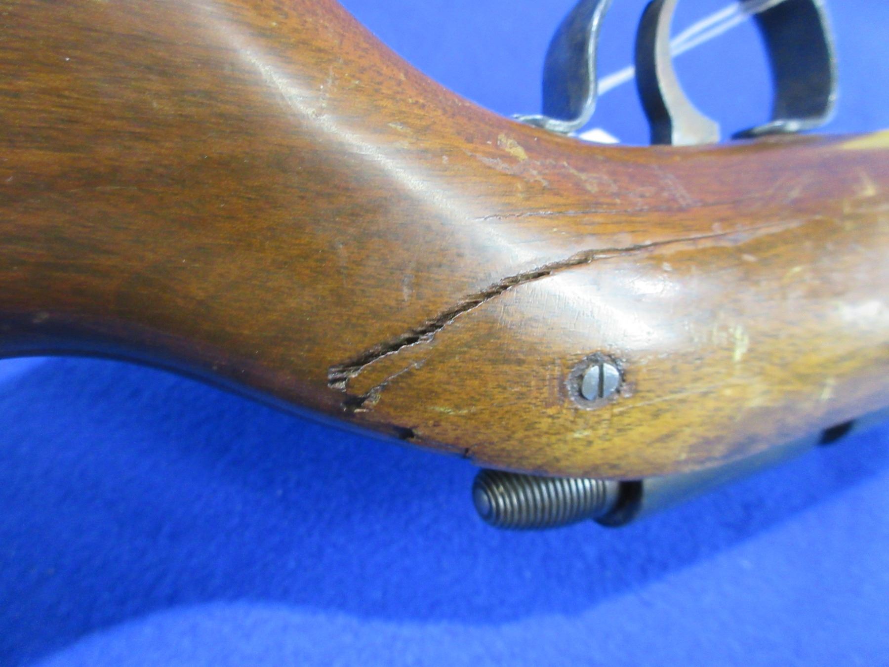 Non-Restricted - Remington Model 510 The Target Master in 22 S/L/LR - This is a single shot bolt action rifle, action appears to be in good working order. Barrel is 25", rifling is good to very good, bluing is good, has both sights, stock has a major crack repair in the wrist area, length of pull is 13 3/4", butt plate good. Ser # 20864