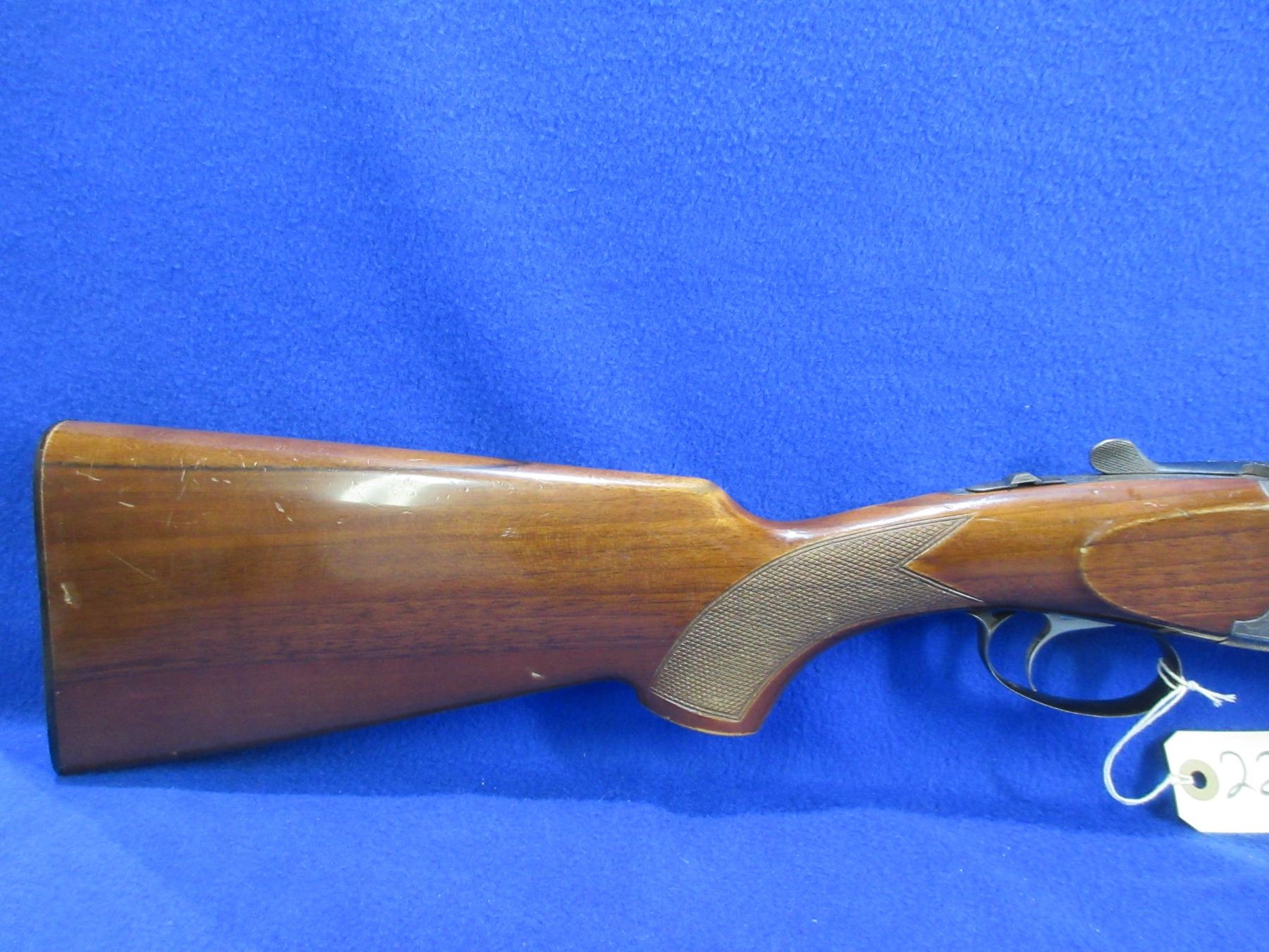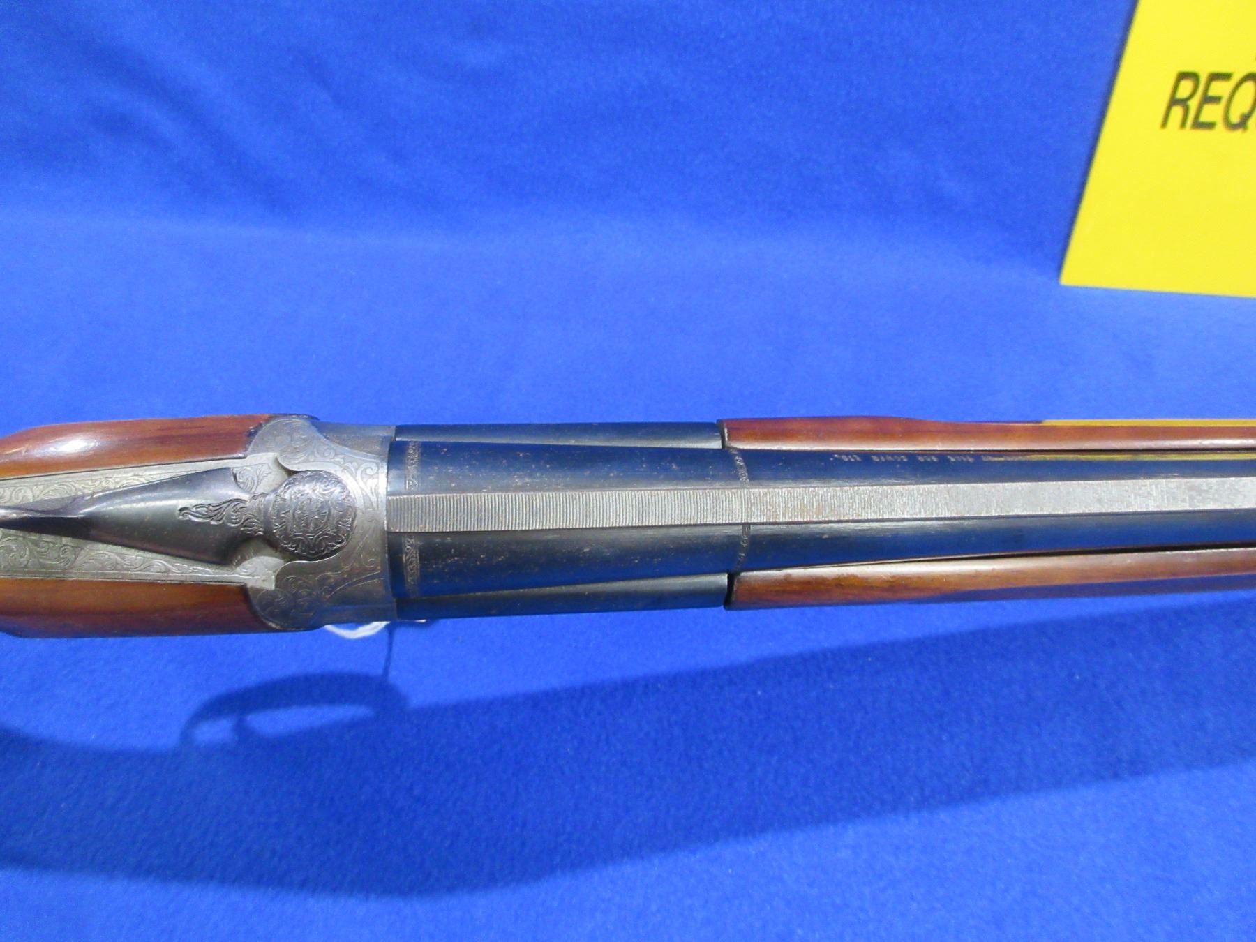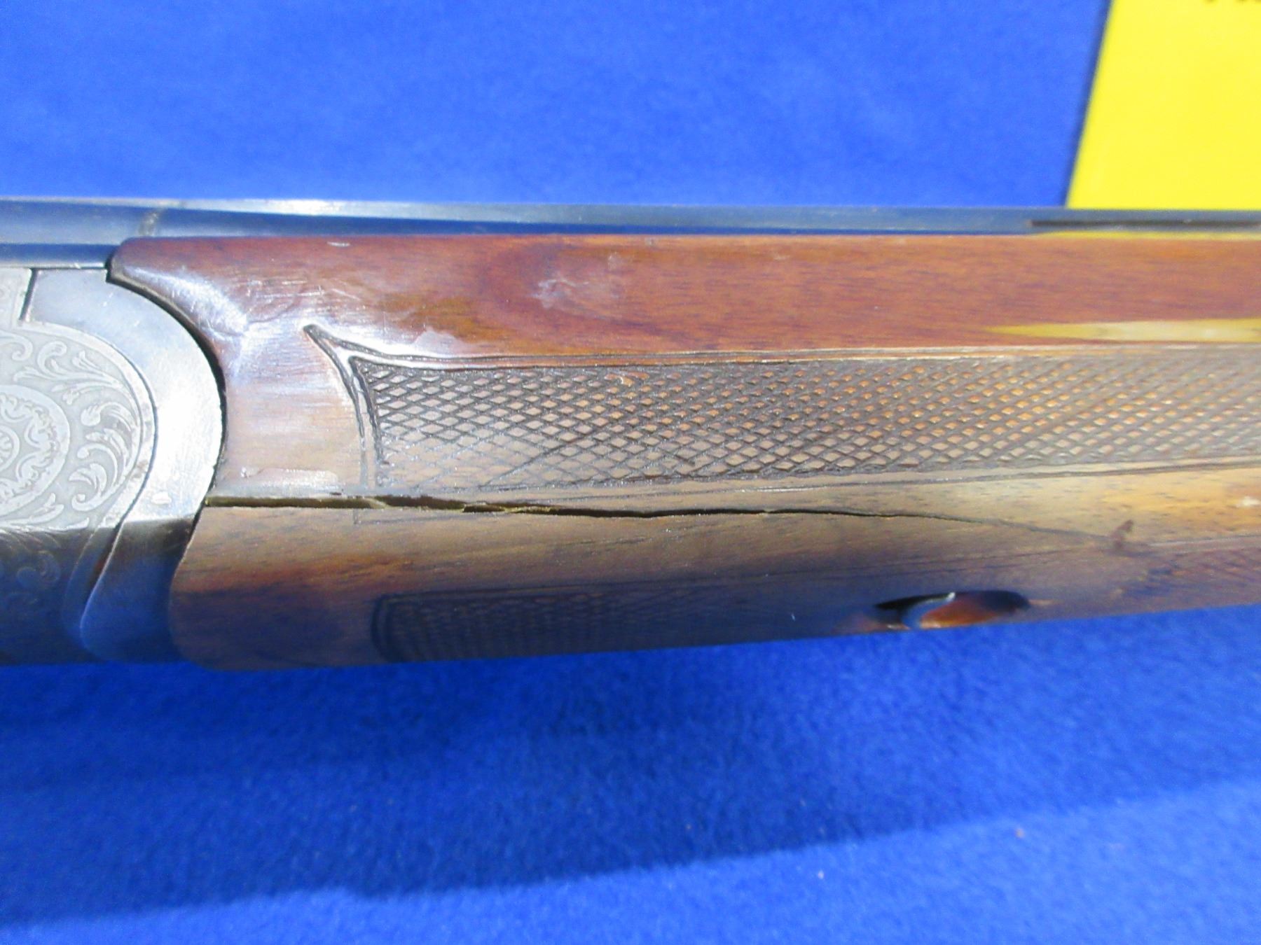 Non-Restricted - Fias Over/Under in 12 Ga. 2 3/4" - This is an over/under shotgun, nicely engraved action is tight and appears to be in good working order. Vent rib barrels are 27 7/8", bores are good to very good, bluing is good, has bead front sight, stock is good with usage marks, forearm has a large crack on the bottom, length of pull is 14", butt plate good. Ser # 87521