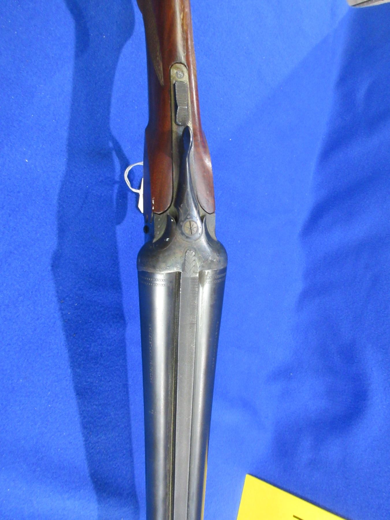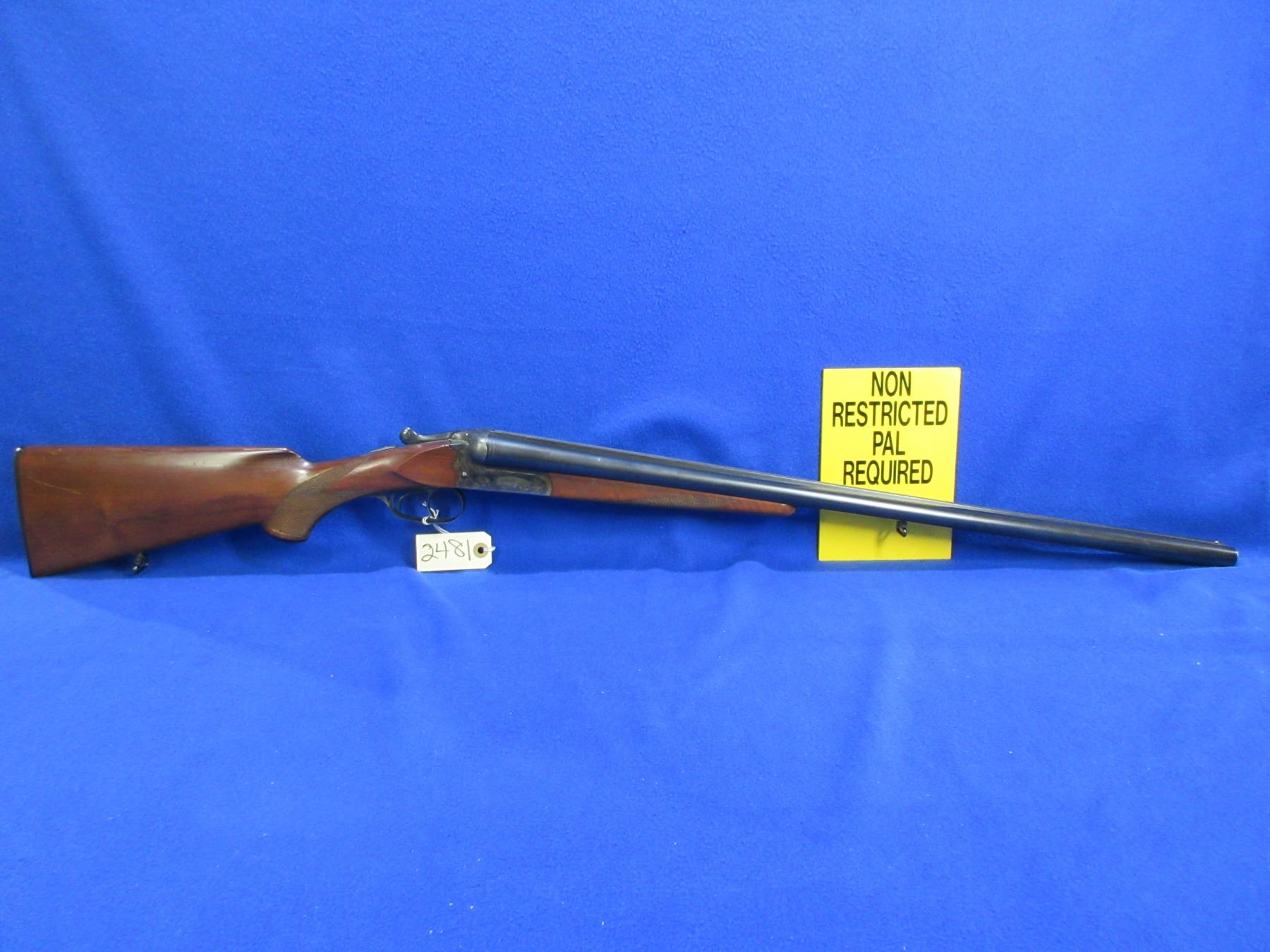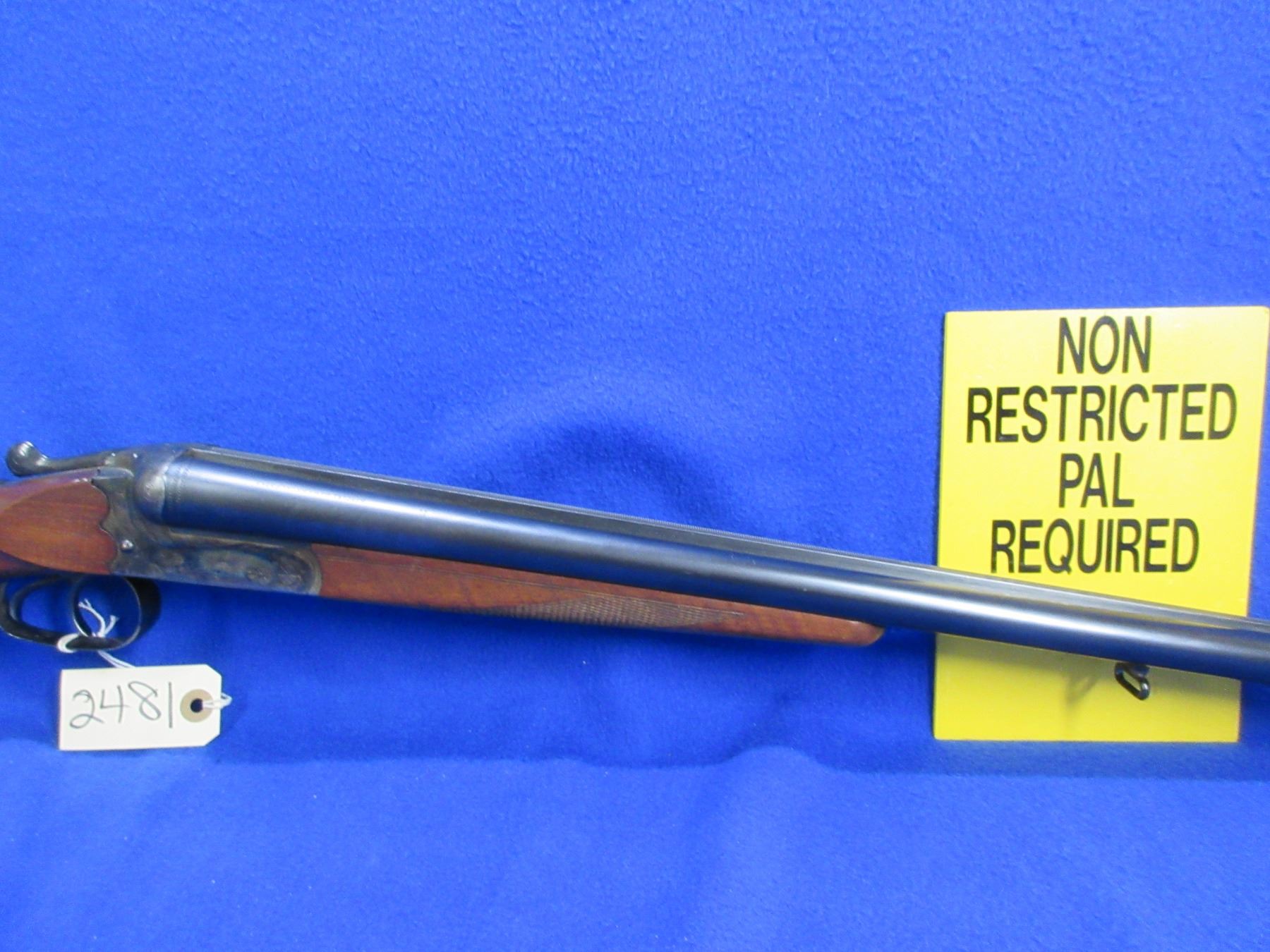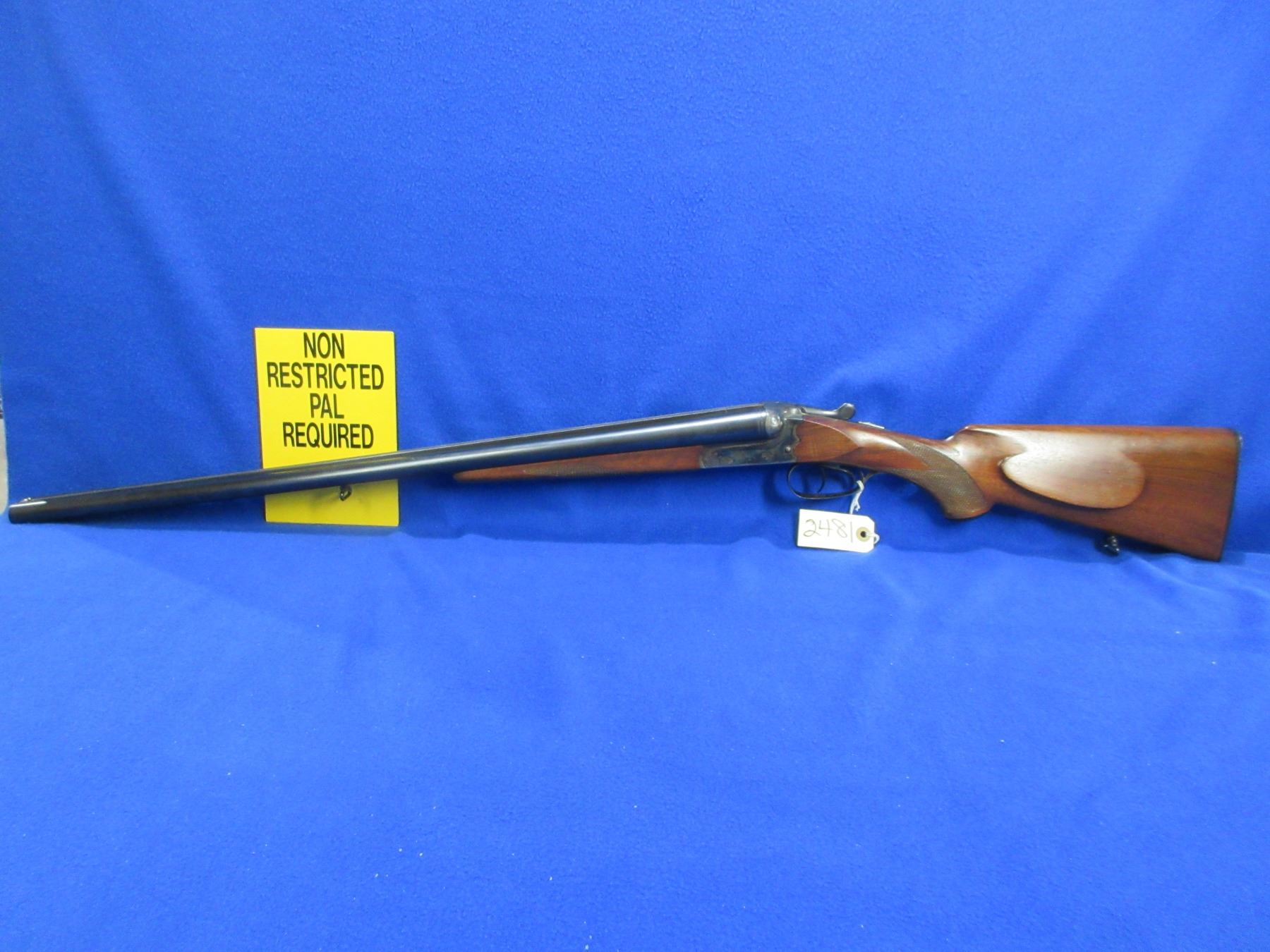 Non-Restricted - Merkel Model 8 in 12 Ga. 2 3/4"- This is a tip up SXS shotgun, case hardened action is tight and appears to be in good working order. Barrels are 28", bores are good, bluing is good, has bead front sight, stock has a crack behind the upper tang, forearm is good with usage marks, length of pull is 14 1/2", butt plate good, comes with swivels. Ser # 579634