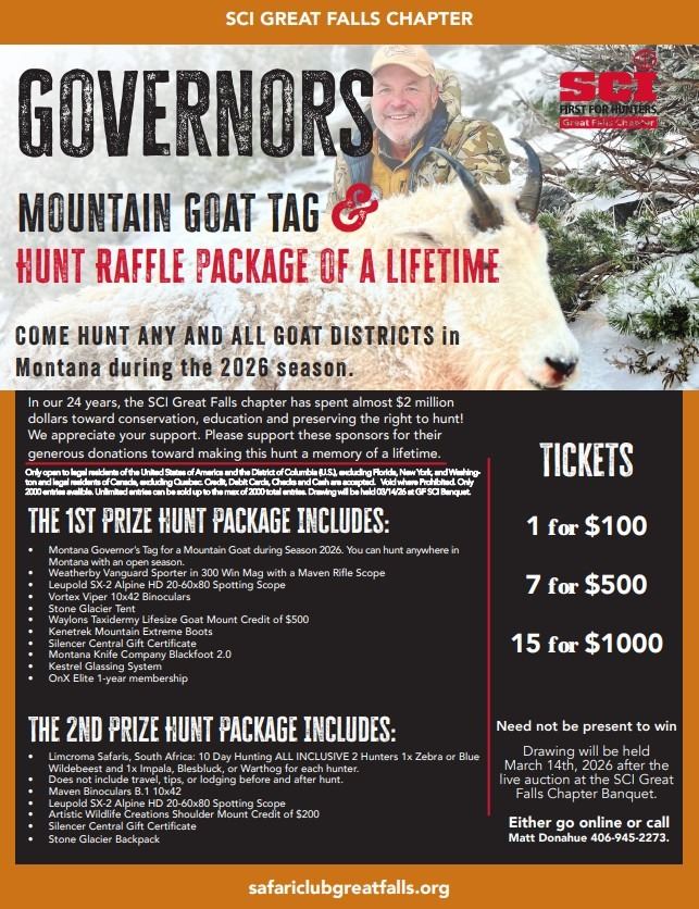 • Montana Governor’s Tag for a Mountain Goat during Season 2026. You can hunt anywhere in