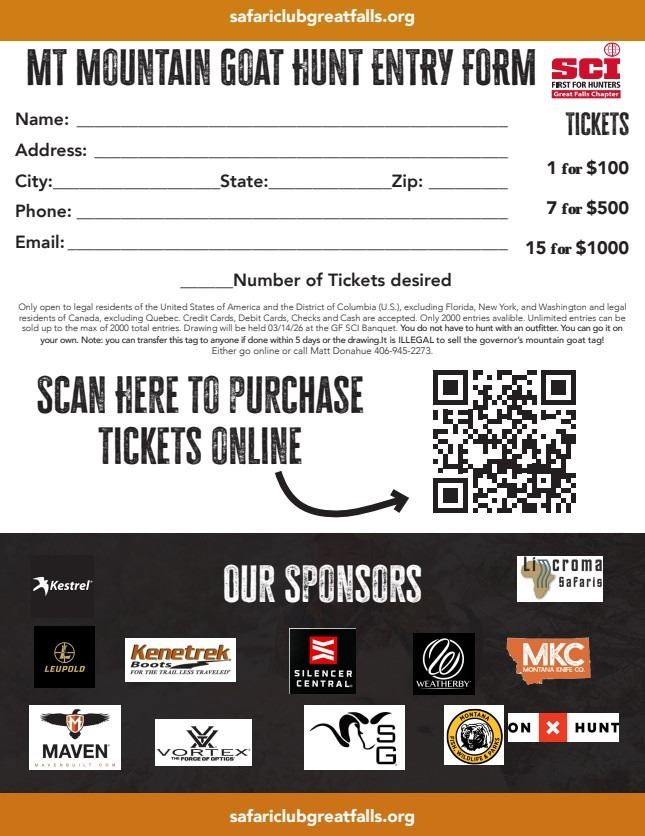 Get your tickets at www.safariclubgreatfalls.org or call Matt Donahue 406-945-2273