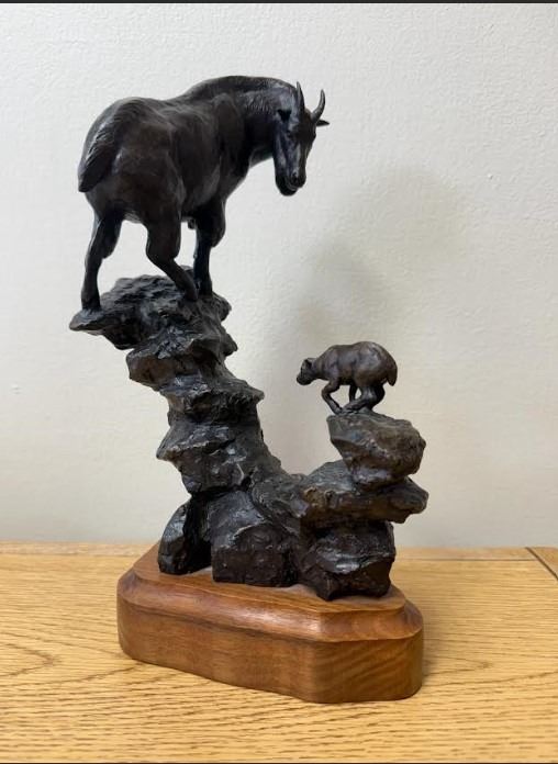 This is a limited-edition bronze by Ralph “Tuffy” Berg Jr. Tuffy was a famous Montana artist born in 1940. This mountain goat nanny and kid is a bronze that was sculpted for the 1987 CM Russel auction. This is number 10 in a limited edition of 51. The size is approximately 10” x 4”x 13” inches tall.