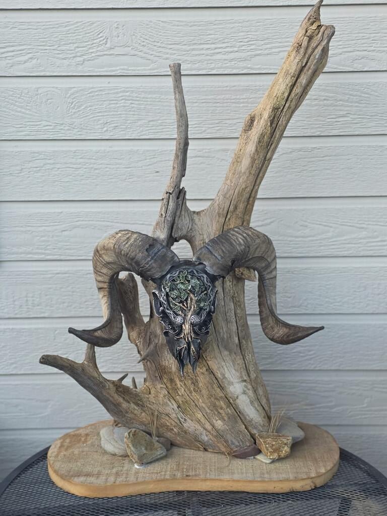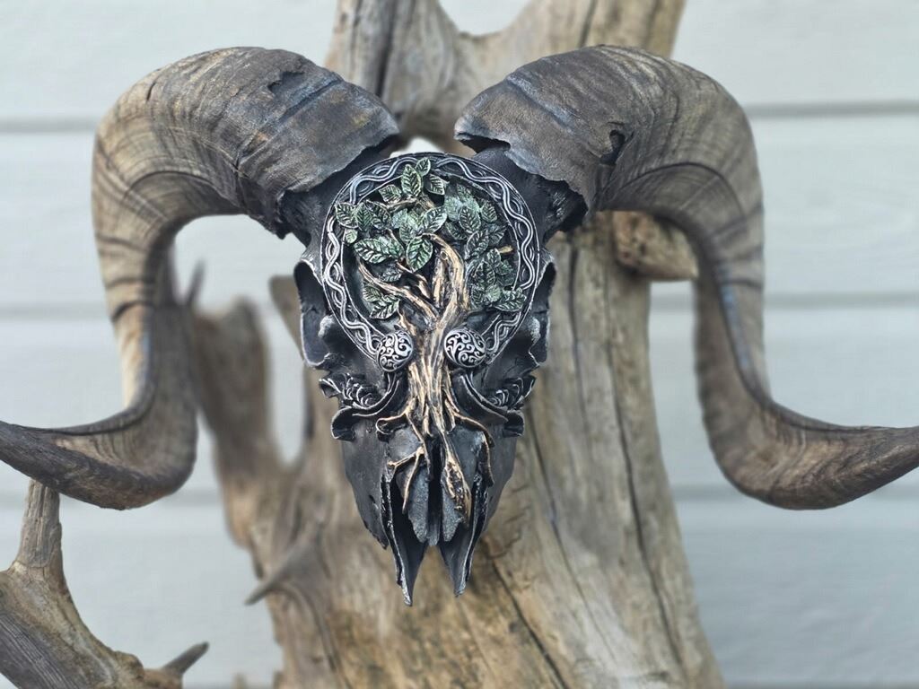 This original piece combines the strength of a ram skull with the timeless symbolism of the Tree of Life. The skull represents endurance and the passage of life, while the Tree of Life reflects renewal, growth, and the deep connection between all living things.
