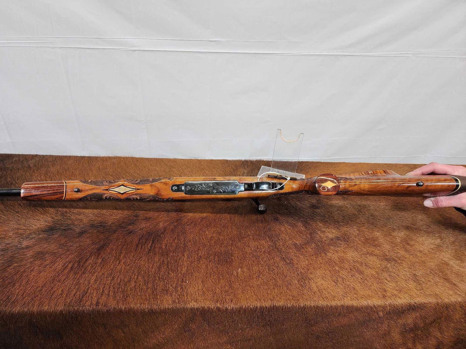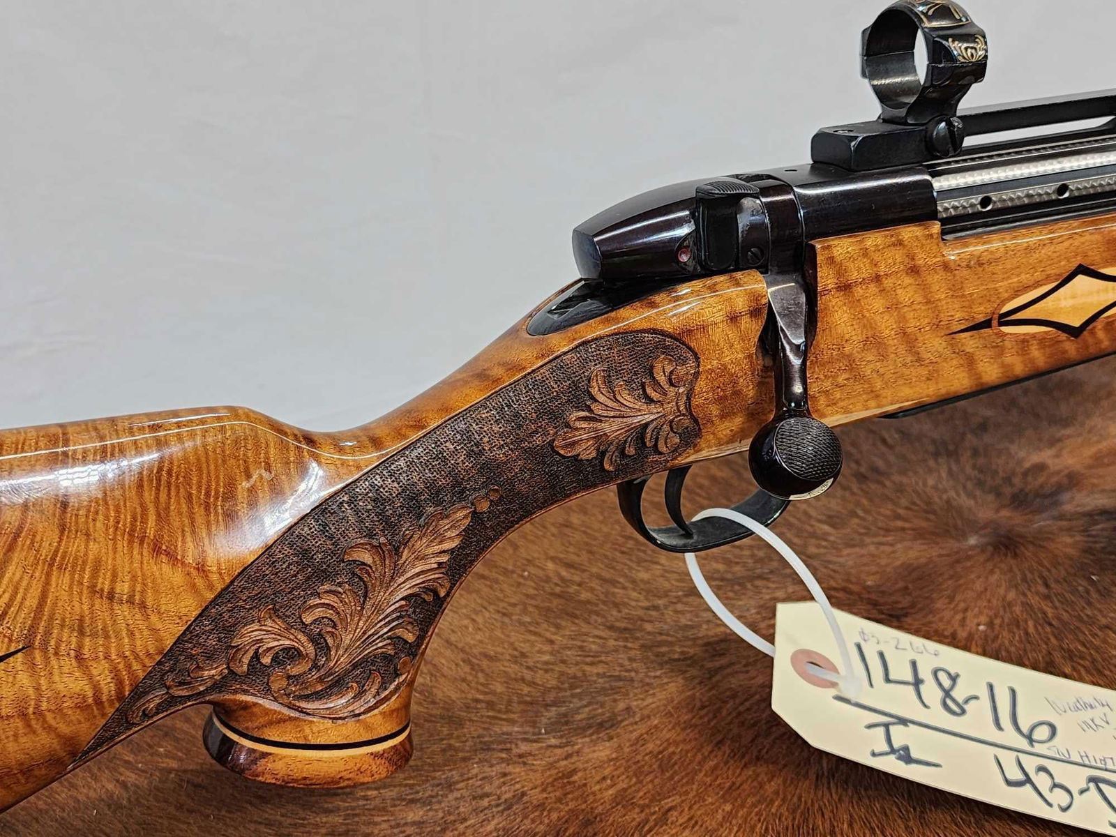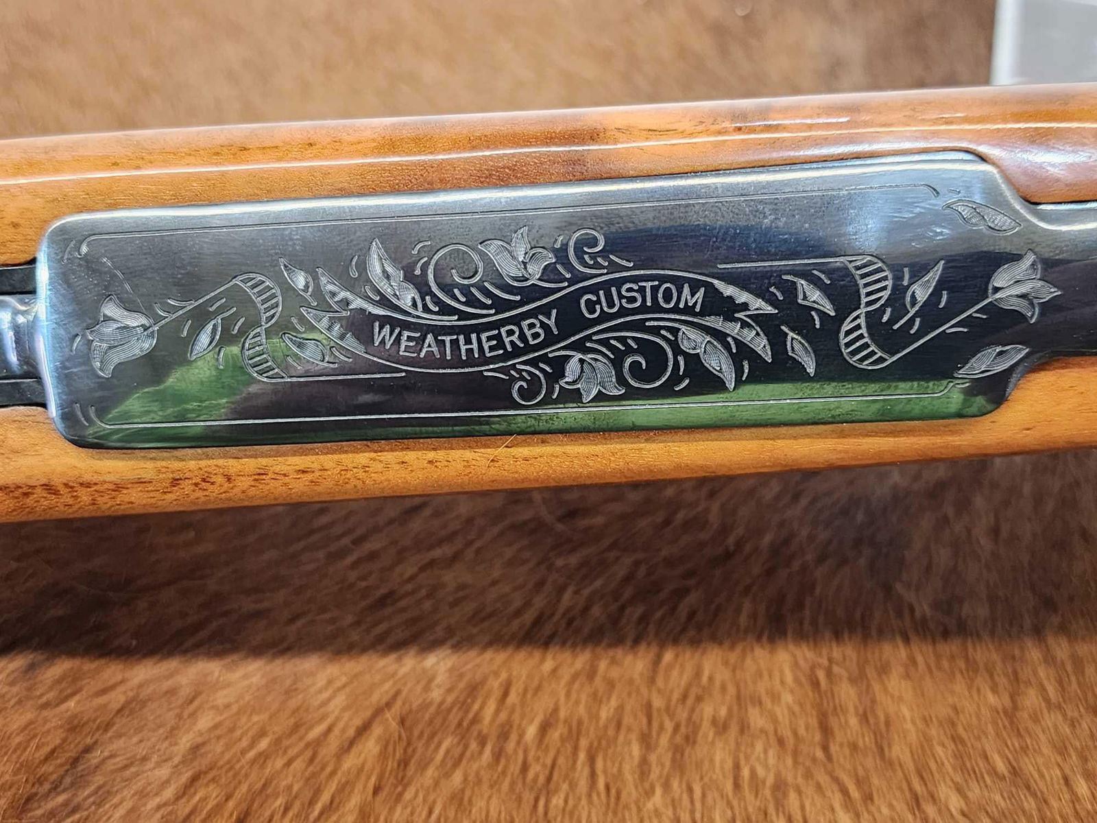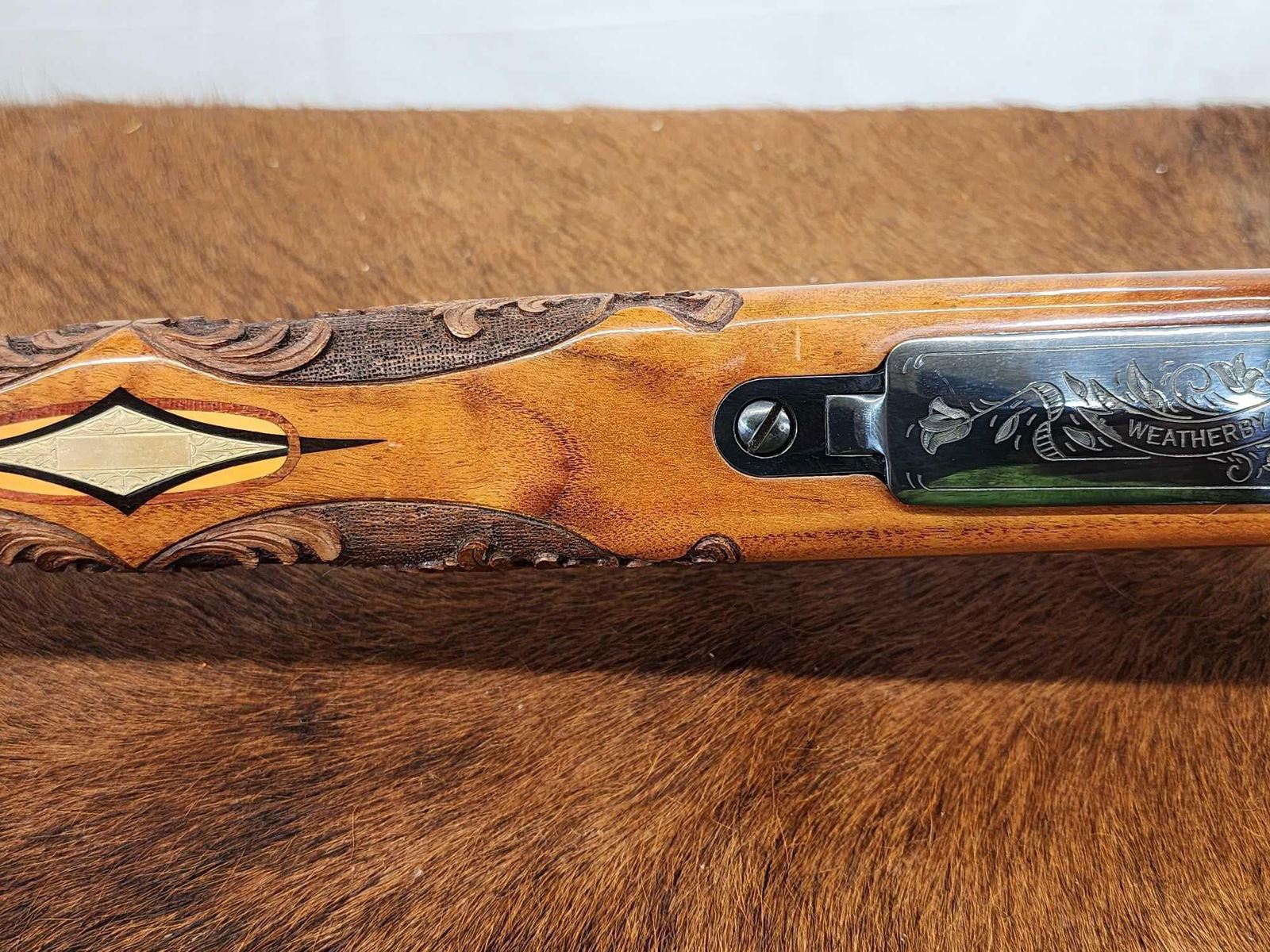 148.16 Pristine condition FANCY wood factory Weatherby Custom relief carved with ebony other inlays gold inlay scope rings 23.5" barrel this gun has seen VERY little if ANY use DEFINITELY A SHOW PIECE! SN H107445