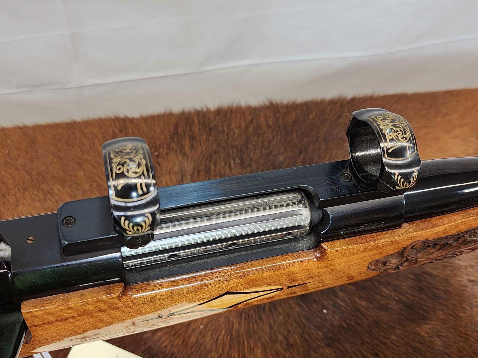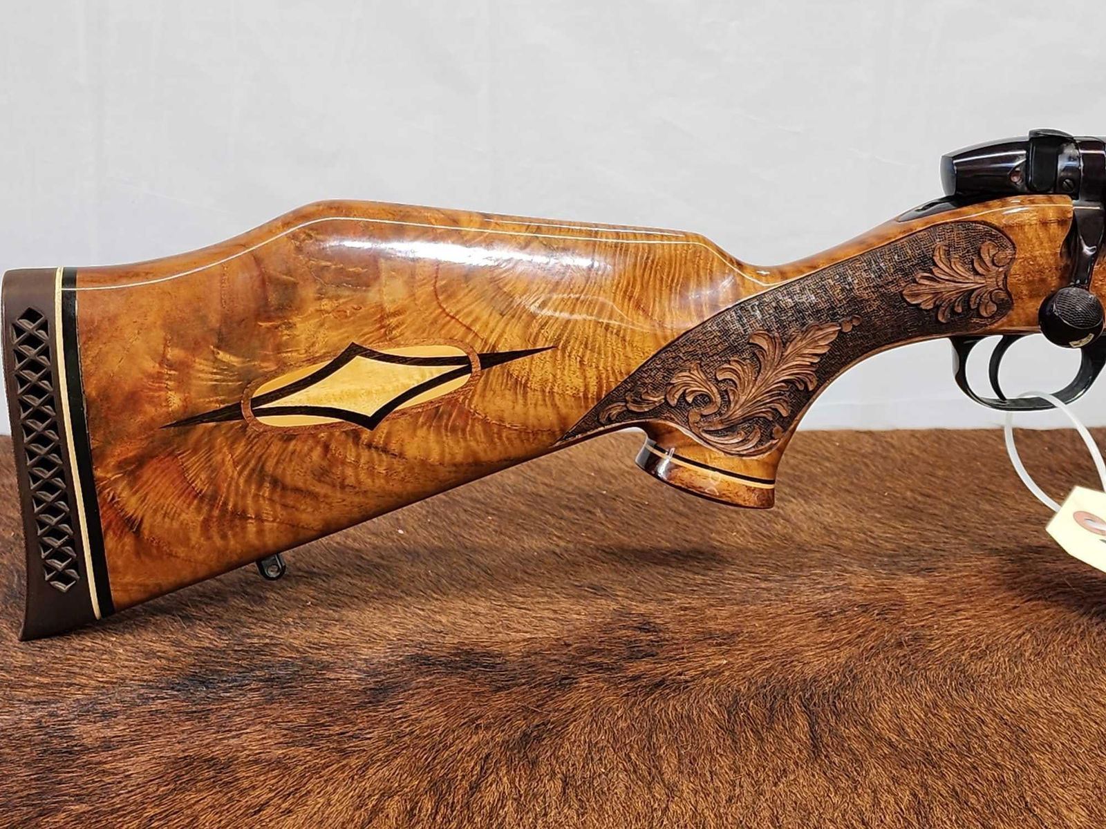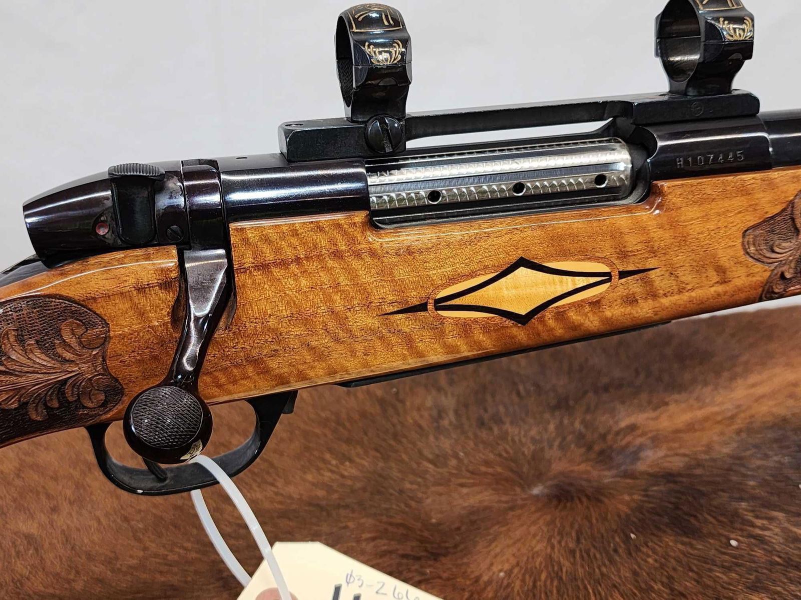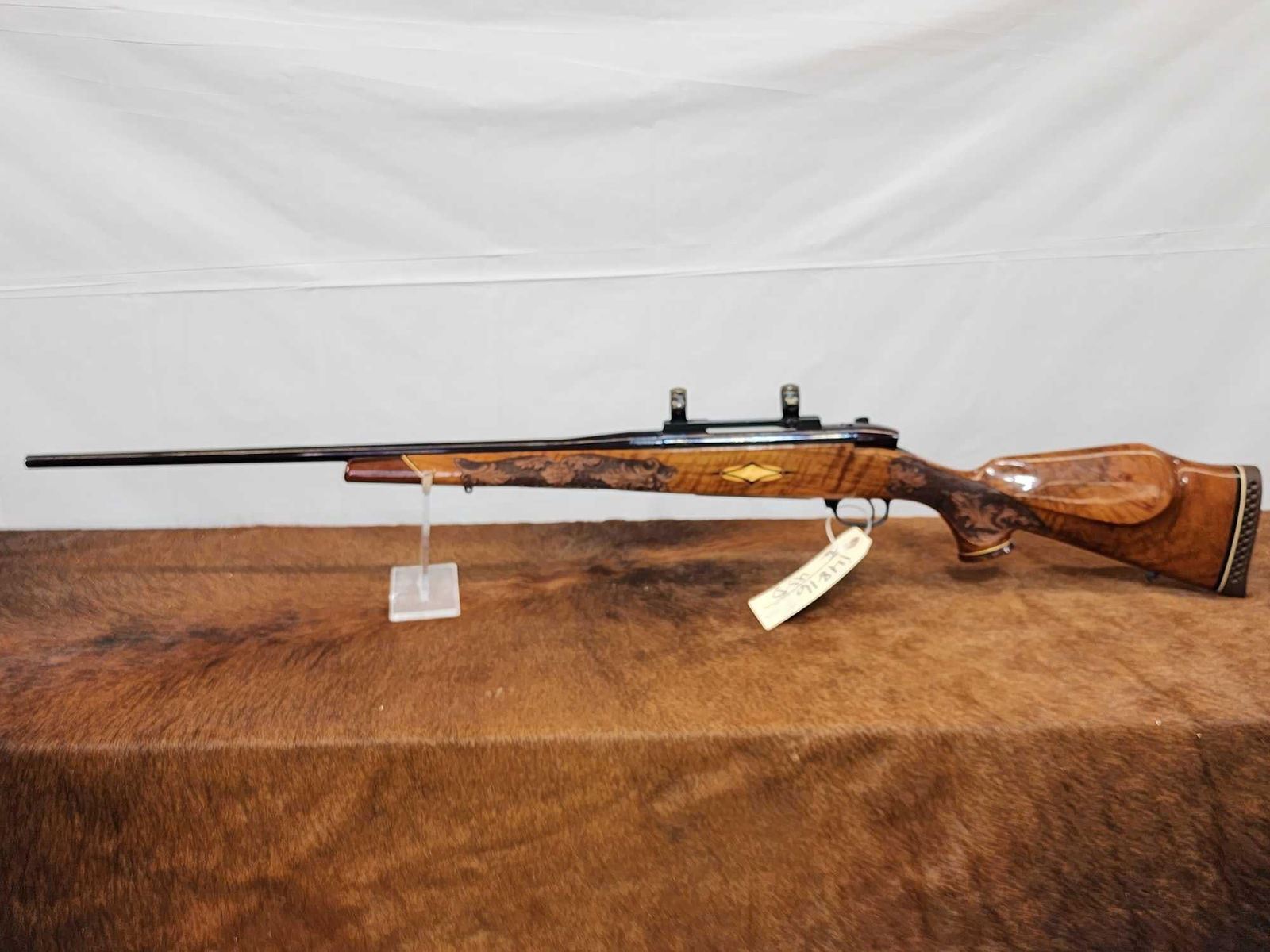 148.16 Pristine condition FANCY wood factory Weatherby Custom relief carved with ebony other inlays gold inlay scope rings 23.5" barrel this gun has seen VERY little if ANY use DEFINITELY A SHOW PIECE! SN H107445
