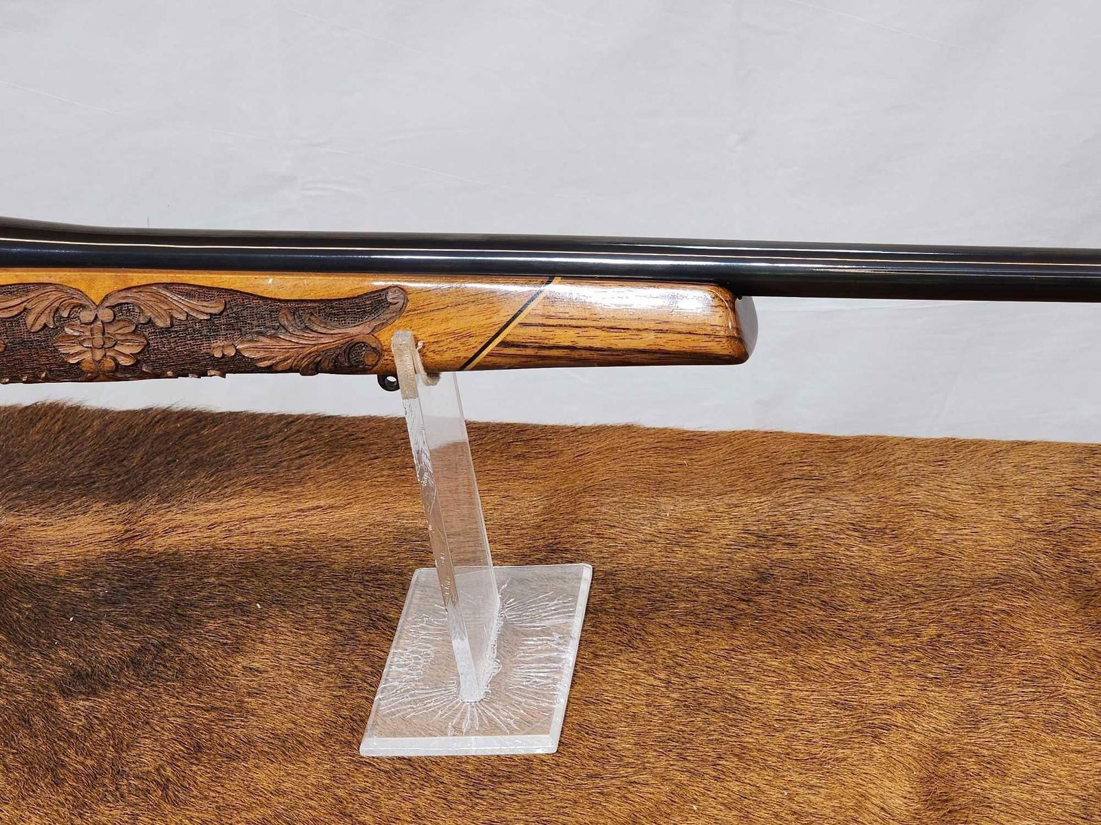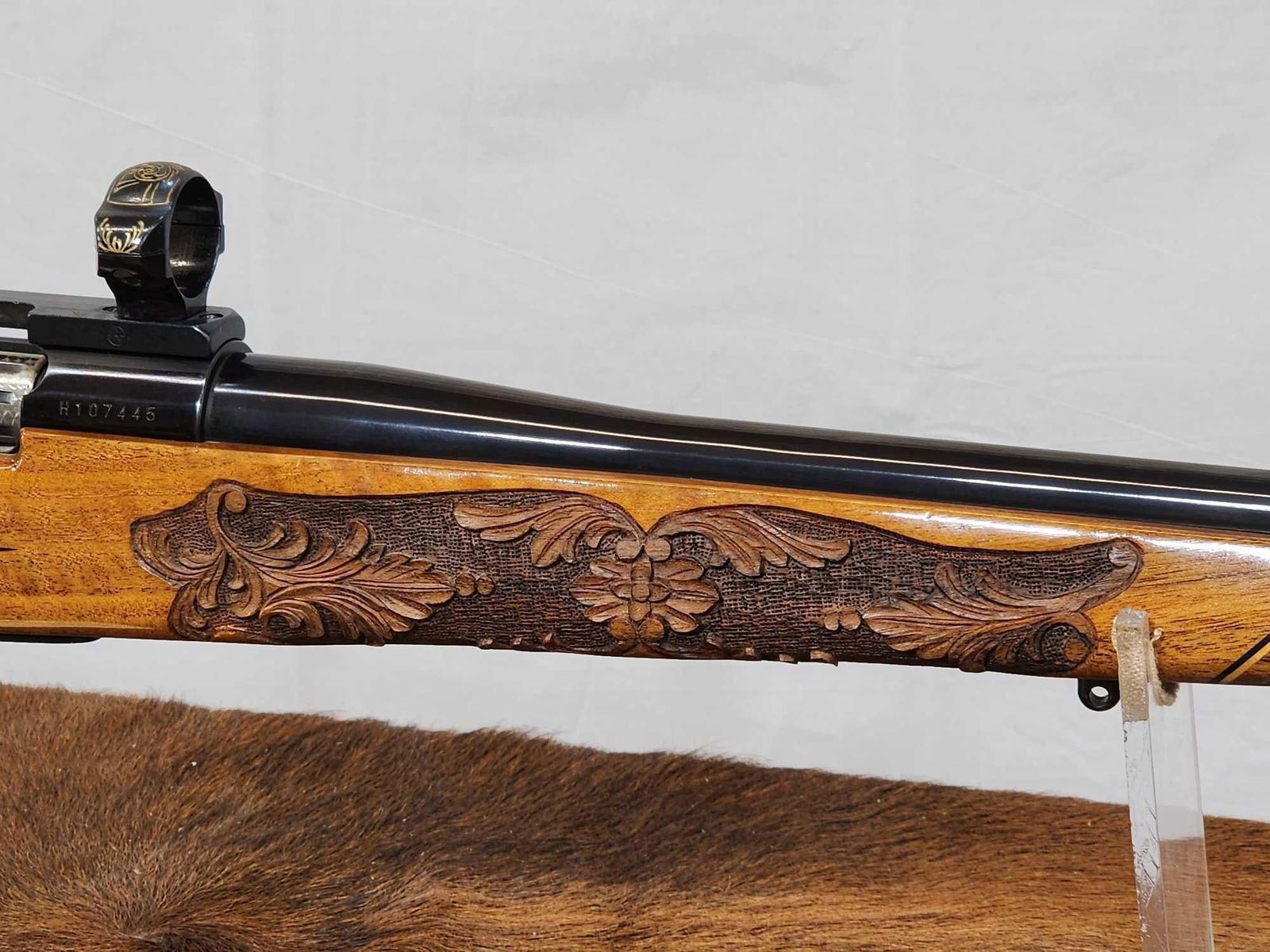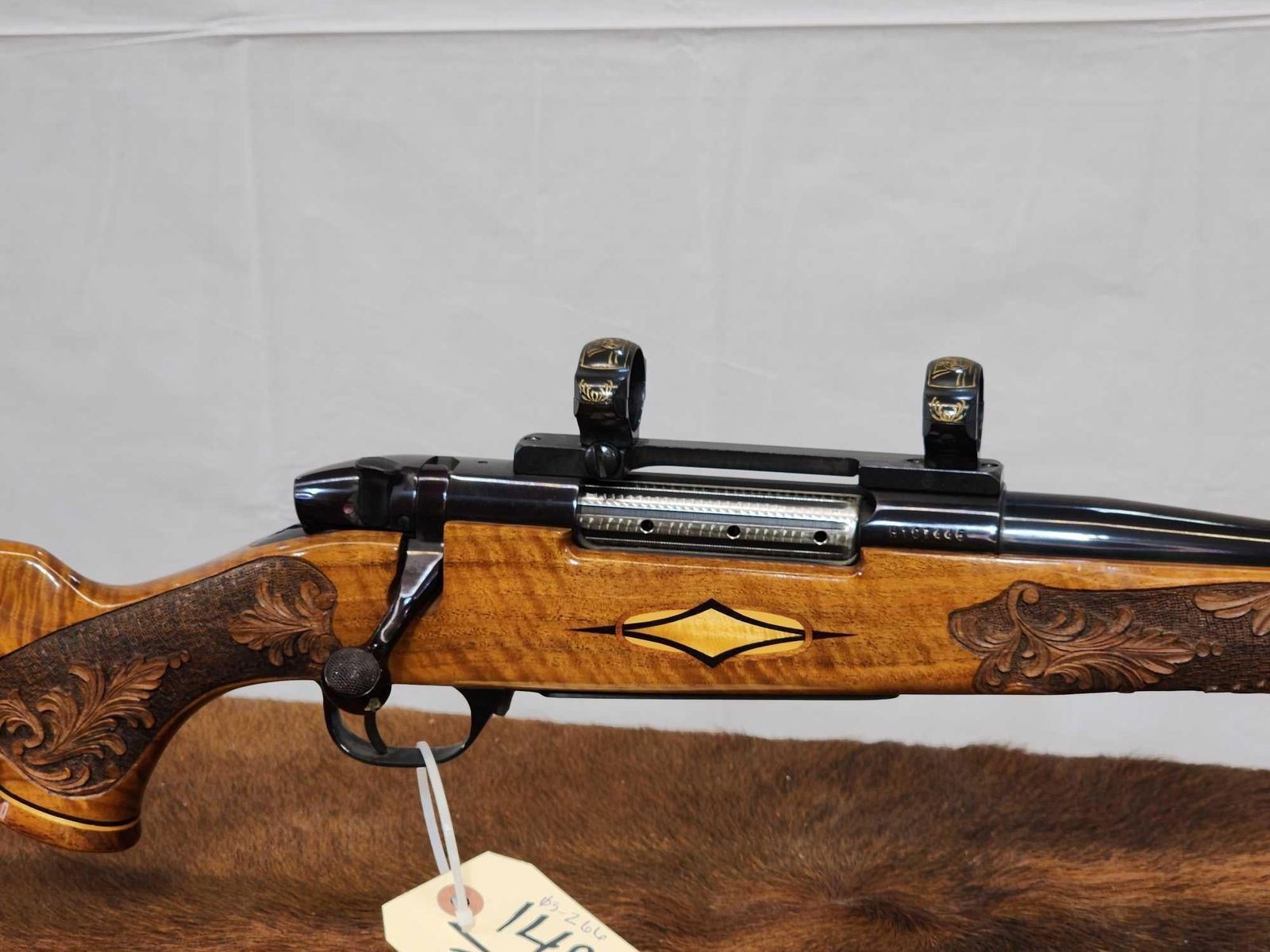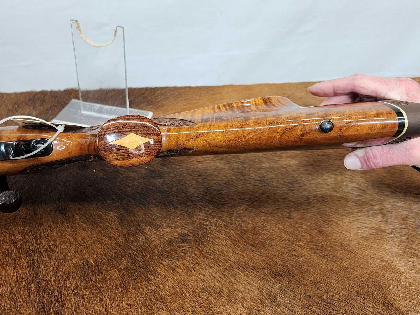 148.16 Pristine condition FANCY wood factory Weatherby Custom relief carved with ebony other inlays gold inlay scope rings 23.5" barrel this gun has seen VERY little if ANY use DEFINITELY A SHOW PIECE! SN H107445