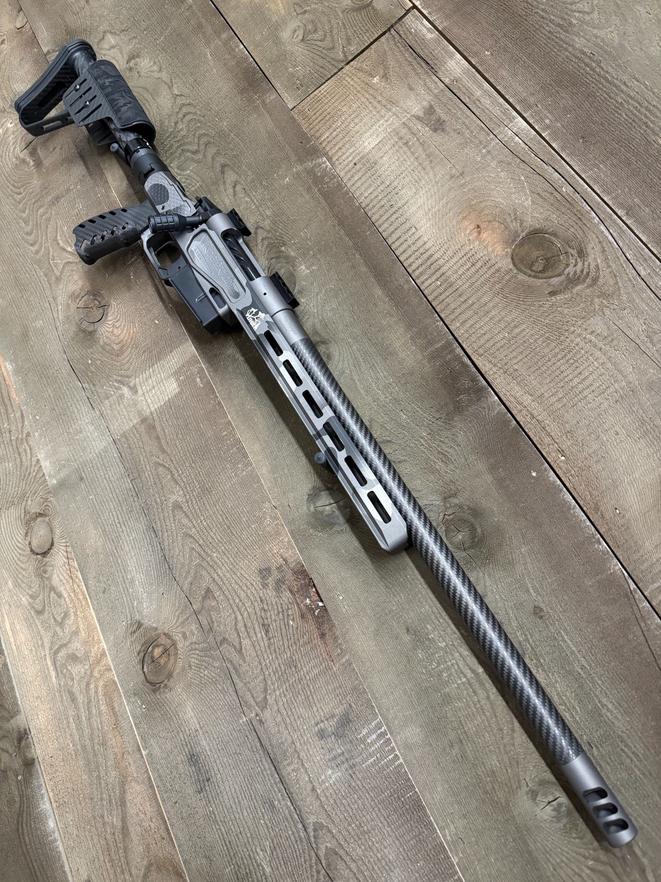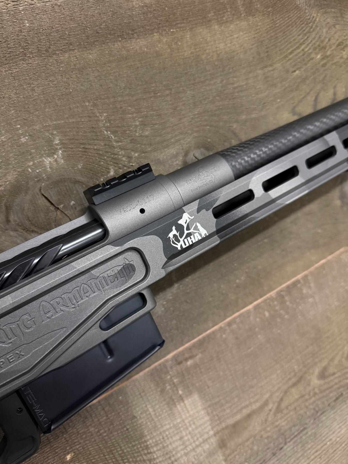 This Viking Armament APEX 6.5 PRC is a sight to see! It has a 20” Benchmark carbon fiber barrel with a 3 port brake. It also has Urban Safari Cerakote with custom UHA engraving. It includes a custom cut case. It weighs 6 pounds and retails at $6,200.