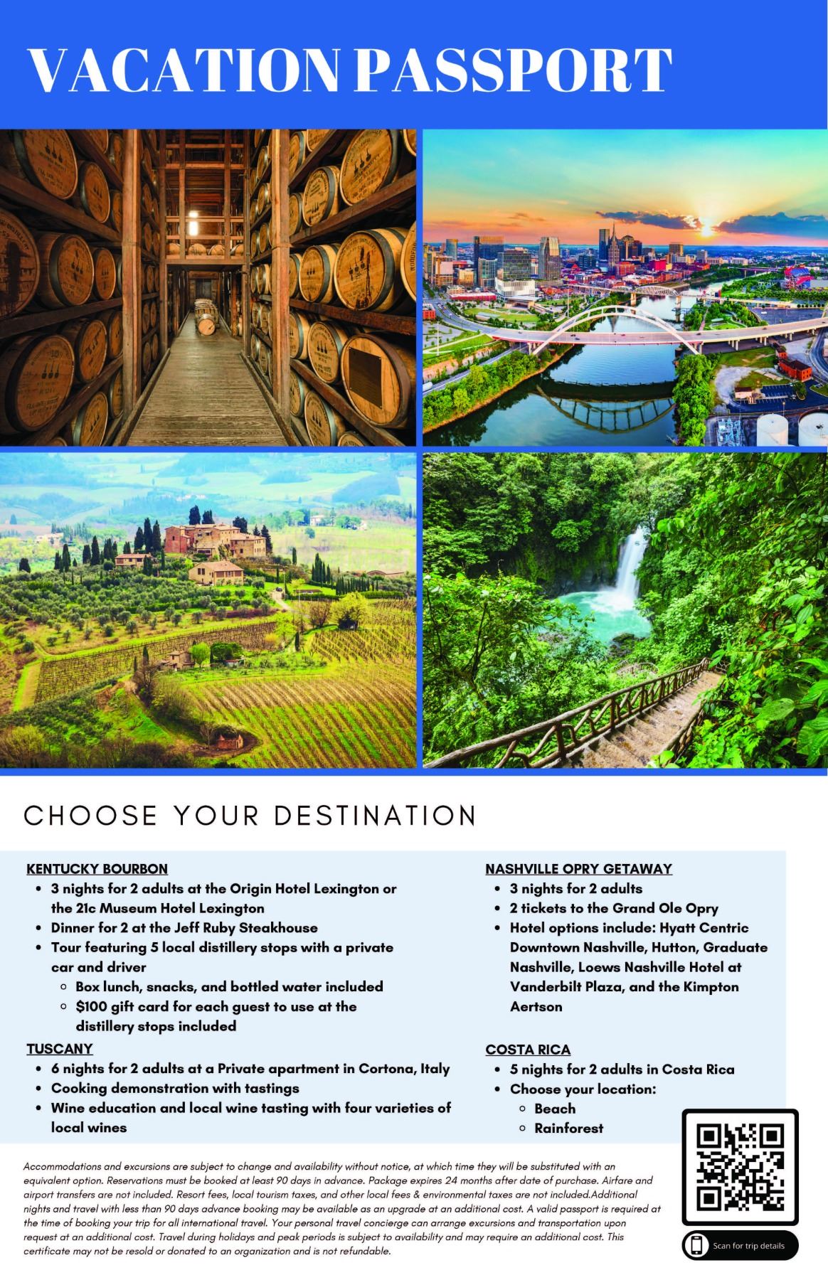 Embark on a journey of choice with our Vacation Passport, featuring four remarkable destinations designed to delight every traveler. Stroll through the rolling vineyards and timeless villages of Tuscany, where Italian cuisine and culture come alive. Explore the lush rainforests and pristine beaches of Costa Rica, a paradise for both adventure and relaxation. Experience the heart of bourbon country in Lexington, Kentucky, where rich heritage meets smooth, handcrafted flavor. Or head to Nashville for the Opry Getaway, where live music, Southern charm, and unforgettable performances make every night one to remember.