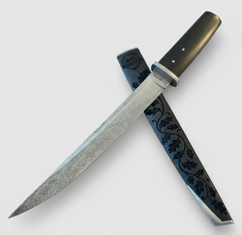 The knife is presented with a custom engraved wooden sheath, also fitted with Ebony wood accents, creating a cohesive and purposeful aesthetic. Both sides of the sheath are engraved with the SCI logo and Damascus USA logo, underscoring the collaborative nature of this exclusive donation. The guard and metal trim are crafted from Damascus steel as well, with detailed engraving that carries the pattern and craftsmanship throughout the entire piece. Final engraving and finishing are currently underway, ensuring the completed knife reflects Damascus USA’s exacting standards.