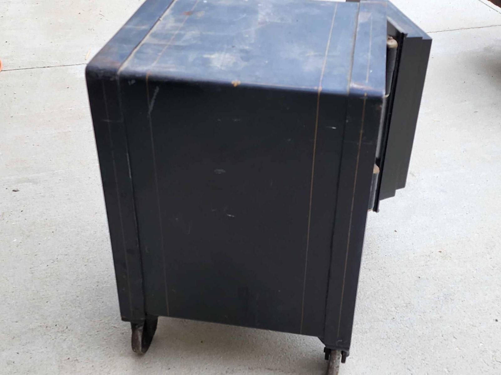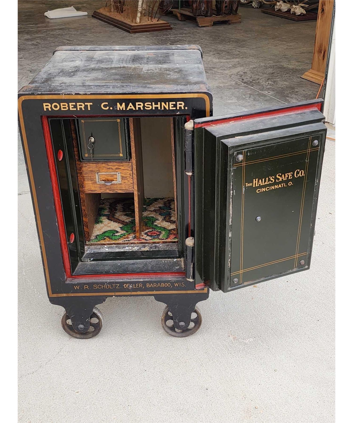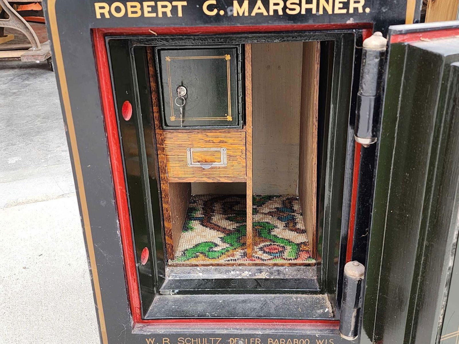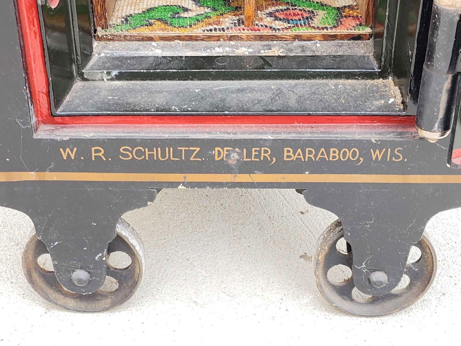 159.1 Awesome condition for its age marked W.R. Schultz Dealer Baraboo Wis. great vintage graphics around 200 lbs we have the combination & it opened on the first try appears to be all original paint overall dimensions about 28" tall x 16" wide x 19" deep