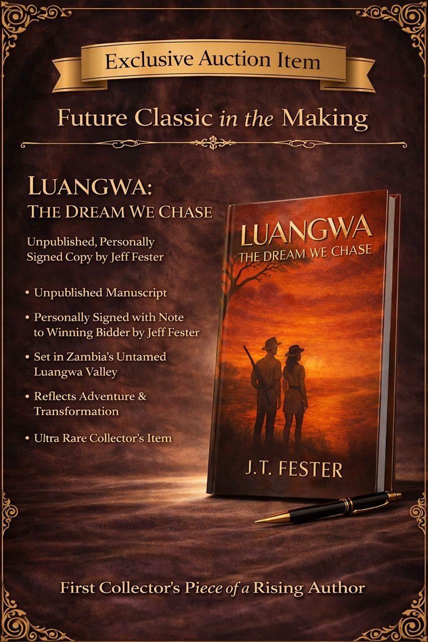 The Zambian Chapter of Safari Club International is honored to offer a rare and meaningful collector’s piece — an unpublished copy of Luangwa: The Dream We Chase, personally signed by Jeff Fester and accompanied by a personal message written specifically to the winning bidder.