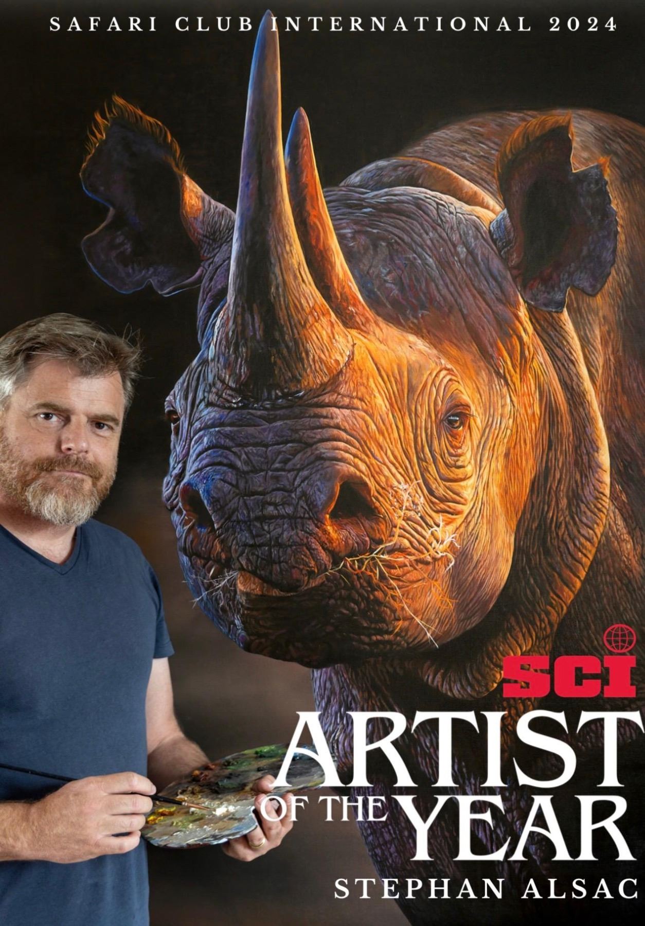 The Zambian Chapter of Safari Club International is proud to present a striking and highly collectible wildlife print: The "Damanius" by Stephen Alsac, who is the SCI Artist of the Year 2024, using chiaroscuro technique, depicting an African Black Rhino.