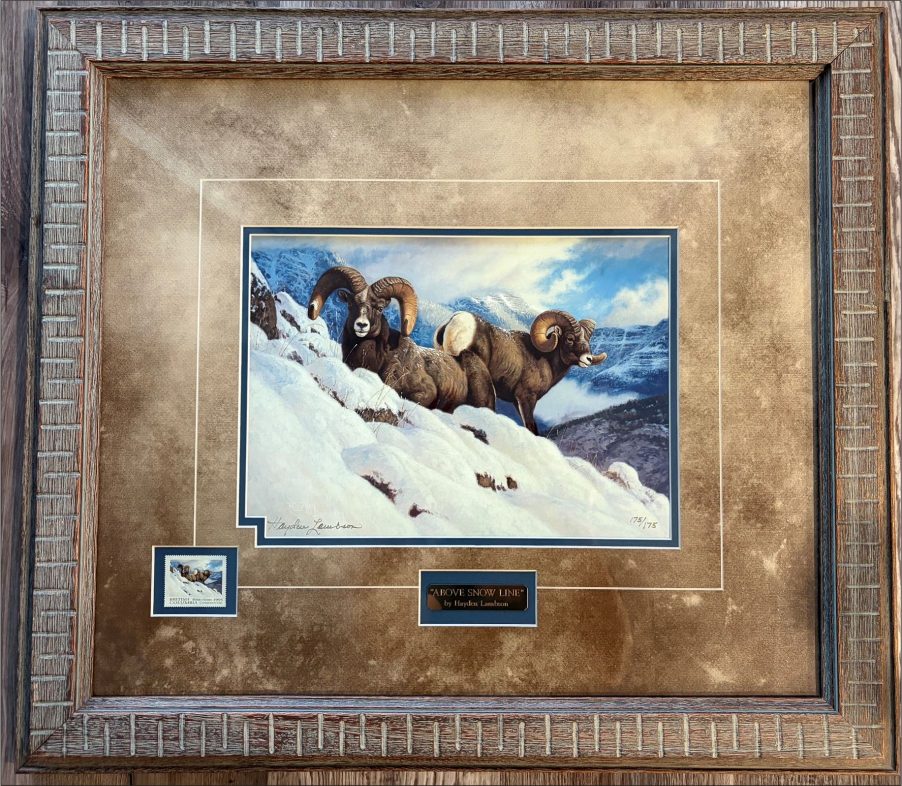 The Hayden Lambson story began on August 27, 1948 in Ramah, New Mexico where Hayden grew up with two older sisters, a dog, and a pesty goat. He is now living in Pocatello, Idaho with his wife Cheryl, where they raised their eight children. In 1970, Hayden graduated from BYU as valedictorian of his college, but had not yet considered a career in art. From there he worked as a career scouter for the Boy Scouts of America for six years, eventually turning his full attention to art in 1976.In 1982 Lambson printed his first print—‘A Big Step’. In 1988 he was selected to be the 1988 Artist of the year for Whitetails Unlimited. He was also the Artist of the Year for the Foundation of North American Wild Sheep in 1990. He was chosen as Artist of the Quarter for the Rocky Mountain Elk Foundation, winter of 1991. In 1992 he was selected as Artist of the Year for Minnesota Deer Hunters Association. Hayden's work can be seen yearly at shows such as FNAWS, Safari Club International, The Rocky Mountain Elk Foundation, and others. Lambson's art work has been featured in art and outdoor magazines such as Art West, Hunters' Quest, Wildlife Art News, Idaho Wildife, Cabela's, New Mexico Wildlife, Alaskan Outdoors, and others. Hayden's work has raised thousands of dollars each year for conservation groups. Other projects include a 6-plate Alaskan series for The Bradford Exchange, Nova Scotia habitat stamp, limited edition prints for Cabela's and the NRA, covers and illustrations for Boon & Crockett Records publication, and over a half dozen stamps and prints for various providences in Canada. Obvious from his enthusiasm for wildlife conservation and his artwork itself is Hayden's love for hunting and the outdoors.