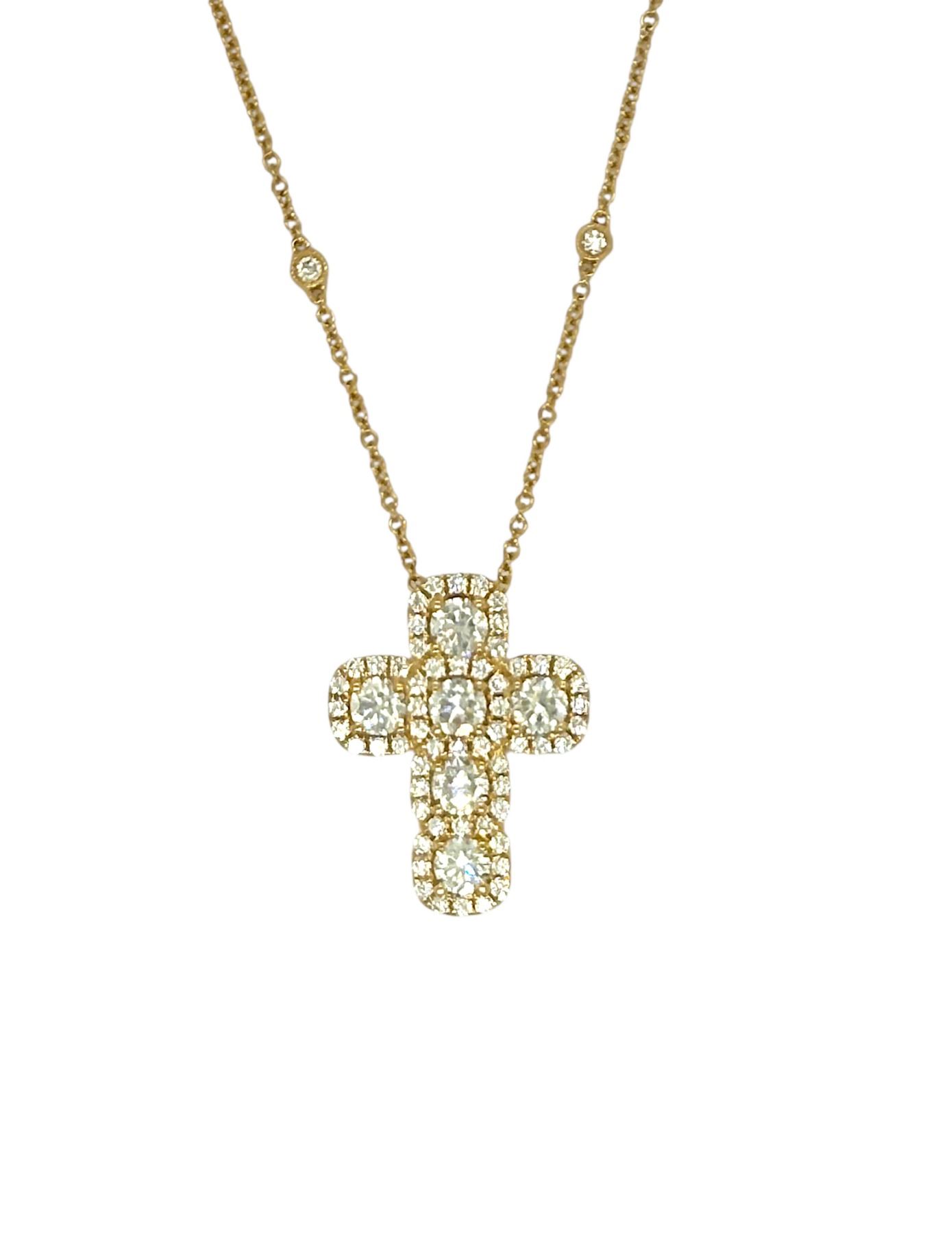 A stunning 18Kt yellow gold diamond cross pendant necklace. Featuring (6) round brilliant diamonds equaling 1.50 cttw. Surrounded by a sparkling halo of additional round brilliant diamonds totaling 0.67 cttw.