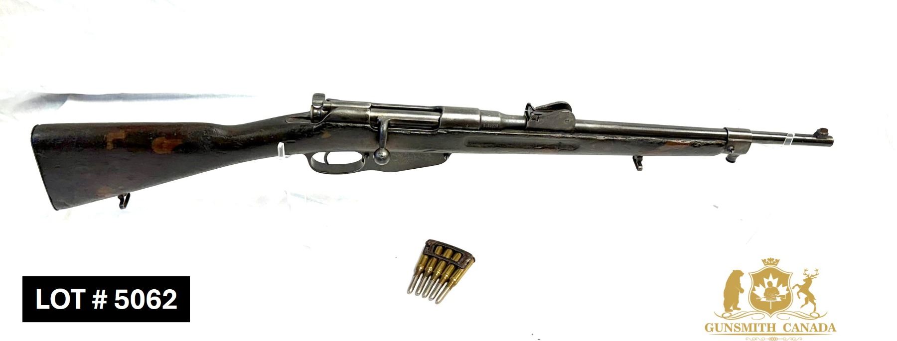 COMES WITH CLIP AND 5 ROUND OF AMMUNITION (FOR SHOW OR COLLECTION, CANNOT VALIDATE CONDITION OR ORIGIN OF AMMUNITION)