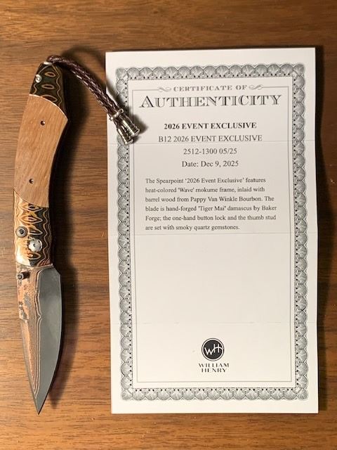 Number 5 of 25 of these exquisite knives were made exclusively for SCI. Each piece is numbered and comes with a certificate of authenticity. The knife features a frame in heat-colored 'Wave Mokume', inlaid with barrel oak used to age Pappy Van Winkle Bourbon. The blade is 'Copper Wave' damascus steel from Baker Forge with a core of VG-5. The one-hand button lock and thumb stud are set with citrine gemstones.