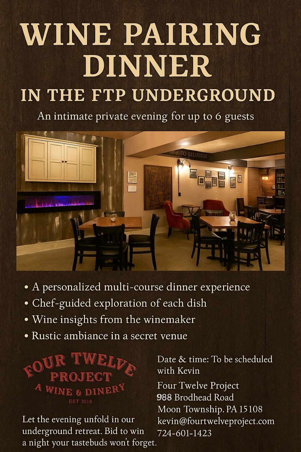 Step into a hidden gem for an unforgettable culinary experience at The Four Twelve Project Underground. This exclusive private evening takes place beneath the renowned Four Twelve Project restaurant in Moon Township, offering an intimate and rustic setting perfect for a memorable night of exceptional food and wine.