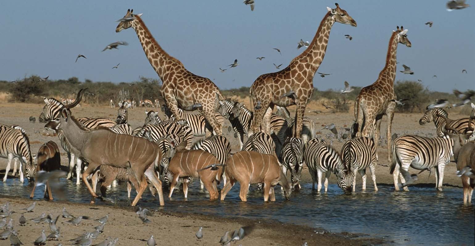Etosha National Park is unique in Africa. The park’s main characteristic is a salt pan so large it can be seen from space. The abundance of game in Etosha National Park is somewhat unexpected, showcasing some of the most common and rarest wildlife species. The areas with thicker vegetation are home to elephants (some of the largest in Africa due to the vitamins and nutrients found in the ground), the endangered black rhino and even leopard. Lions are camouflaged in the pale- golden color of the grasslands, while giraffes rise- high above most of the dry vegetation.