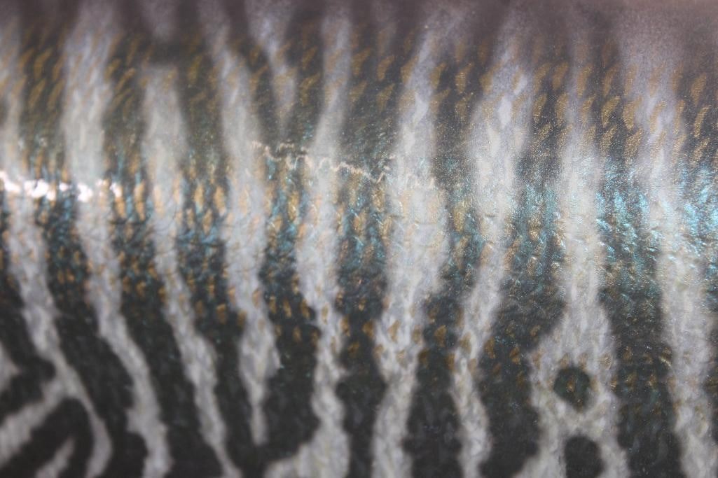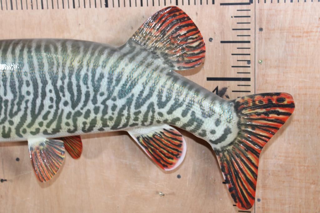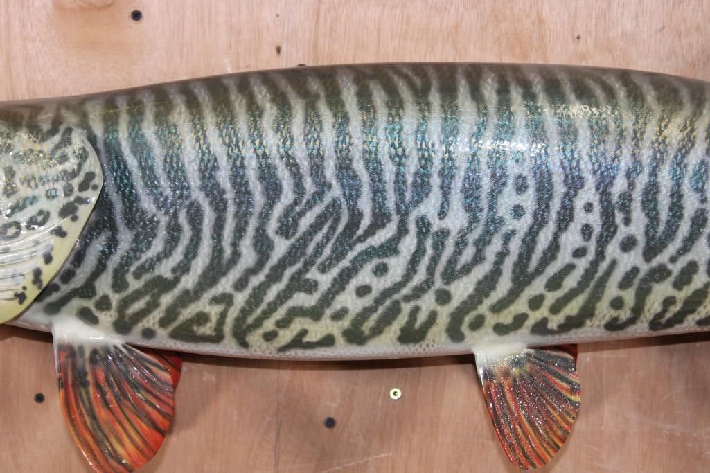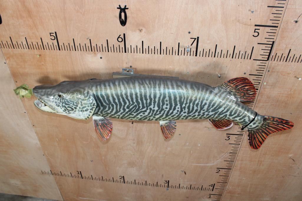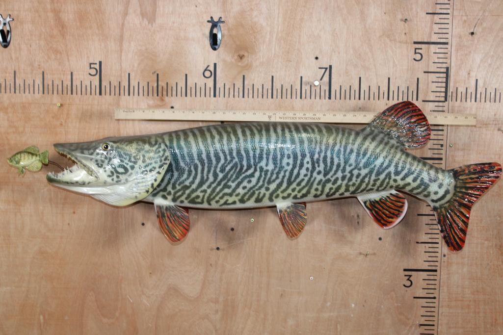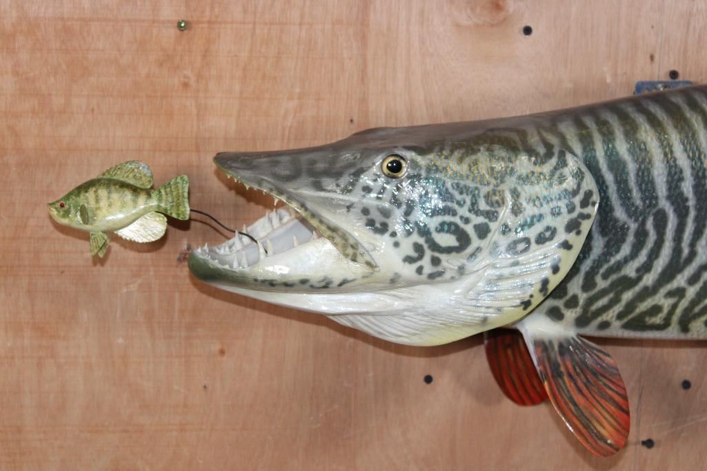 Incredibly Nice Reproduction XL TIGER MUSKY Fish Mount. It measures 44" Long and looks very realistic. He is chasing a Hand-carved Wood Crappie with an awesome paint job and the artist's initials (on the bottom). These are in Very Good Condition. TAXIDERMY FISH