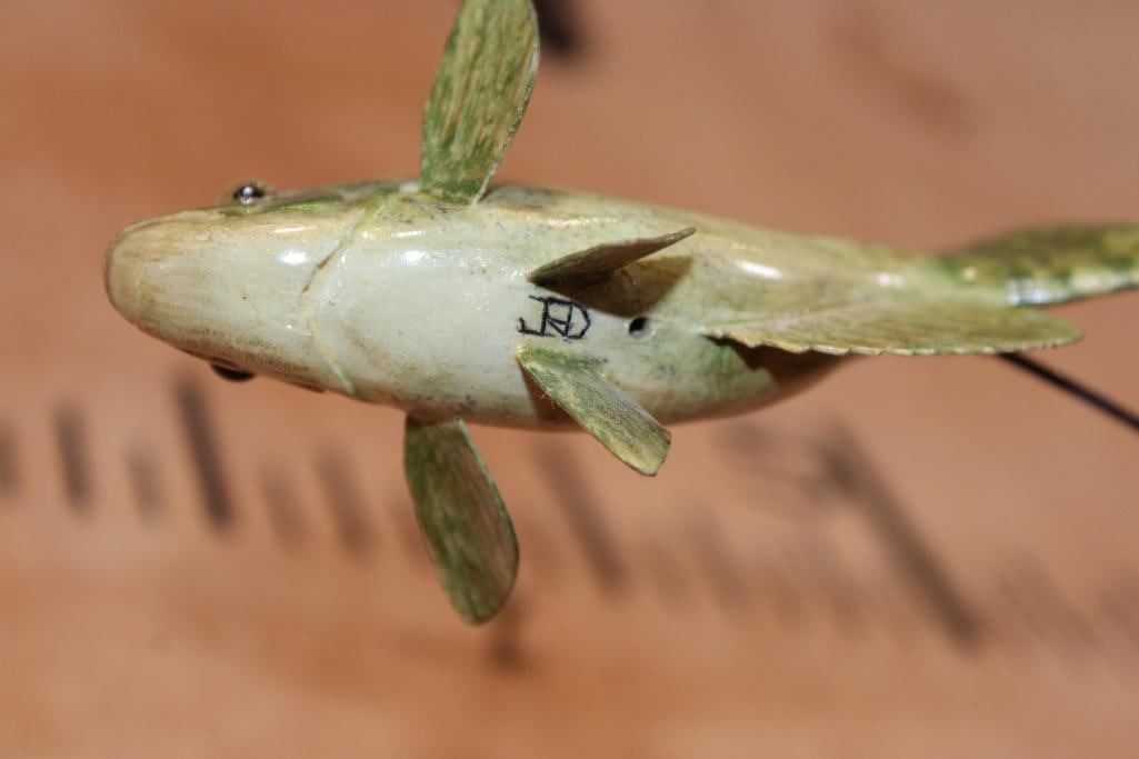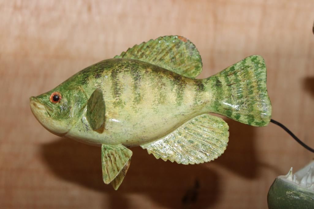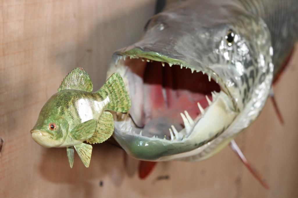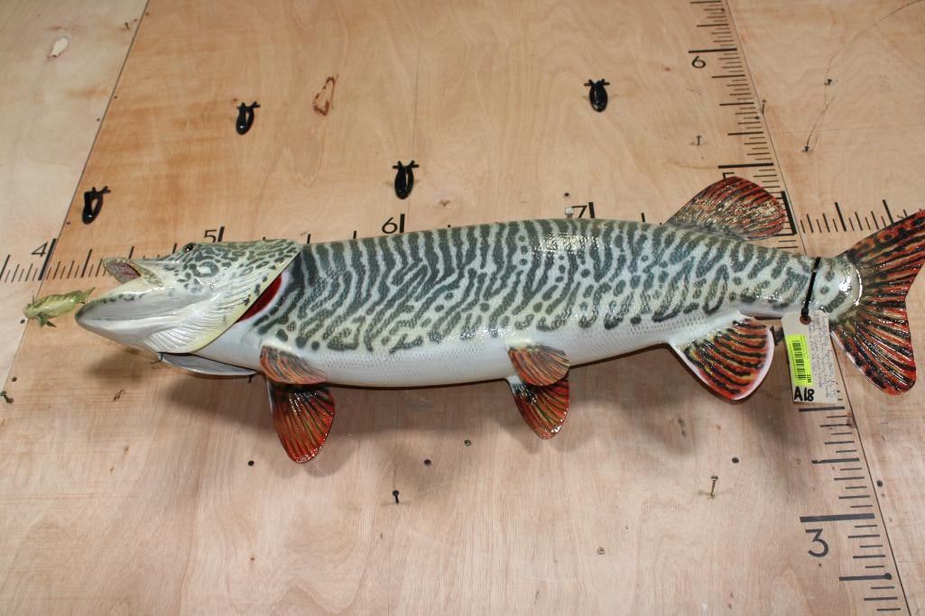 Lot 108 Reproduction XL TIGER MUSKY Fish Chasing a Hand-carved Wood Crappie