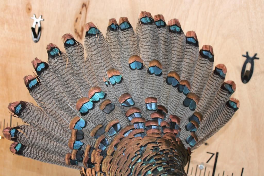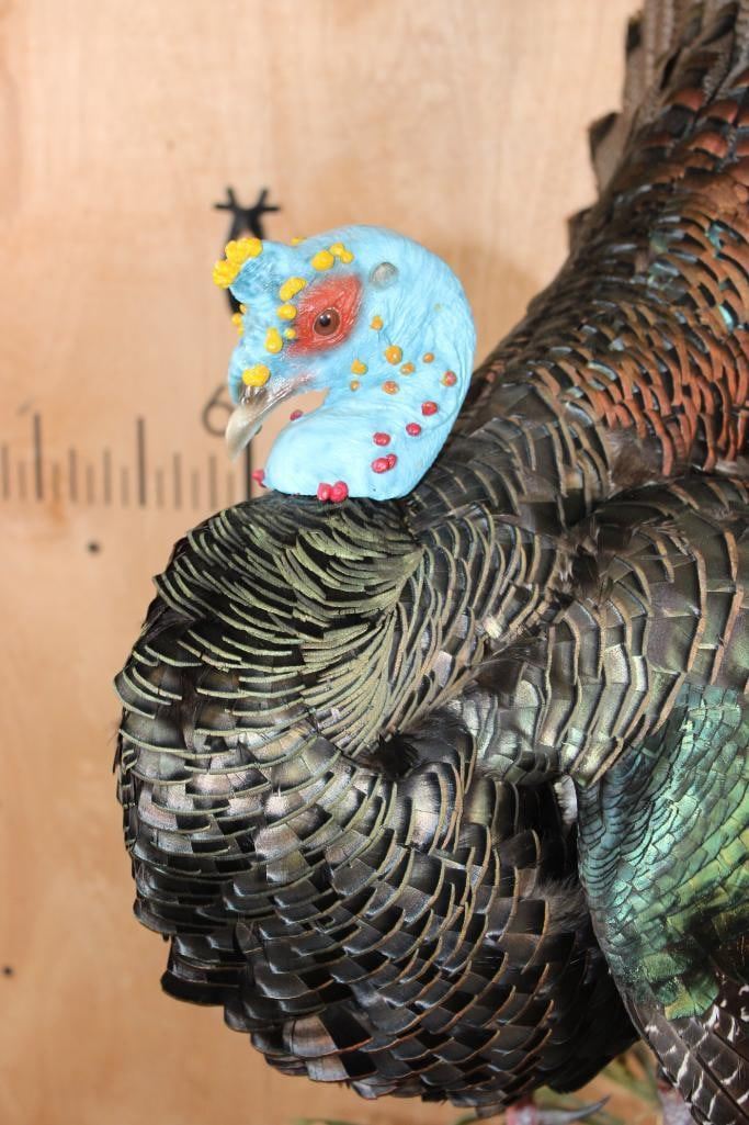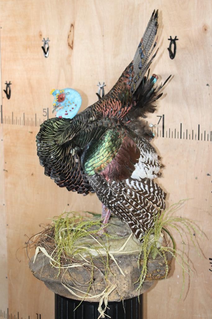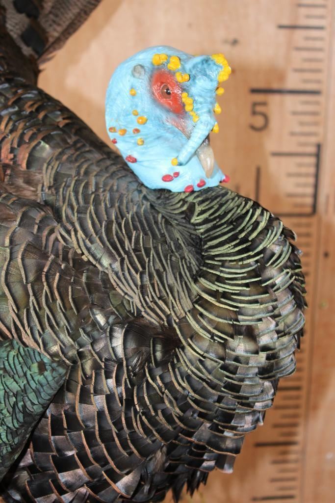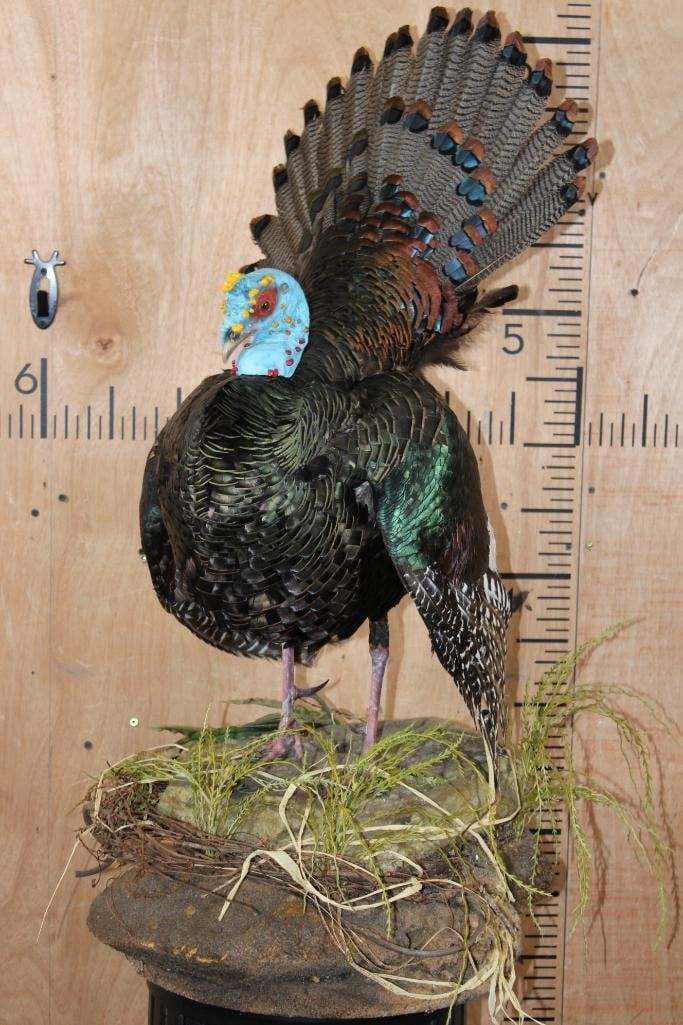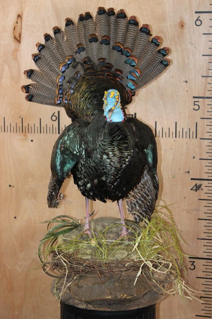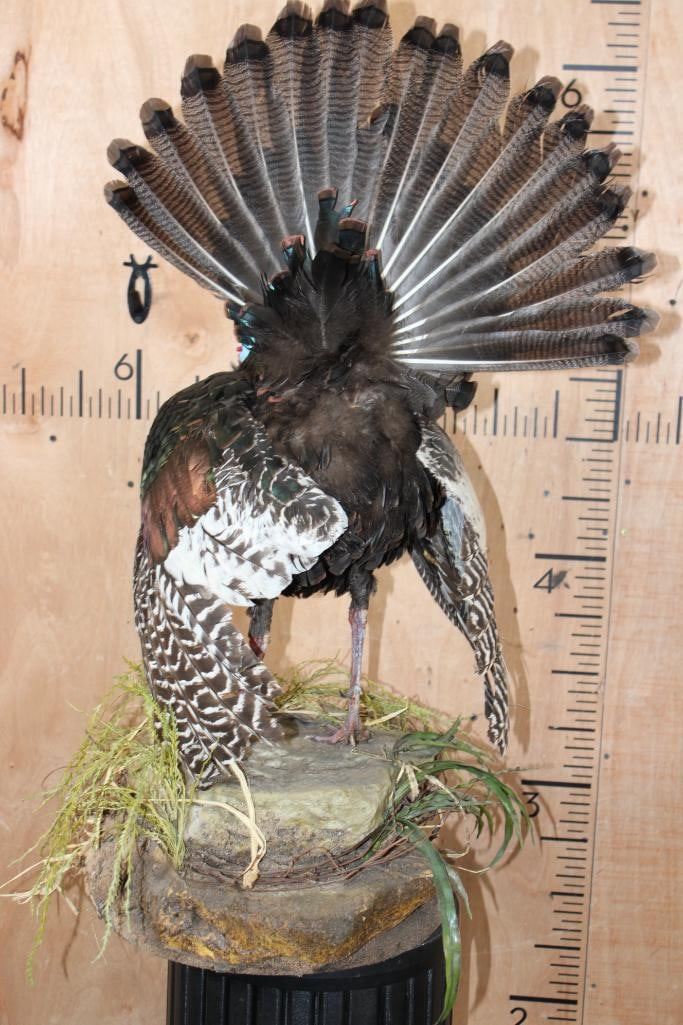 Very Nice, Clean, and Newer Life-sized OSCILLATED TURKEY. It is mounted on a decorative Lightweight Foam Base. The Total Mount measures 23" Long x 17" Wide x 36" Tall. It is in Very Good Condition other than 1 feather on the right wing. TAXIDERMY