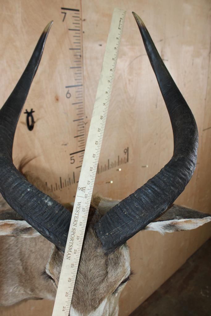 Nice MOUNTAIN NYALA Shoulder Mount. The Left Horn measures 26 3/8" Long and the Right Horn measures 26.25" Long. It is in Good Condition. TAXIDERMY