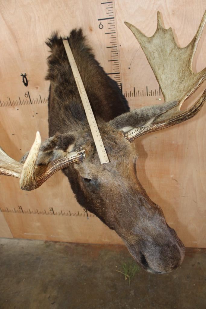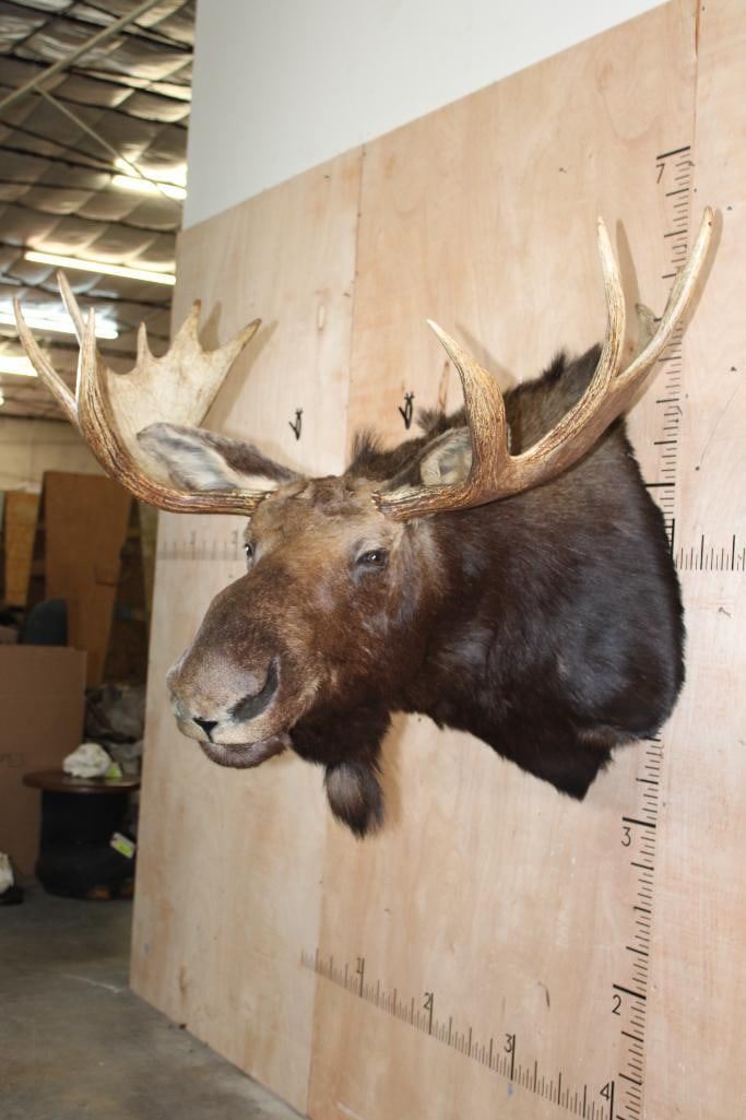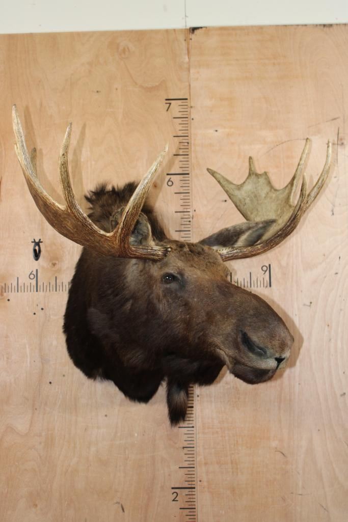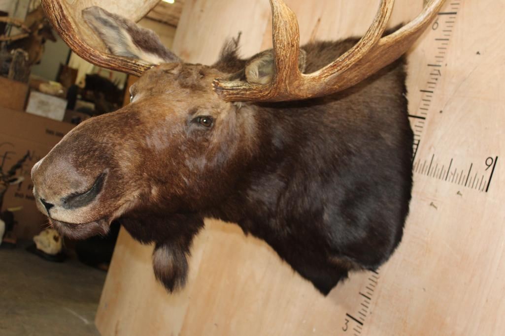 Very Nice and Clean 12-Point SHIRAS MOOSE Shoulder Mount. It has a 44" Spread and is in Very Good Condition. The Shiras Moose or "Wyoming Moose" is the smallest of the four North American moose subspecies, typically weighing 507-1,080 lbs and standing about 6' Tall at the shoulder. TAXIDERMY