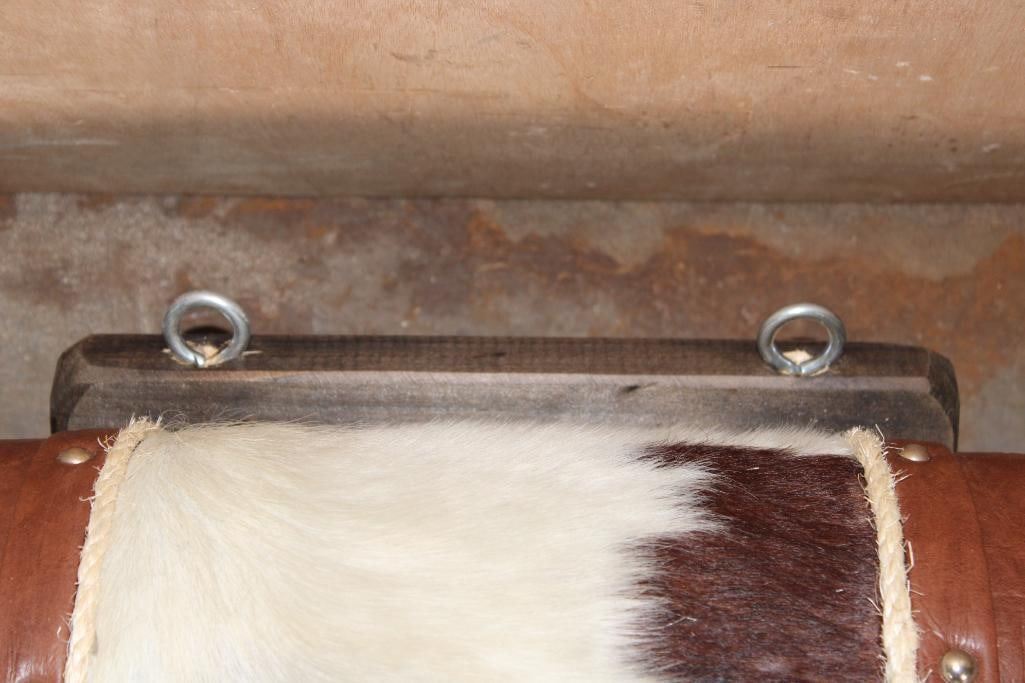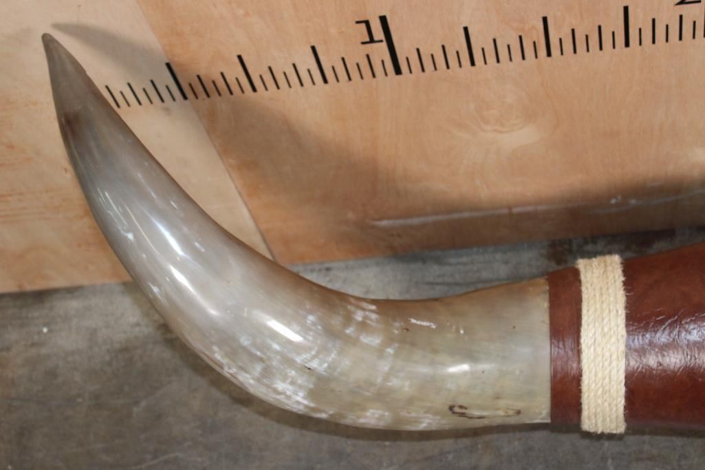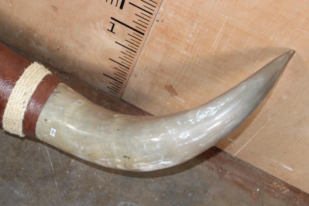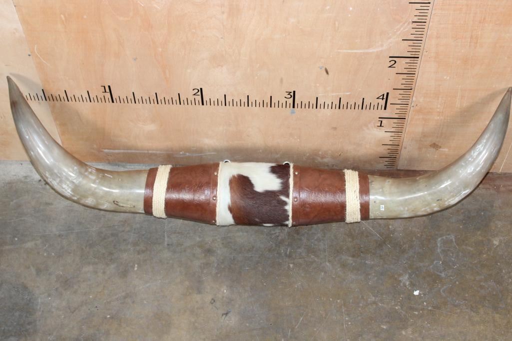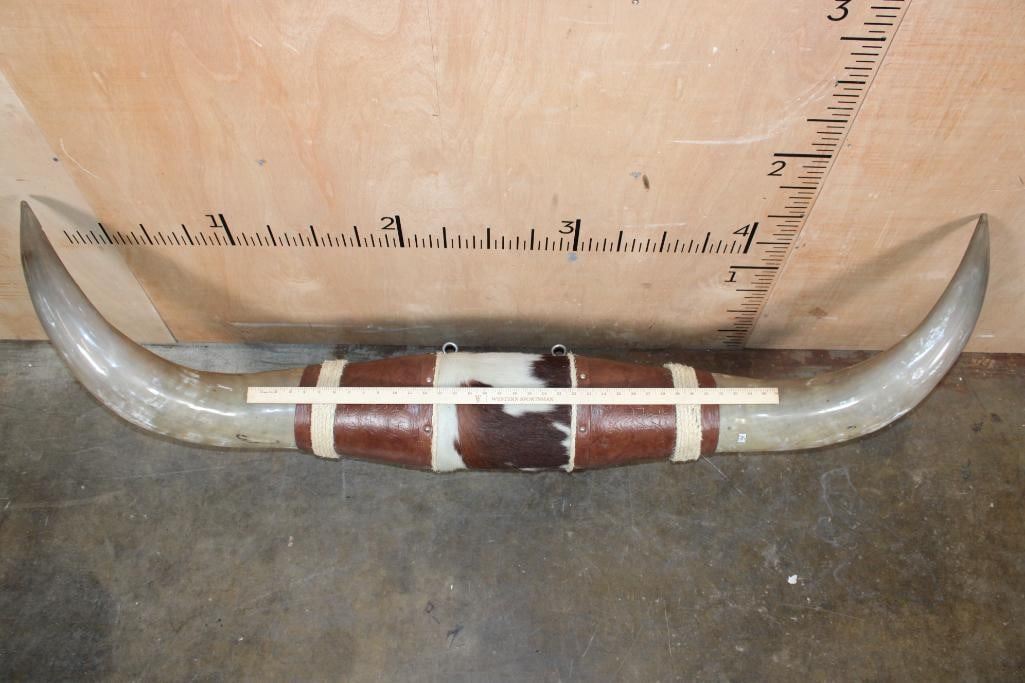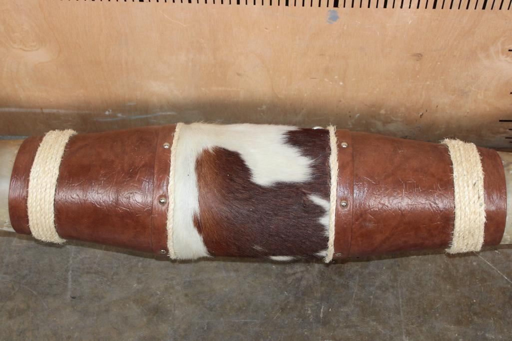 Lot 261 Massive Mounted WATUSI LONGHORN Cross Horns wrapped with Brown and White Cowhide and Tooled Leather