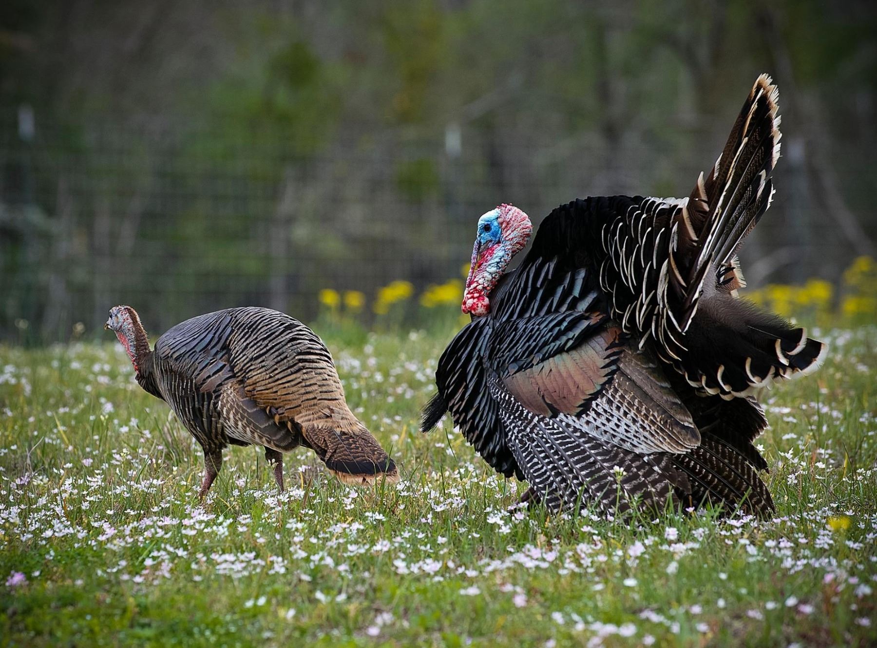 Rio Grande Turkeys stand around four feet tall, with long legs and a striking green-coppery sheen. Their tail feather tips range from pale yellow brown to light tan, and mature toms can weigh up to 20 pounds. Hens and jakes are smaller and duller in color, but no less impressive in the wild.
