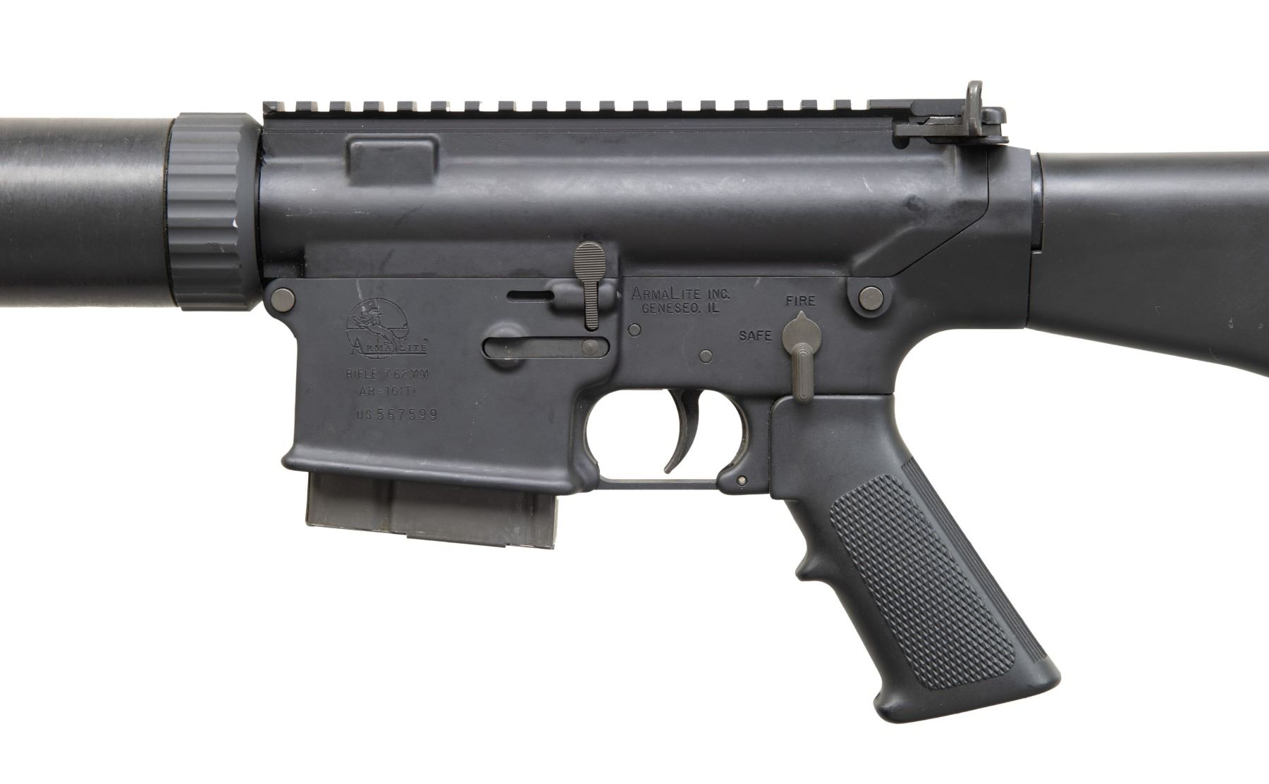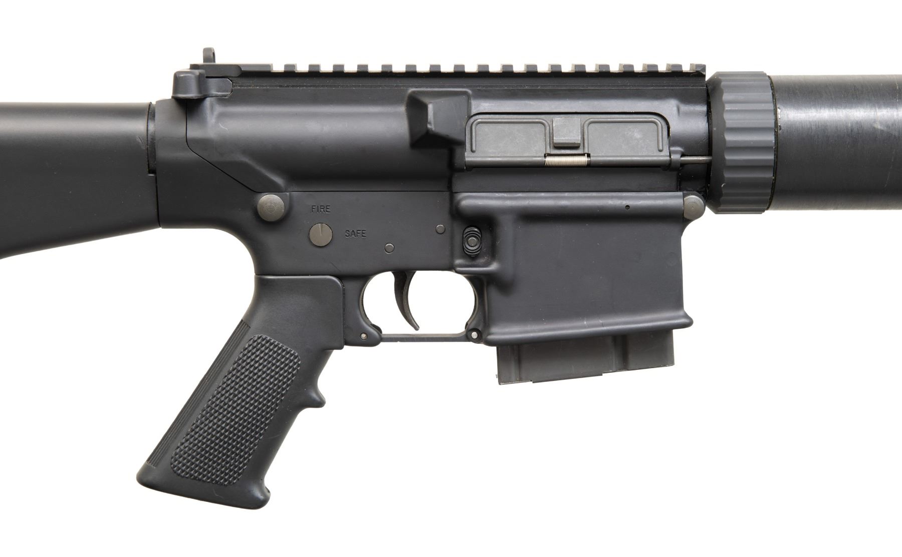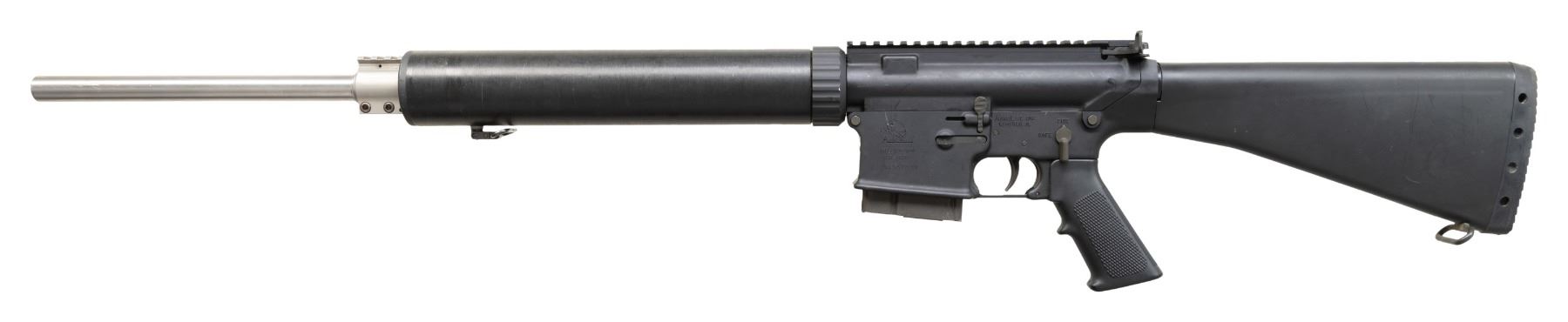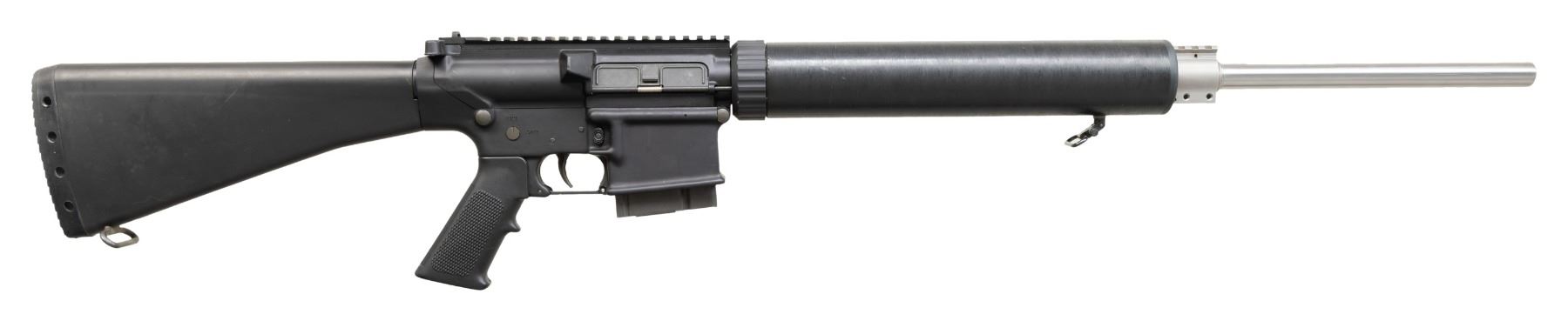 Cal. 7.62x51mm. S# US567599. Bbl. 24". Stainless steel heavy barrel. Low profile gas block w/ Picatinny rail. Smooth, round 12" handguard. Flat top upper receiver w, brass deflector. Fixed rifle stock w/ rubber recoil pad. Sling swivels front & rear. MAGS: 1 rd. CONDITION: matte black finish on all exposed aluminum surfaces enjoys complete coverage w/ only a few drag lines to illustrate prior use. Bore is bright w/ strong rifling. Fire control mechanism appears to function correctly when cycled by hand. (25-5094/JZ). MODERN. $800-1,200.