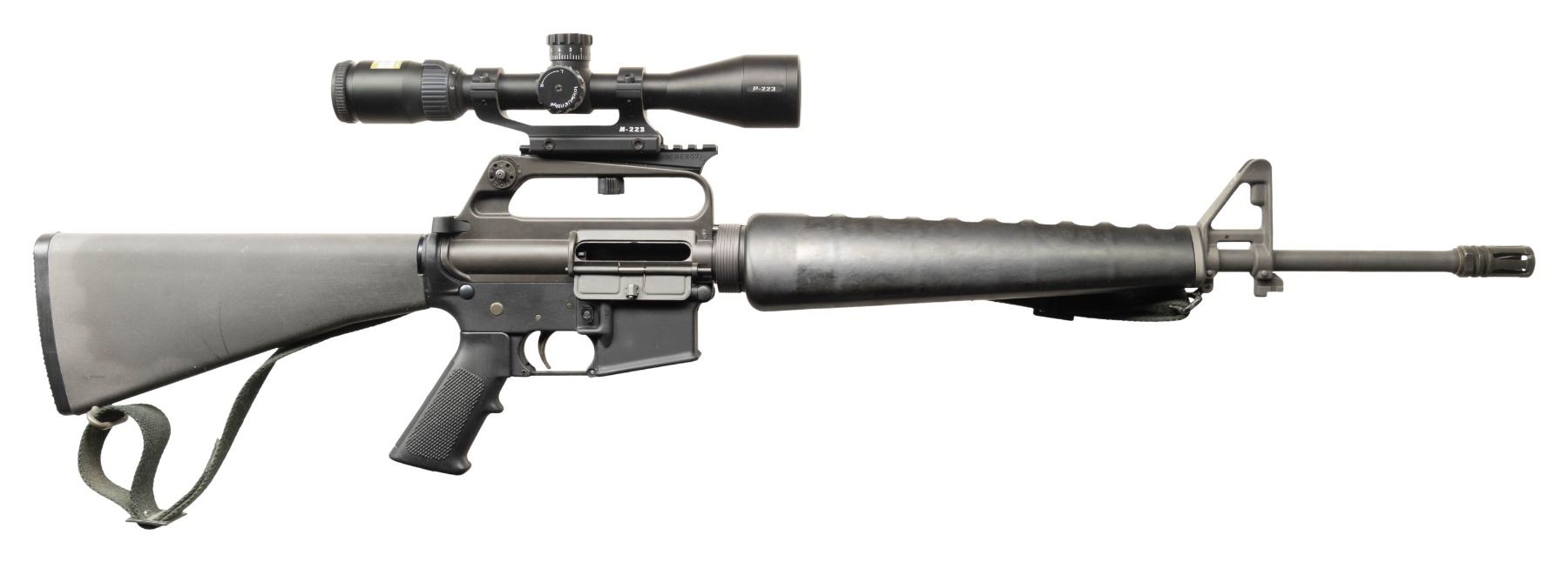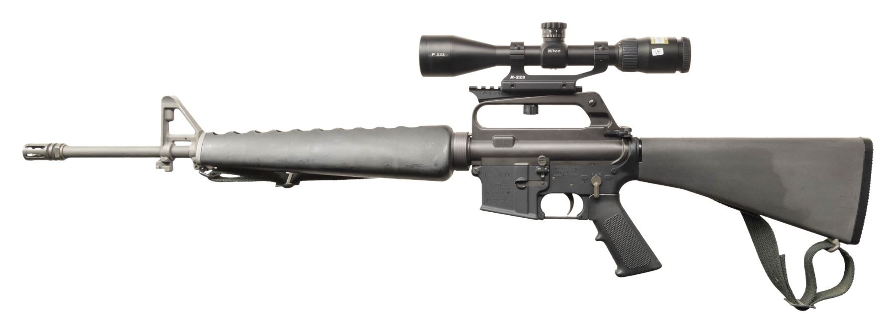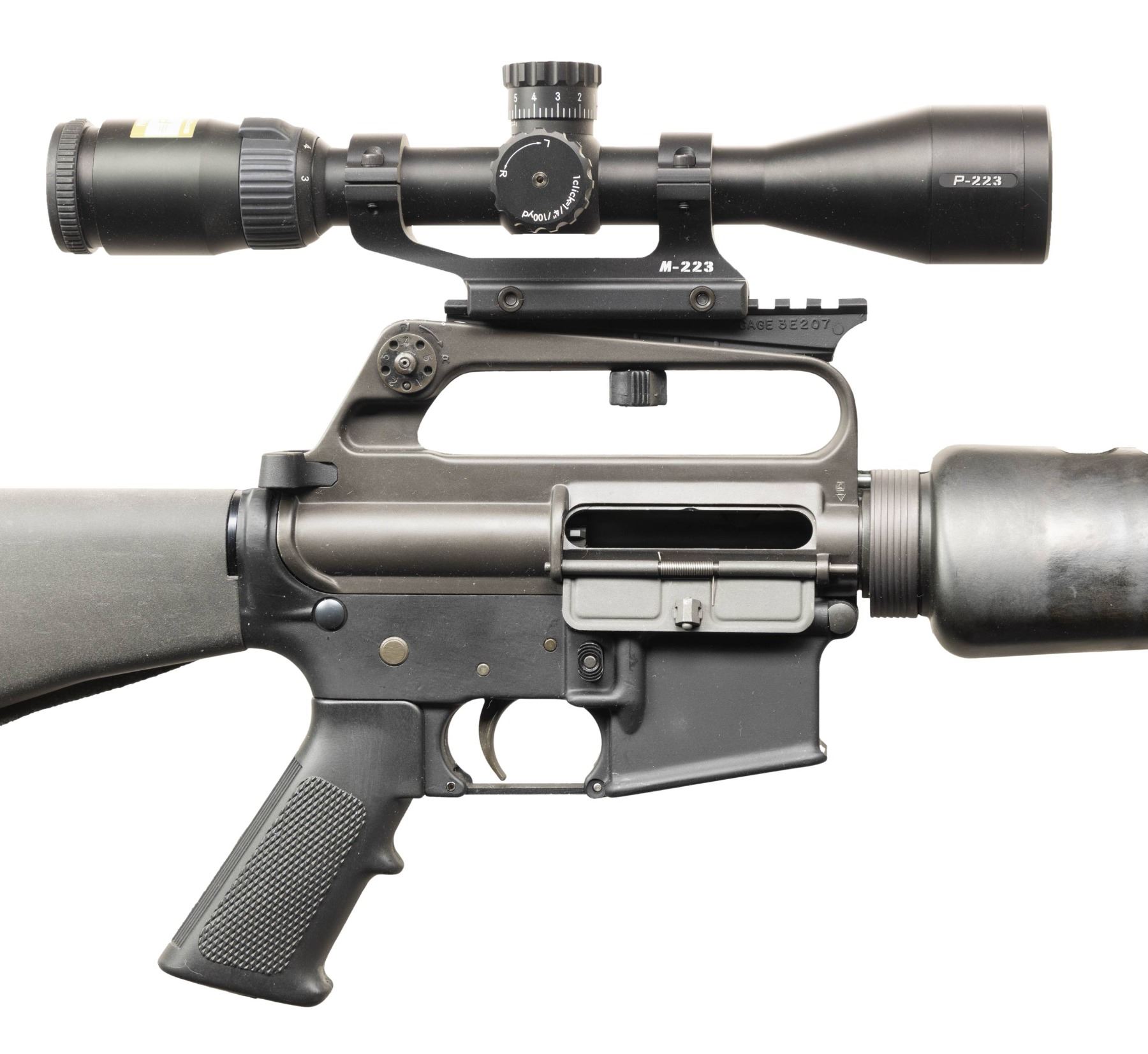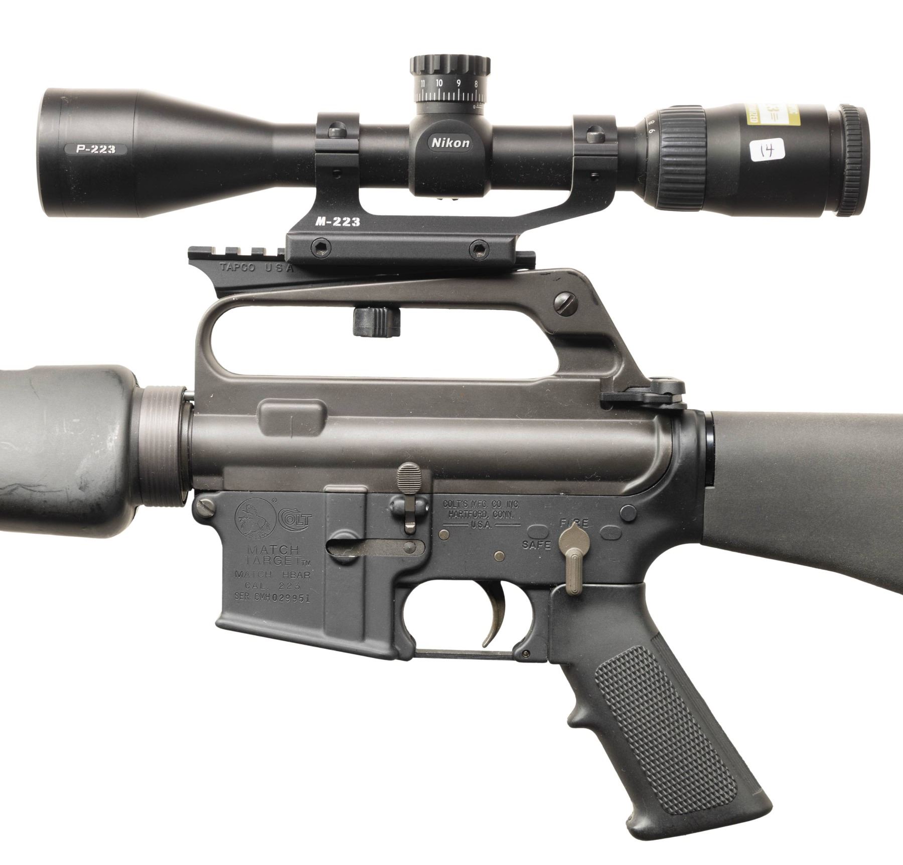 RECEIVER. Cal. 223. S# CMH029951. Bbl.20". Pencil barrel terminated w/ A1 flash hider. Protected post front sight / gas block / bayonet lug. Triangular beavertail handguards retained w/ strait delta ring. Carry handle upper receiver w/ no brass deflector or forward assist. Currently sporting Tapco mount w/ 3x9 Nikon P223 scope. SP1 profile bolt carrier. Full length shoulder stock w/ trap door. Black nylon sling. CONDITION: Though finish does not match well between upper & lower receivers, all external indications demonstrate low use and/or proper care. Glass is clear w/ sharp reticle. Fire control mechanism appears to function correctly when cycled by hand. PROVENANCE: Estate Collection of John "Jack" Dhooghe. (25-5507/JZ). MODERN. $600-900.