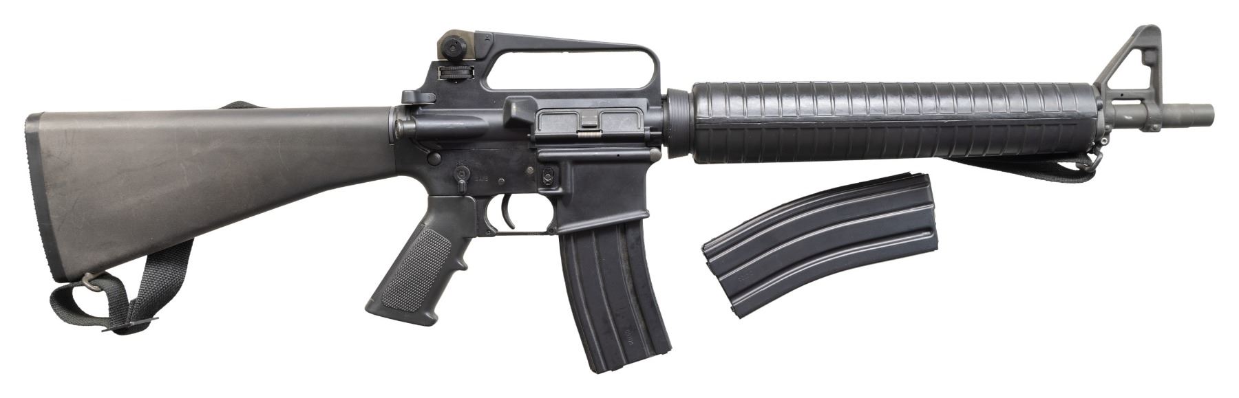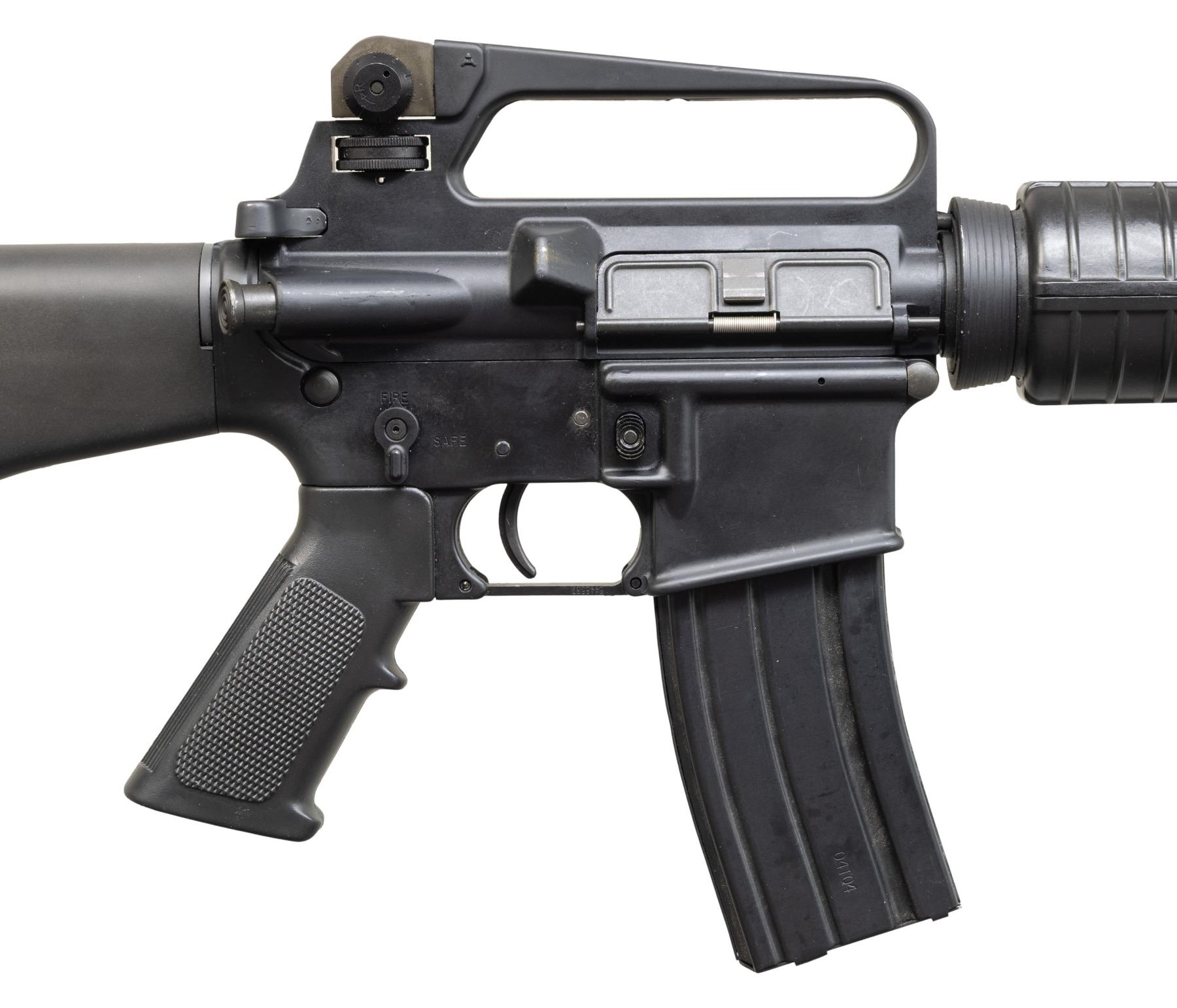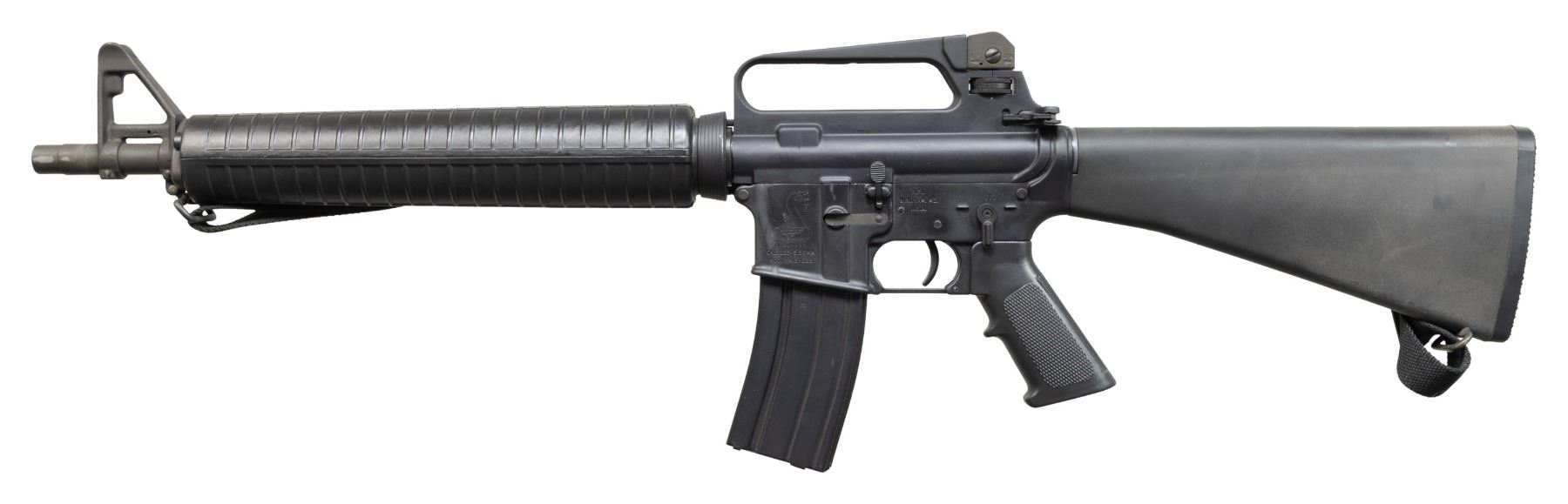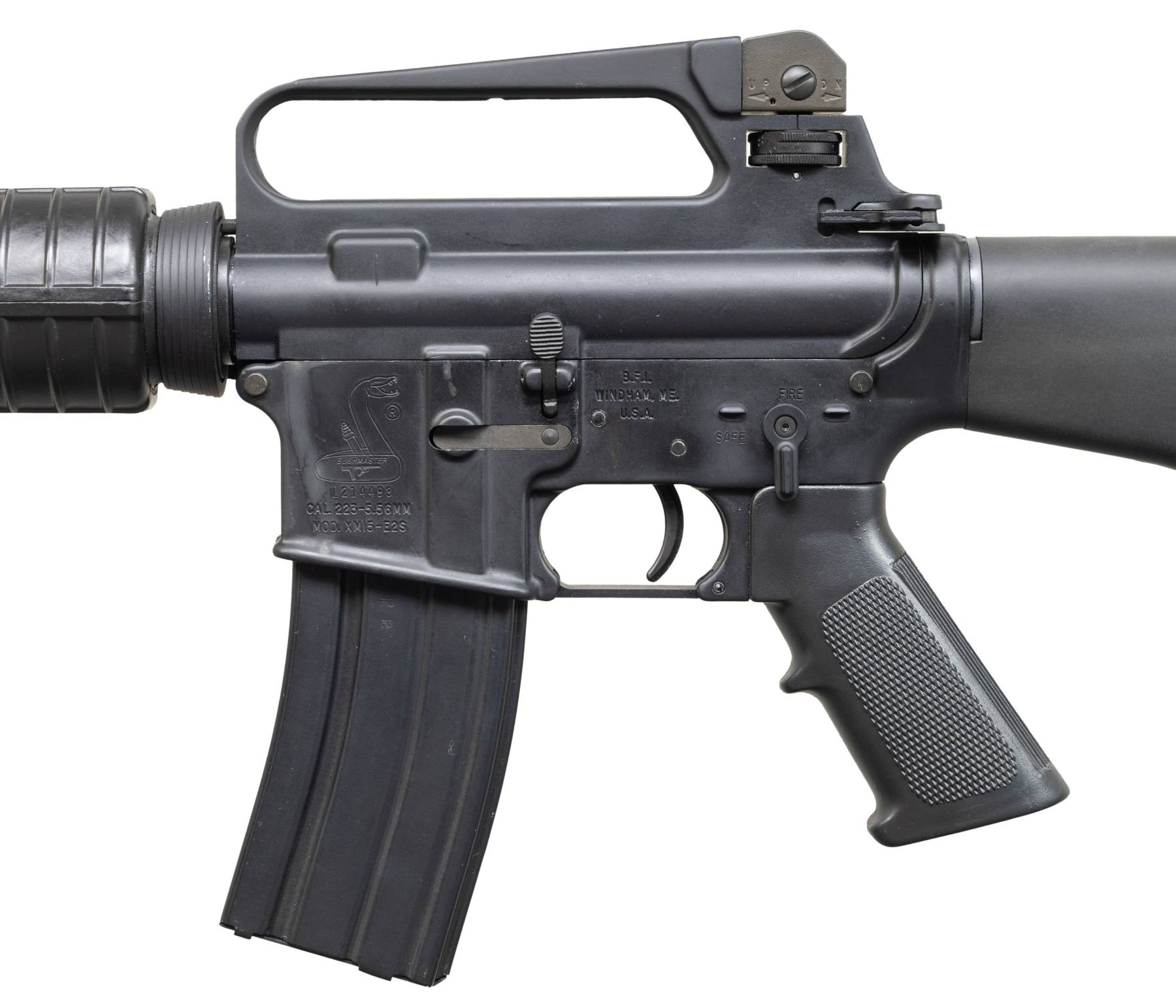 CARBINE WITH BINARY STYLE TRIGGER. Cal. 5.56mm. S# L214493. Bbl. 26". A Windham, Maine manufactured B.F.I. Black Rifle in the popular "Dissipator" configuration. Threadless muzzle. Protected post front sight / gas block w/ no bayonet lug. Rifle length A2 style handguards retained w/ tapered delta ring. Carry handle upper receiver w/ adjustable, dual aperture rear peep sight, round forward assist & brass deflector. SP1 style bolt carrier. Binary style trigger system, which fires upon pull, and again upon release. Full length shoulder stock w/ trap door. Sling swivels, front & rear, currently sporting black nylon sling. MAGS: 2 aluminum 30 rd. CONDITION: exterior finish complete & consistent w/ only some gentle rack wear, such as thinning on high spots or in areas of mechanical intervention. Bore is bright w/ strong rifling. Fire control mechanism appears to function correctly when cycled by hand. We are unable to ship a Binary or Echo Triggers to CA, CT, DC, FL, HI, IA, MD, NJ, NY, RI, and WA (25-4802/JZ). MODERN. $500-800.