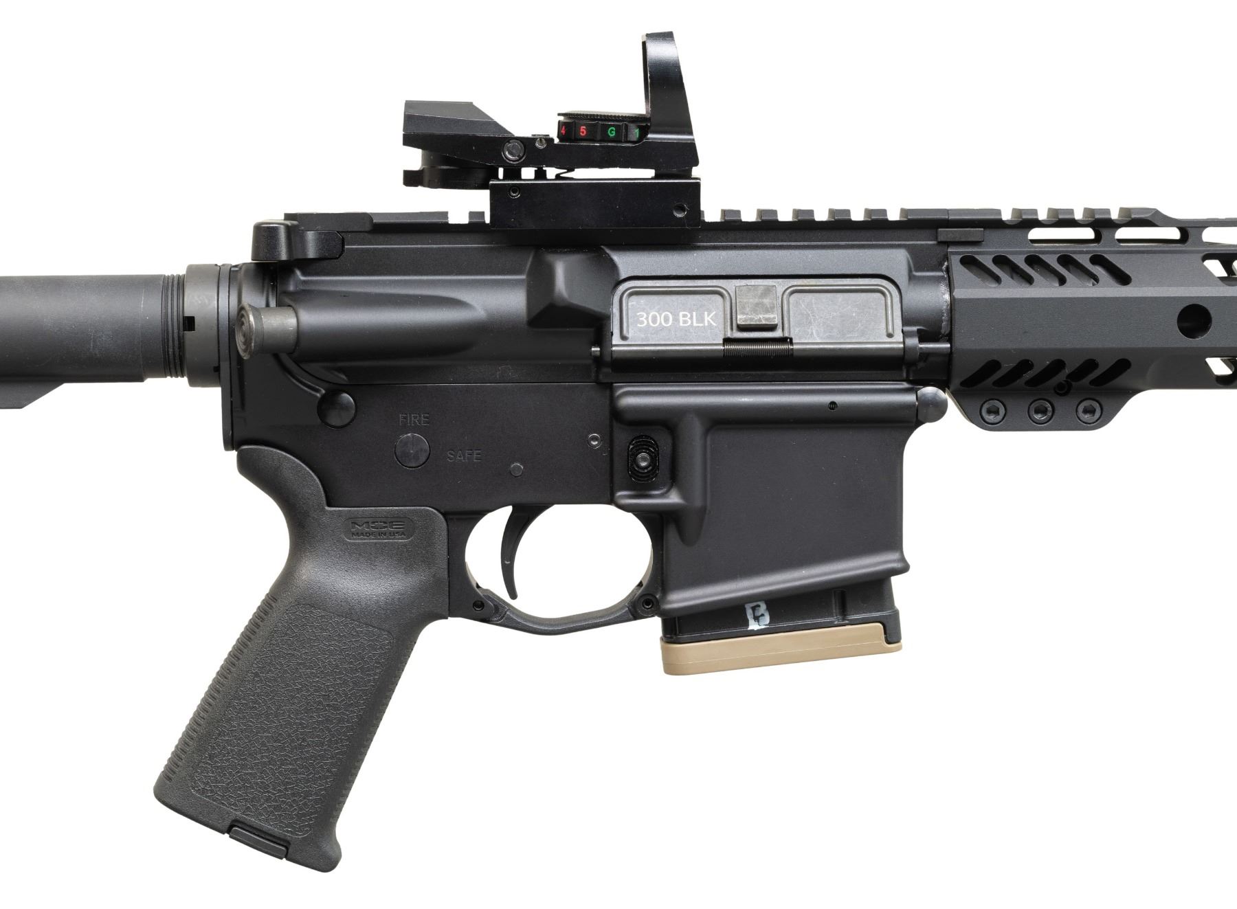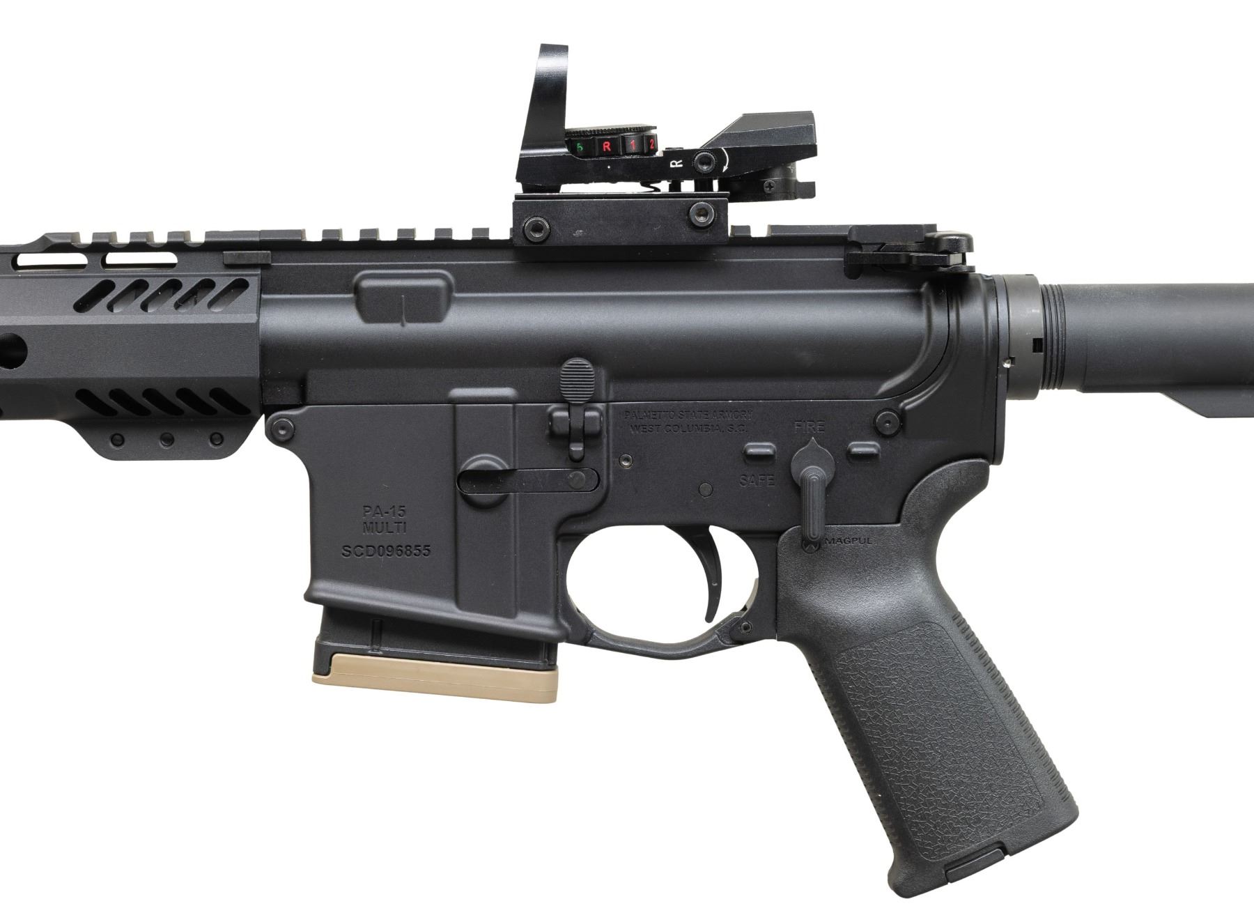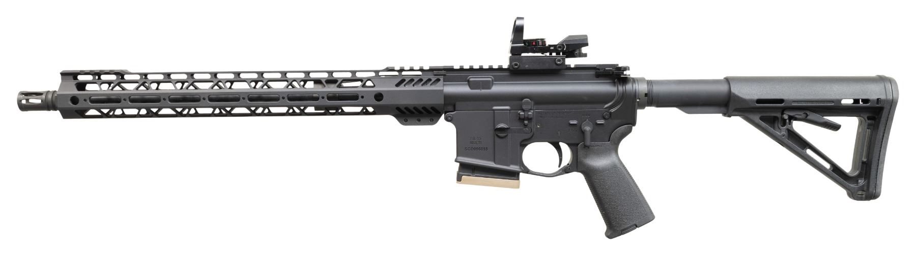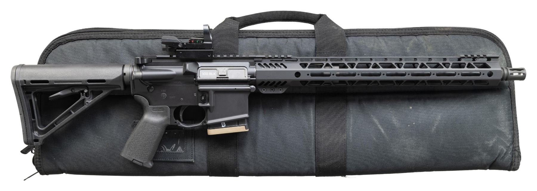 Cal. 300 AAC Blackout. S# SCD096855. Bbl.16". 1:8 300 Blackout barrel terminated w/ A2 style flash hider. Low profile gas block below 15.5" free floating Palmetto handguard. Pistol length gas tube. Flat top upper receiver w/ round forward assist & brass deflector. M16 profile bolt carrier. Currently sporting unmarked electronic sight w/ red & green reticle. Magpul MOE pistol grip. 6 position carbine buffer tube w/ Magpul MOE shoulder stock. UNATTACHED ACCESSORIES: Black nylon transport case. CONDITION: All aspects indicate very little prior use. Finish complete & consistent. Sight glass clear & appears to function properly. Bright bore w/ strong rifling. Fire control mechanism appears to function correctly when cycled by hand. (25-6101/JZ). MODERN. $500-900.